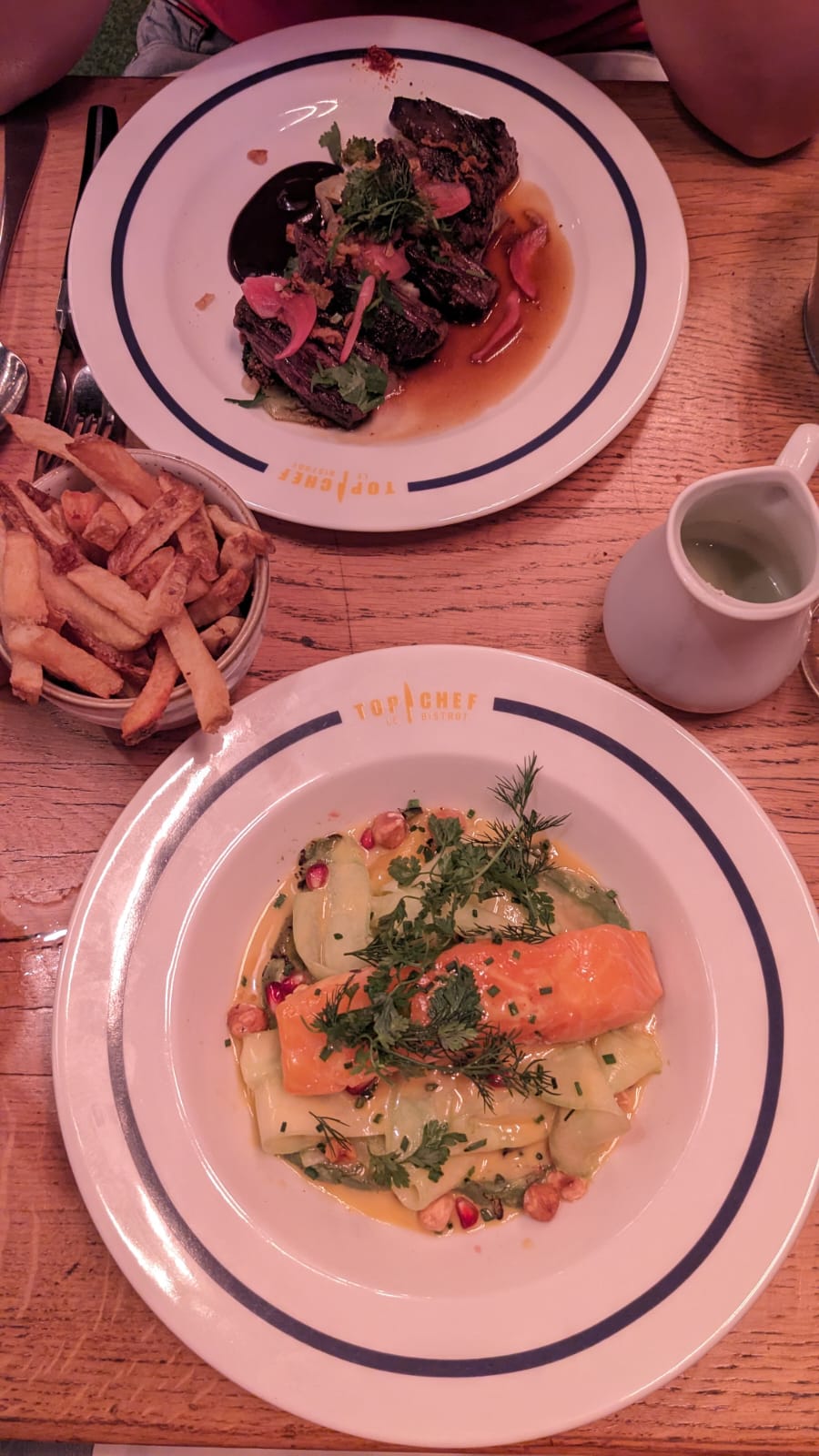 Très belle découverte que ce Bistrot Top Chef. Cadre très sympa, les séparations entre les espaces permettent de ne pas donner l’impression de trop grand et limite (un peu) le bruit. Côté nourriture, franchement bluffés ! C’est fin, c’est goûteux et c’est gourmand. Nous reviendrons bientôt!! En plus le staff était super sympa!!