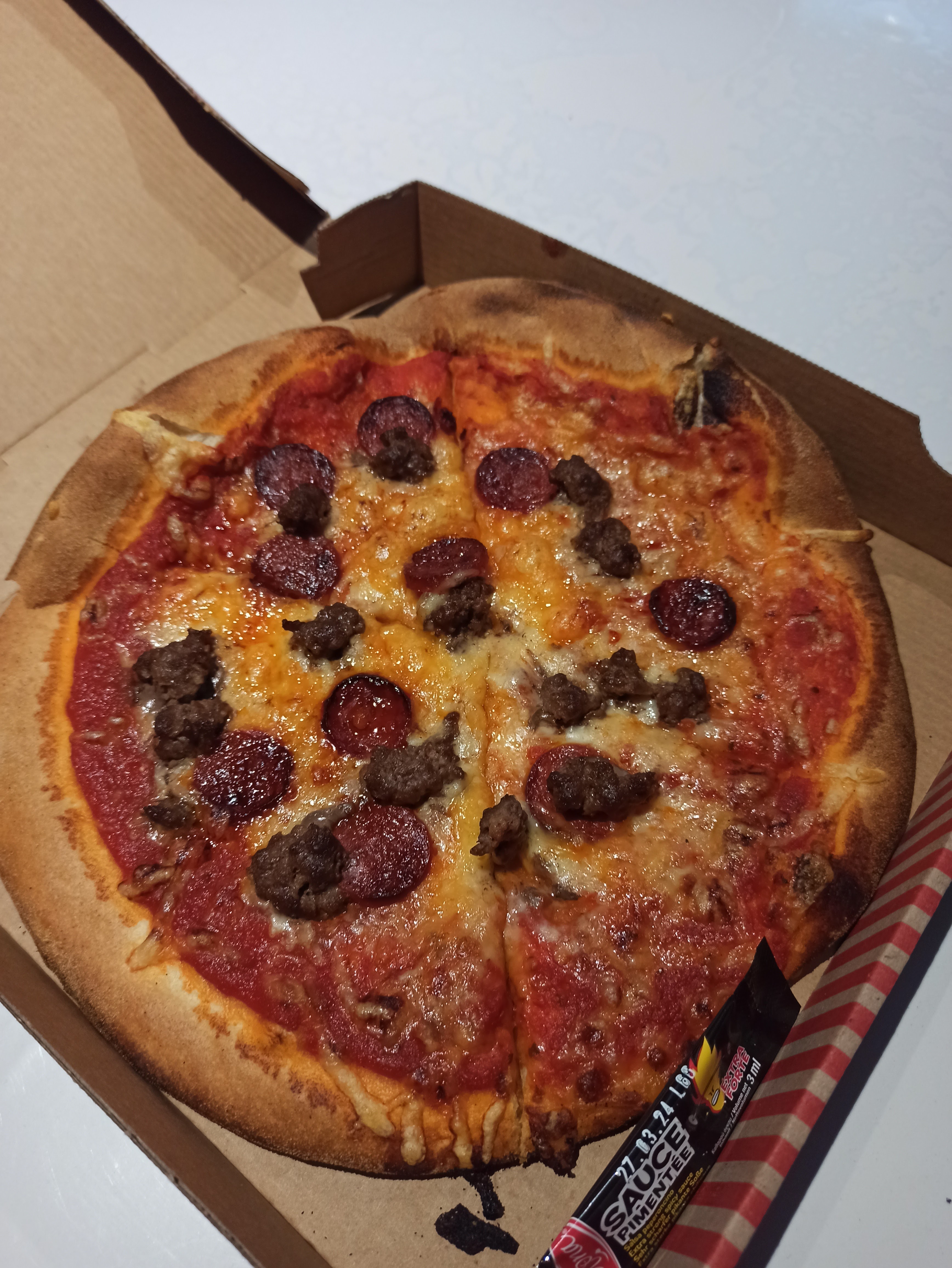 Repas très appréciable. Les pizzas sont de très bonne qualité pour un prix très abordable. La livraison a été super, le livreur aux cheveux bouclés fut très professionnel et attentif à notre demande. Je le remercie pour sa bonne humeur !