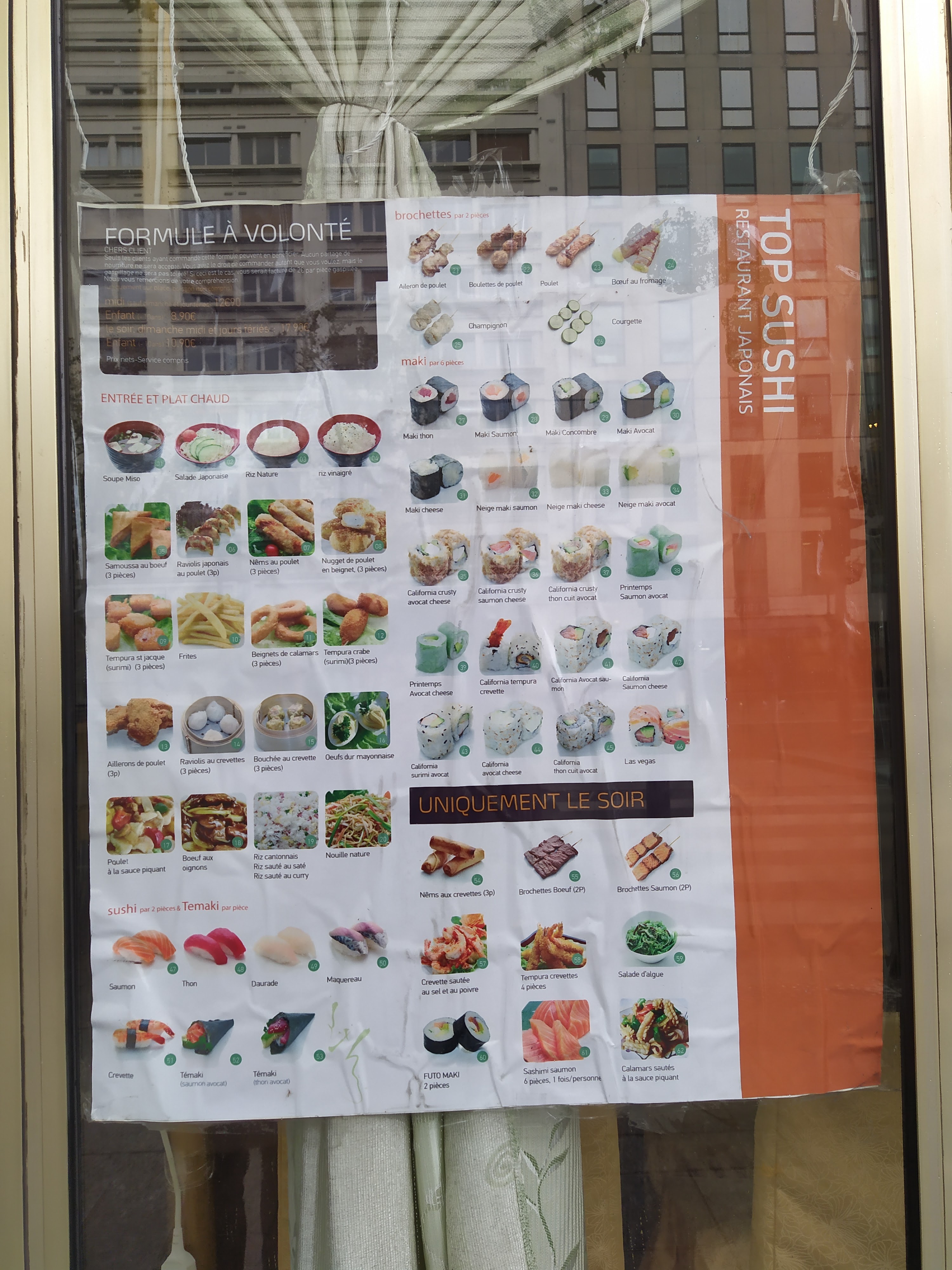 Service à volonté à table à 12€ 90 le mid même le samedi vraiment pas cher, mais déçu par les brochettes yakitori ainsi que les sushis beaucoup trop de riz je pense que c'est plus un chinois qu'un vrais japonais