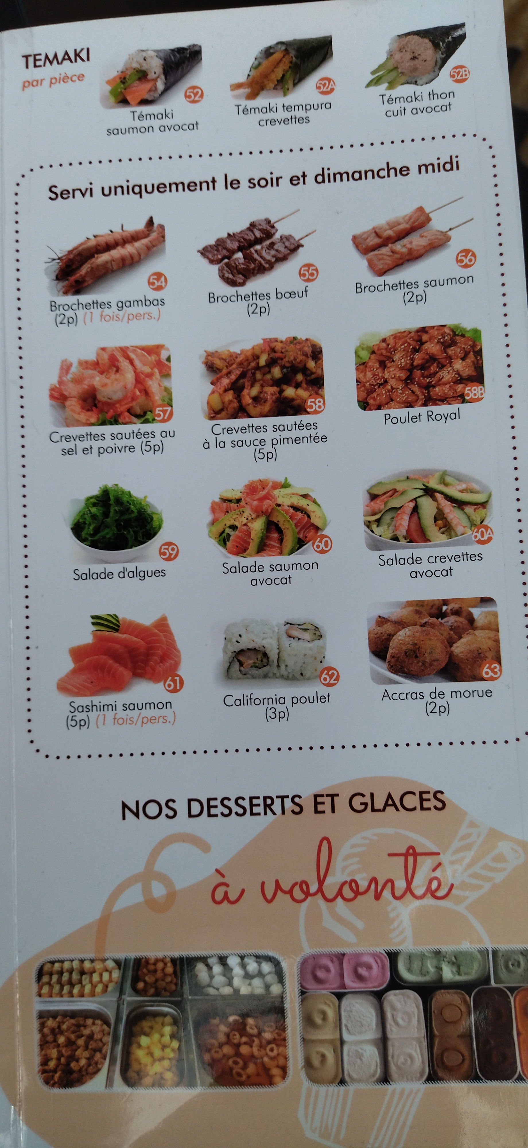 Super restaurant japonais à volonté, tout y est très bon, les serveurs au top et maintenant en plus, il y a les desserts à volonté: perles coco, nougats chinois, salade de fruits et même une dizaine de parfums de glaces!