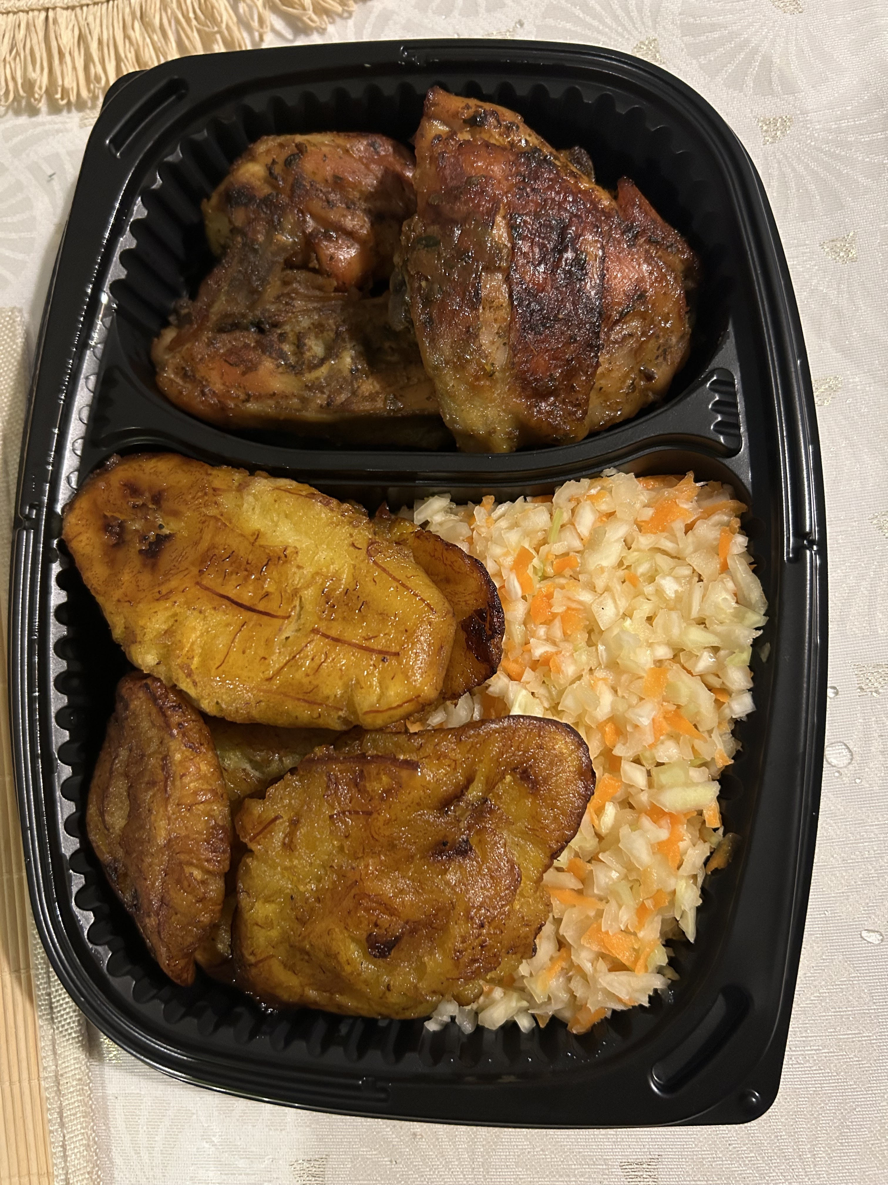 Je fais un retour suite à une commande passée chez TOP TOP FOOD ORLEANS. J’ai commandé deux bananes pesées et dans l’ensemble c’était plutôt bien. Le poulet était délicieux et les bananes aussi. Le seul petit point négatif c’était le pikliz qui était très vinaigré… J’ai pris également un jus de fruit de la passion qui était vraiment très bon! Je recommande
