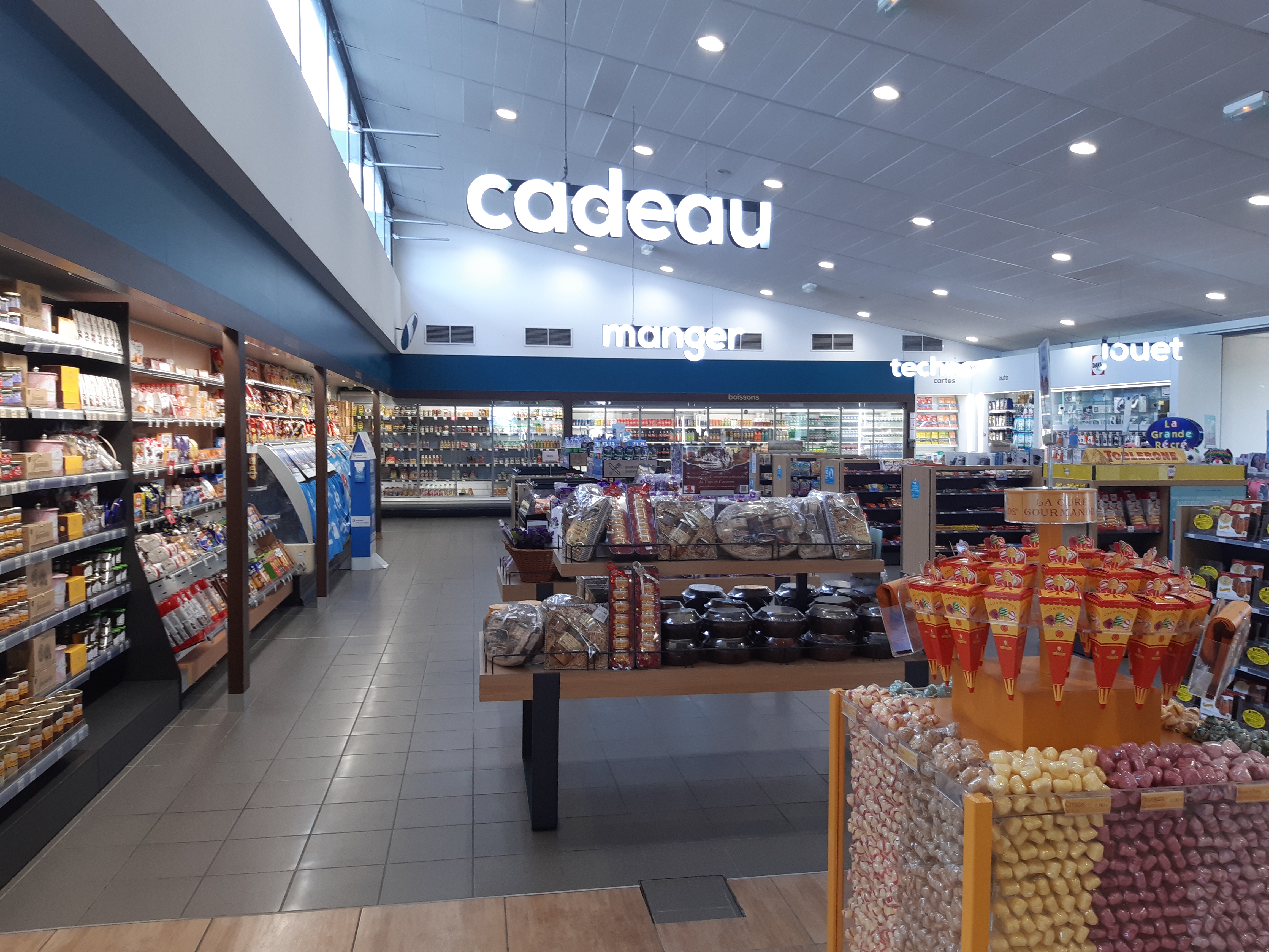 Super aire de repos avec station magasin cadeaux et alimentaire, de nombreux distributeur de boissons chaudes et froides