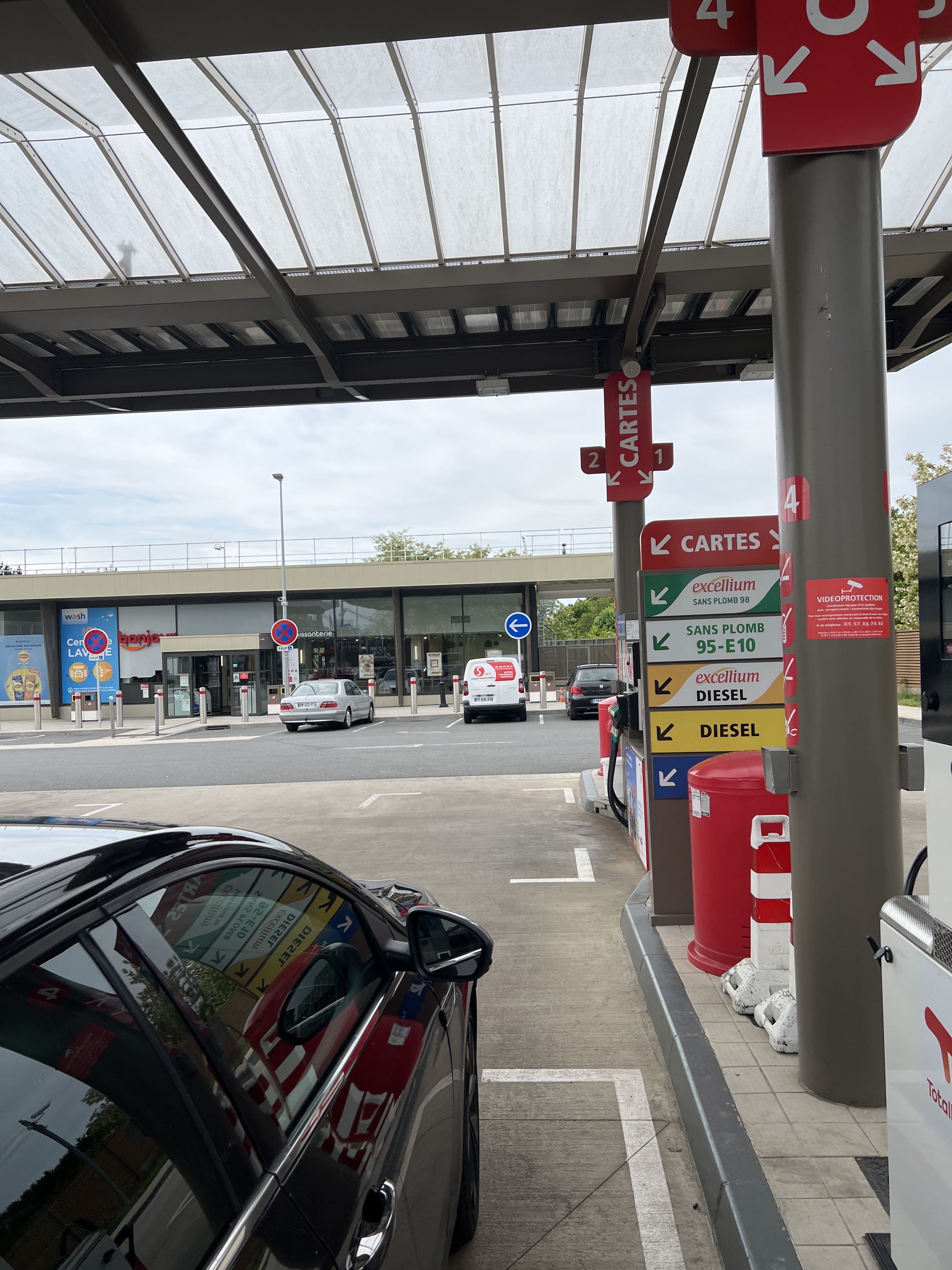 Procédure bizarre pour payer l'essence...aller à la caisse payer, puis retourner se servir mais pour cela réintroduire la carte, pas de ticket à retirer puisque le reçu a déjà été donné en caisse... Résultat oubli de la carte en fin du plein... Aucune alerte... Opposition à faire seulement plusieurs heures après puisqu'on s'en rend compte seulement au péage... Attention danger ! Merci Total...
