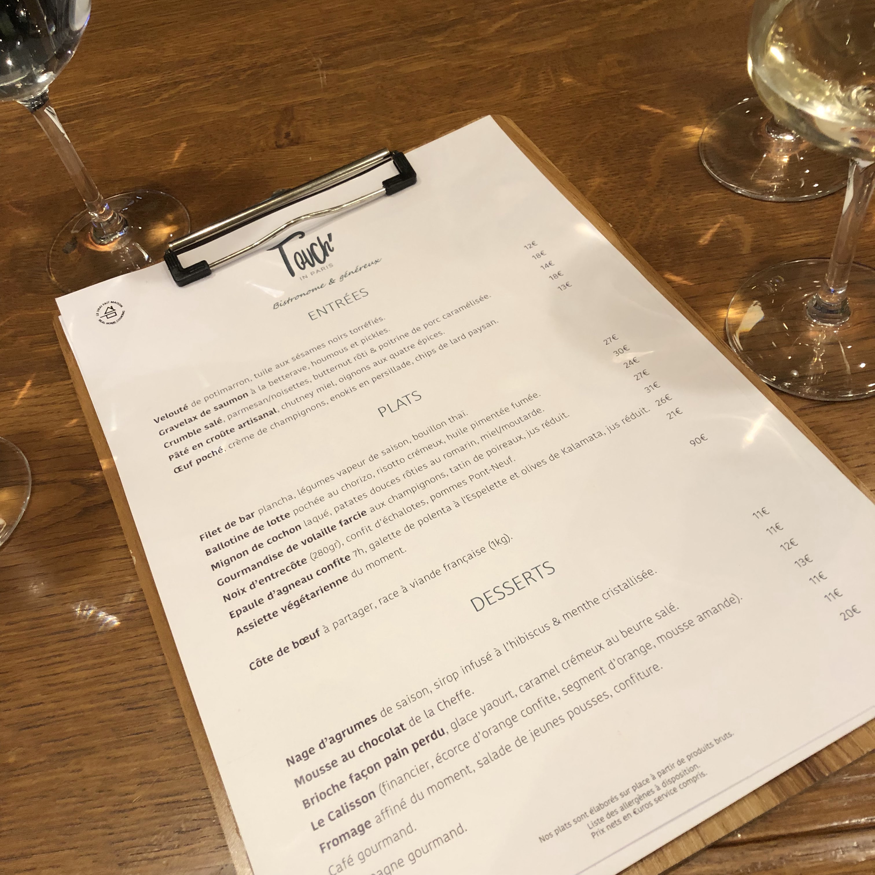 Nous avons testé le Touch In avec des amis un soir de semaine. J’ai généralement confiance dans les cartes pas trop étoffées, elles sont souvent le signe de produits frais et de « vrais » cuisiniers sur place. Le Touch In confirme cette règle et nous y avons très bien dîné avec un service très sympathique et pro. On est là face à un très très bon bistrot avec des plats originaux et des cuissons très bien maîtrisées (le cabillaud en croûte d’agrume était au top). Bref, on reviendra c’est sûr.