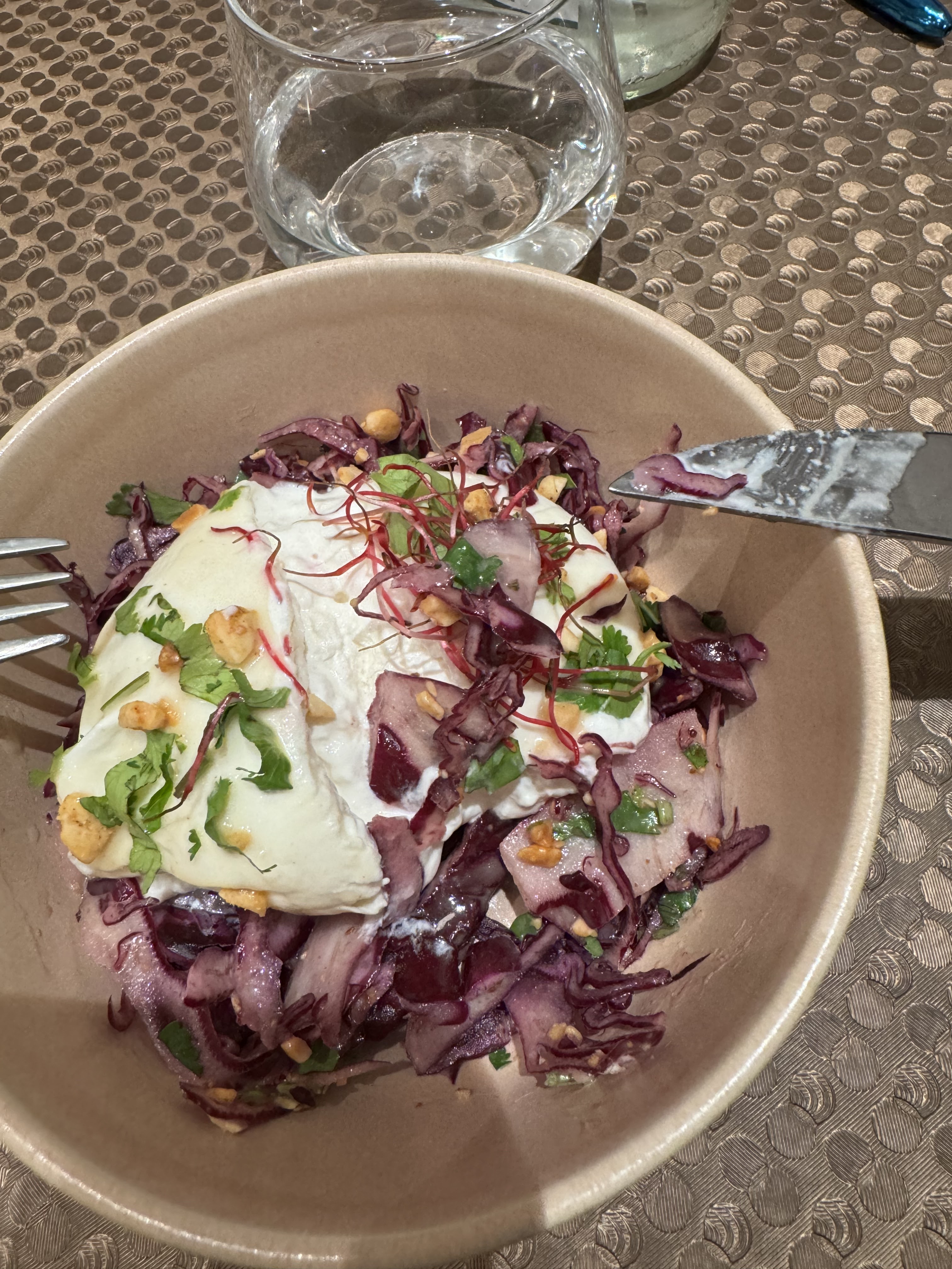 Excellent déjeuner dans ce petit restaurant parisien : Burrata au chou rouge sauce au miel, cabillaud au risotto et le cheesecake valent le détour