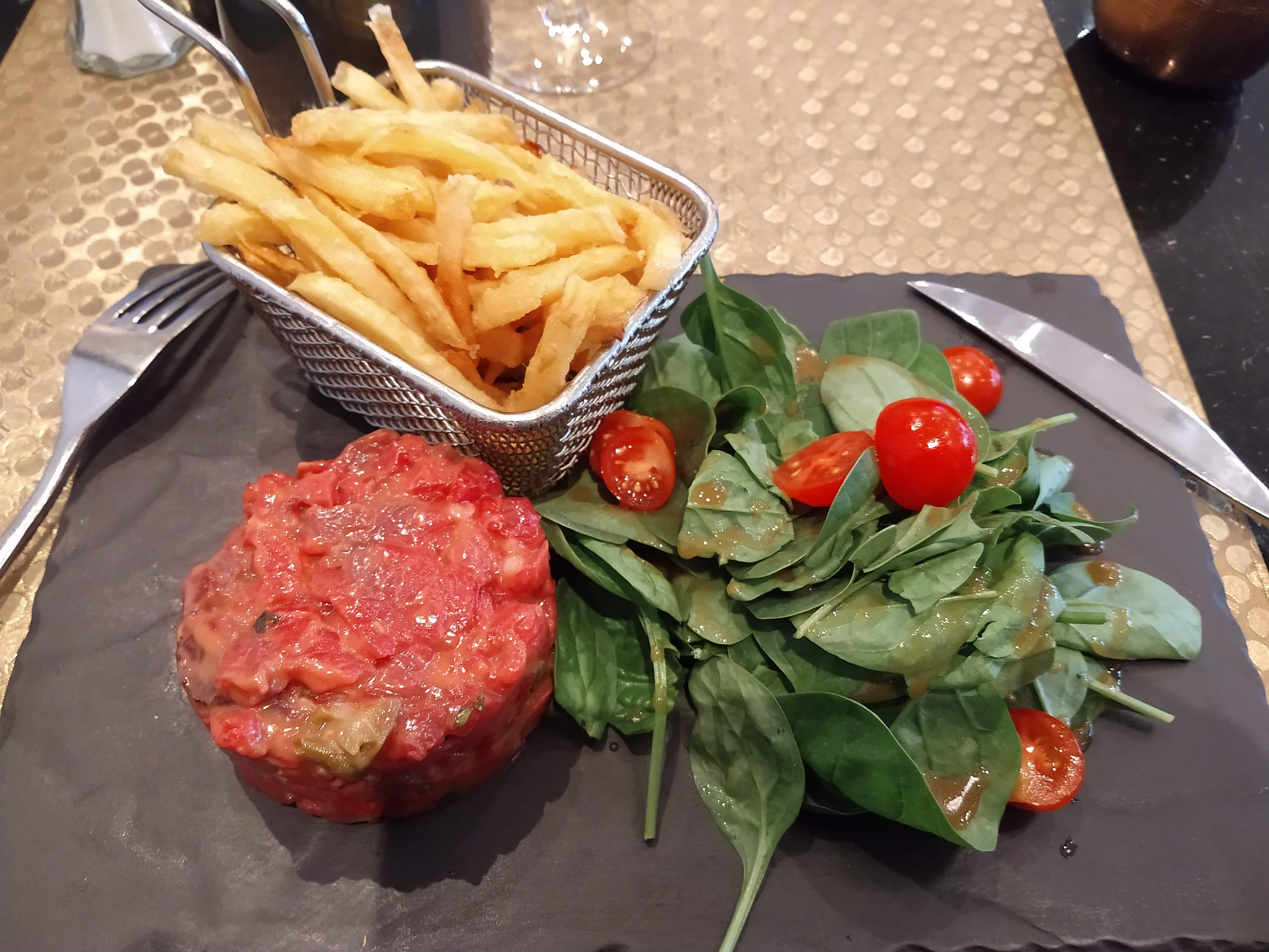 C'était super bon. Le tartare était bien préparé et les frites croustillante. Je conseille le tiramisu à la pêche