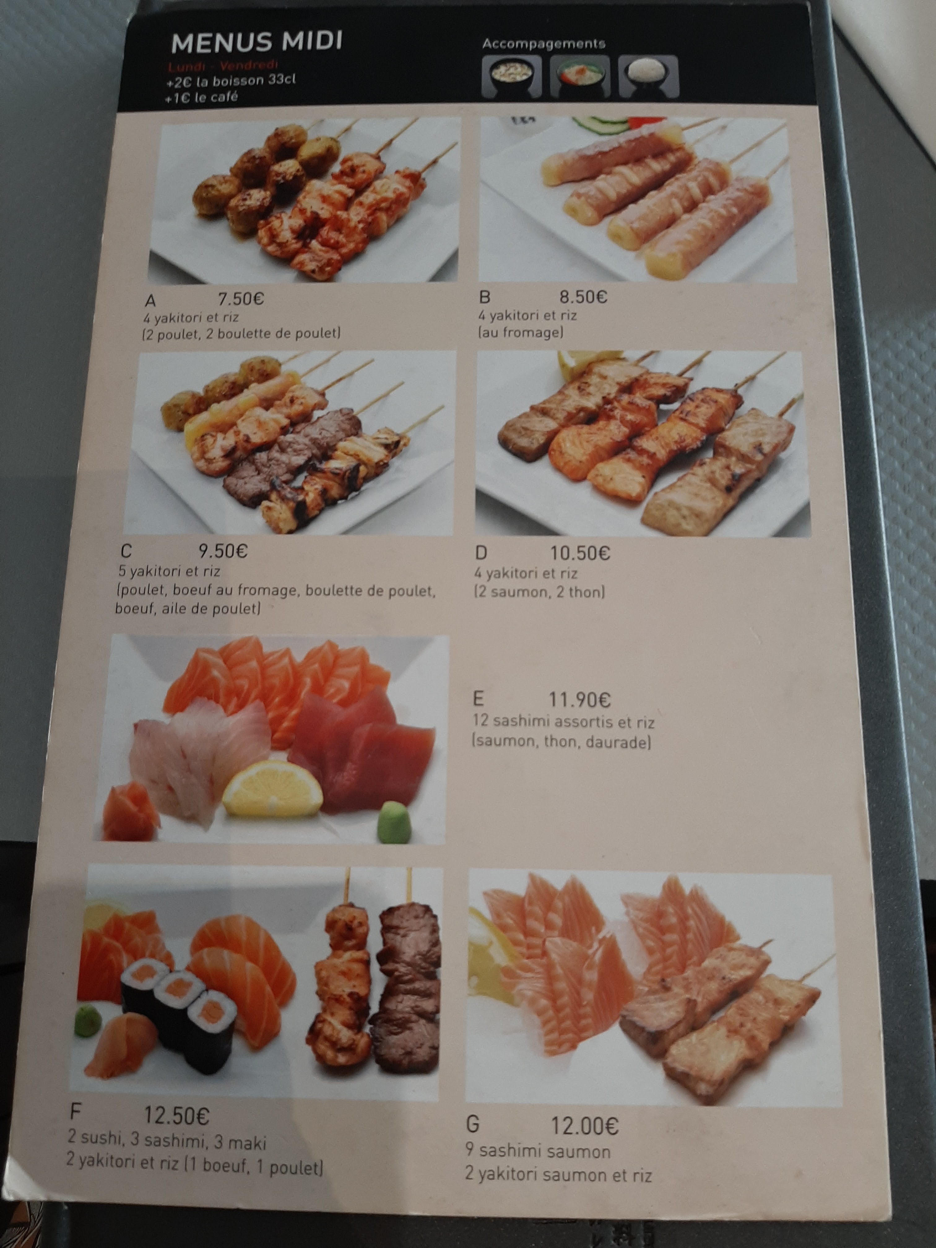 Restaurant de sushis, makis, et yakitoris Jolies portions, menus variés Beaucoup de vente à emporter