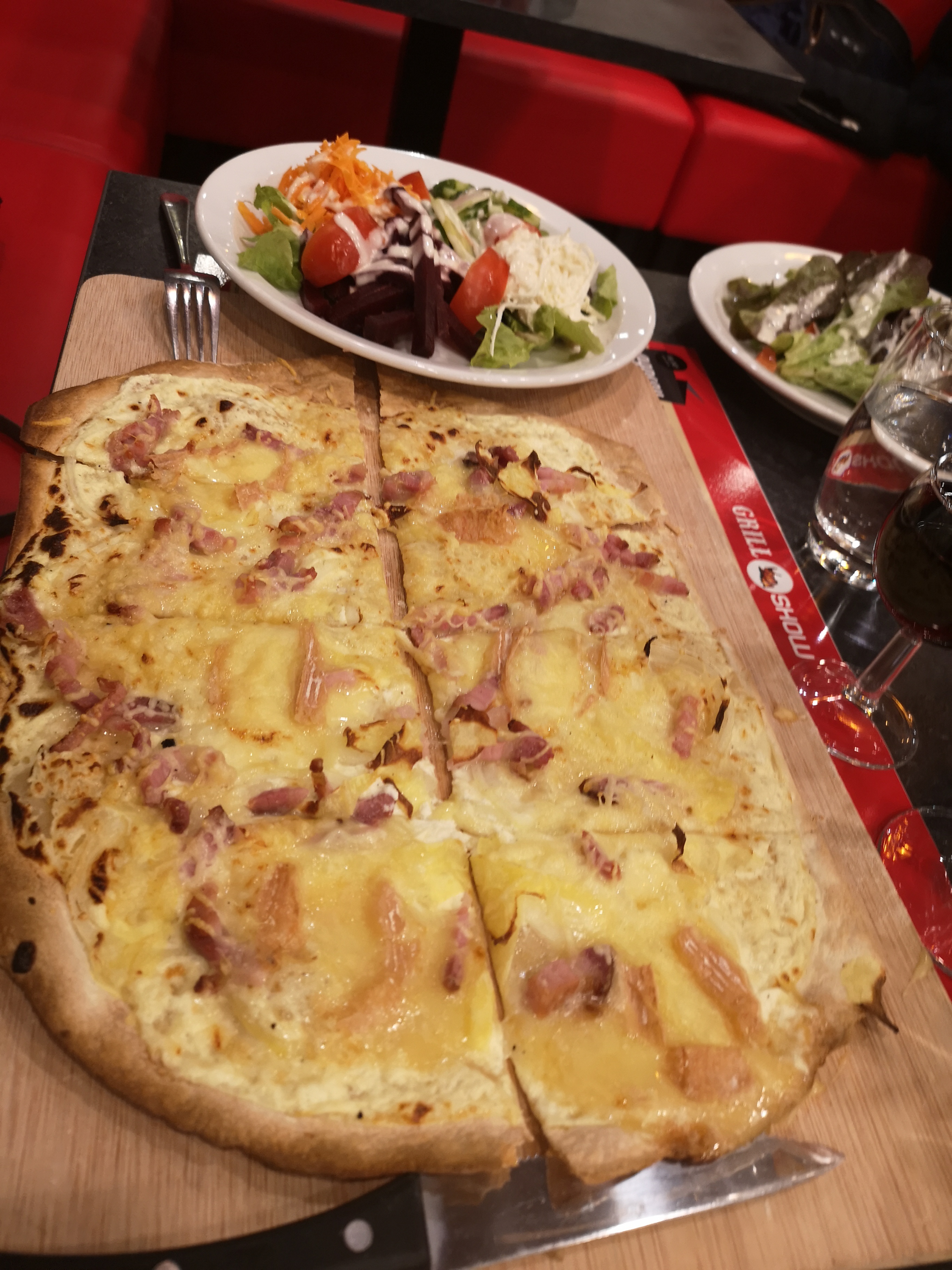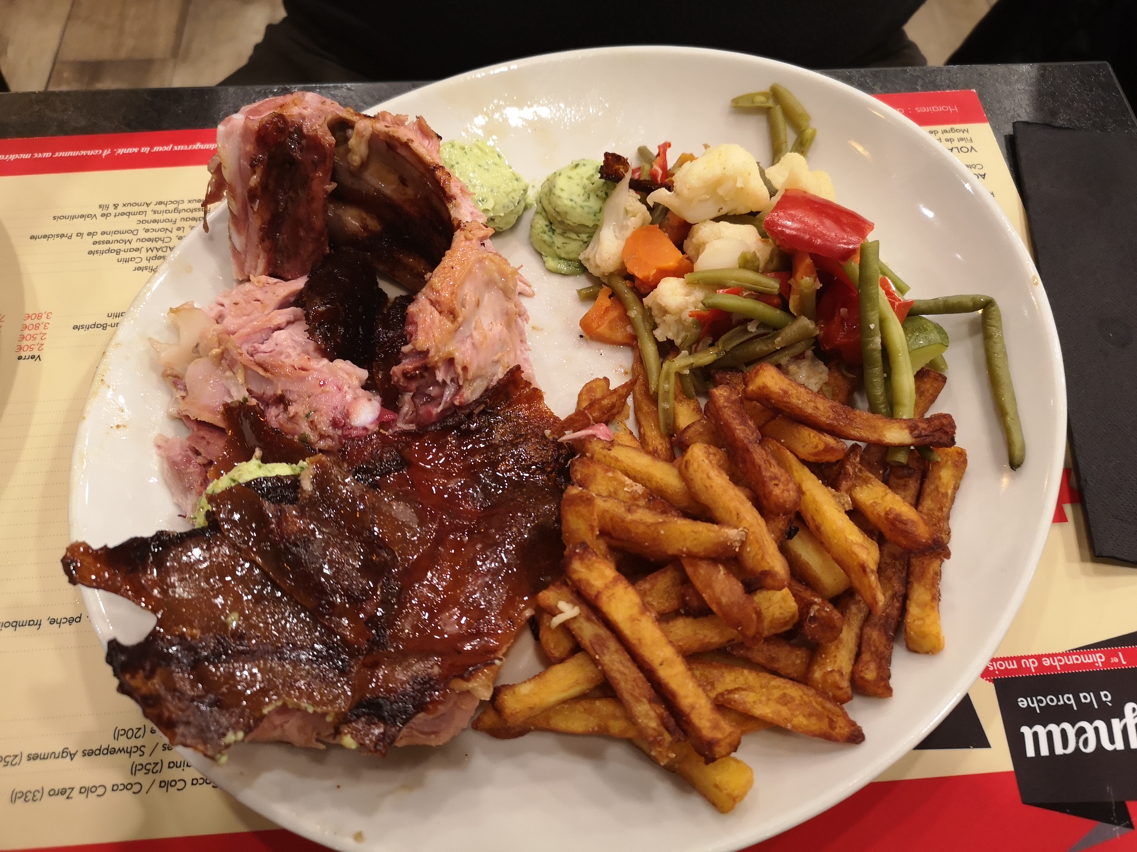 Le décor ne paye pas de mine mais ces propre climatisé et les banquettes sont confortables. Cuisine ouverte avec vue sur le grill. Service rapide, personnel souriant. Les ribs sont bons, accompagnement de légumes (carottes, chou fleur, courgette) qui change un peu. La tarte flambée à partager en apéritif est une bonne idée.