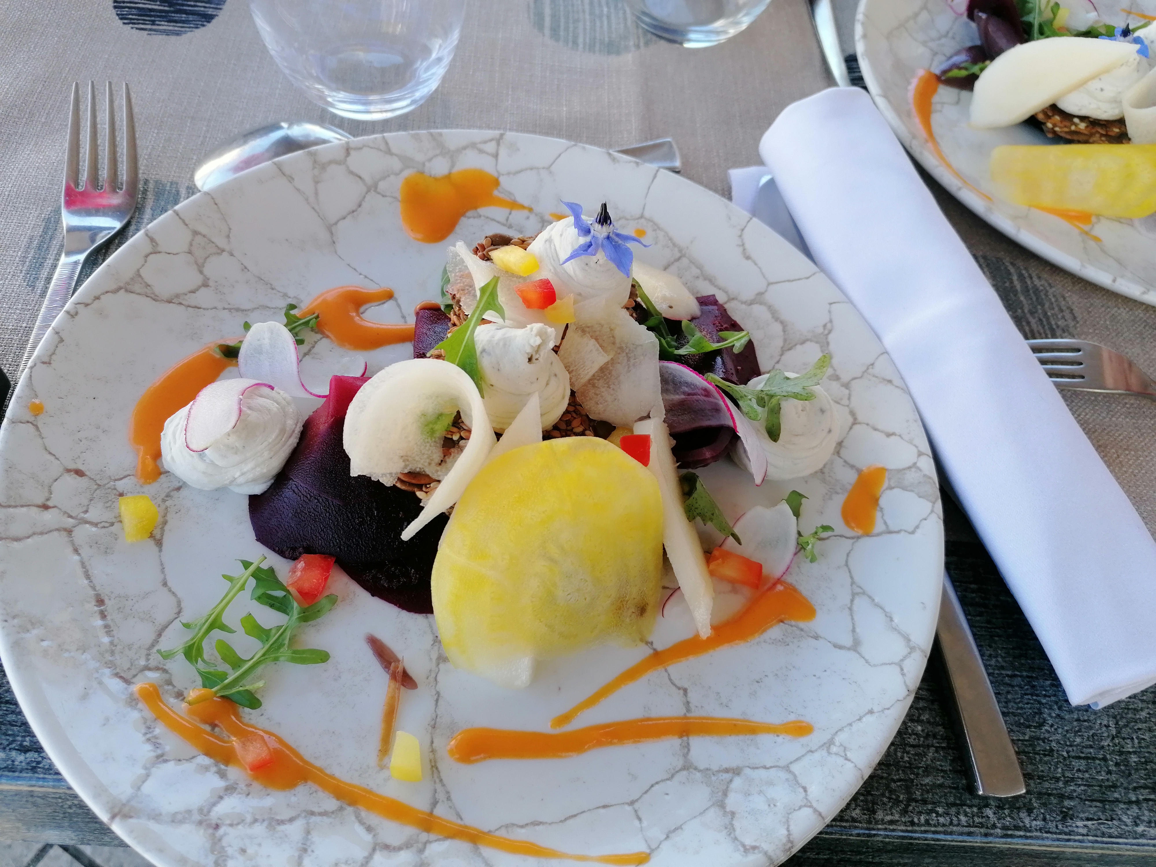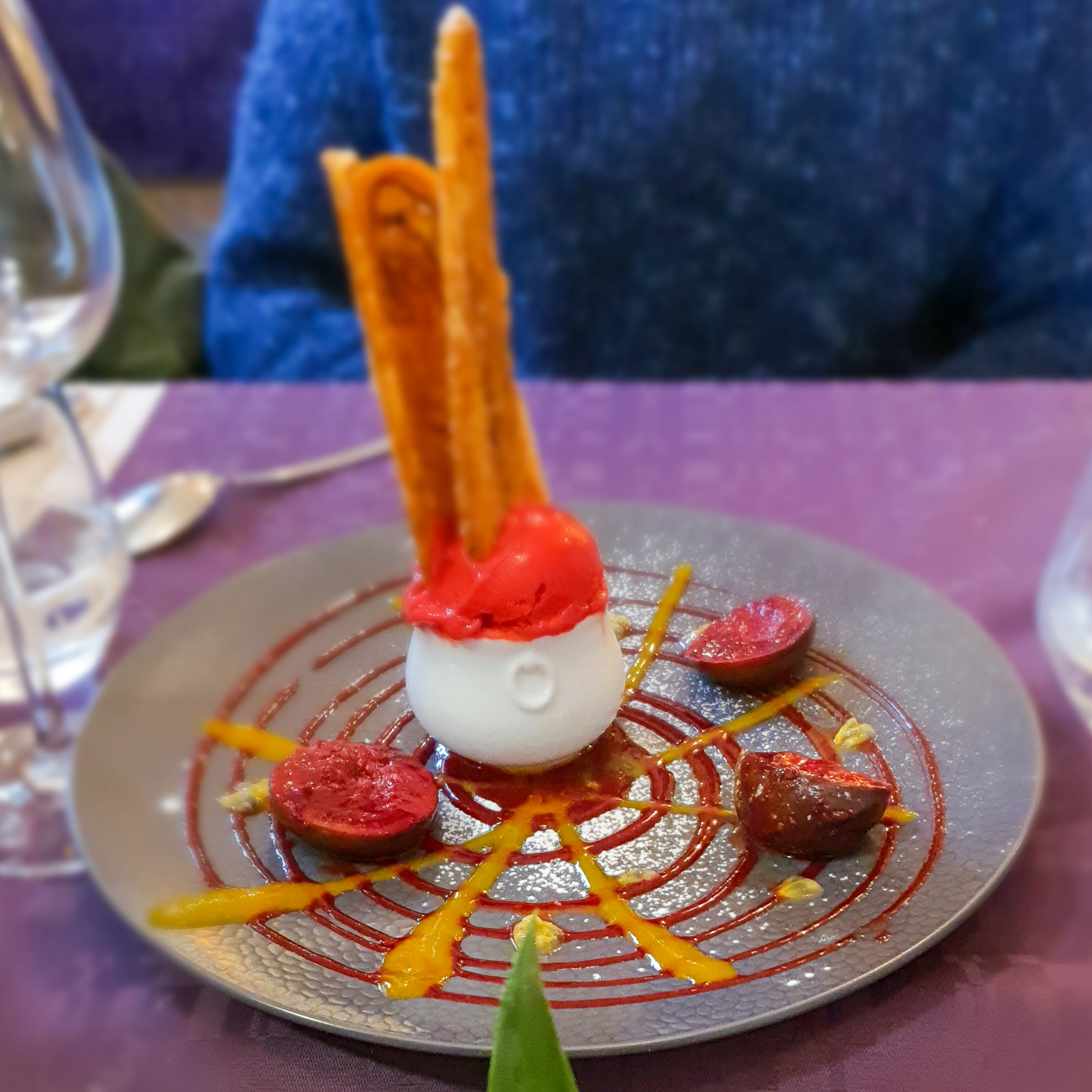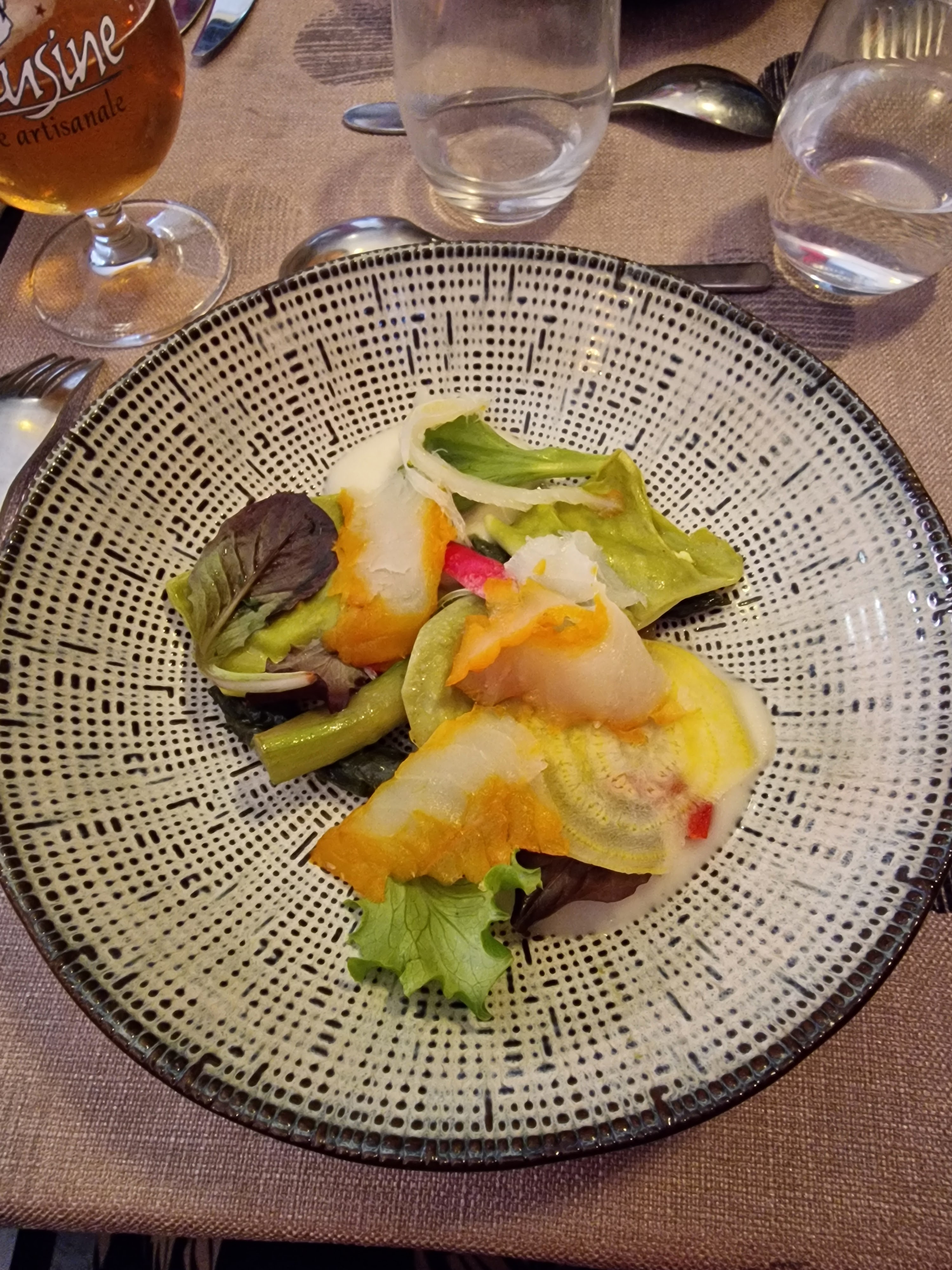 Quand la surprise est dans l’assiette.. et une bonne surprise. J’ai dégusté le poisson du jour : une lotte sur lit de légumes : fricassée de ceps ,céleri rave, navet boule d’or , pois gourmands, betterave et chips de patate douce le tout dressé sur un petit risotto de blé concassé.. mes papilles se sont éclatées . Merci Madame la cheffe !