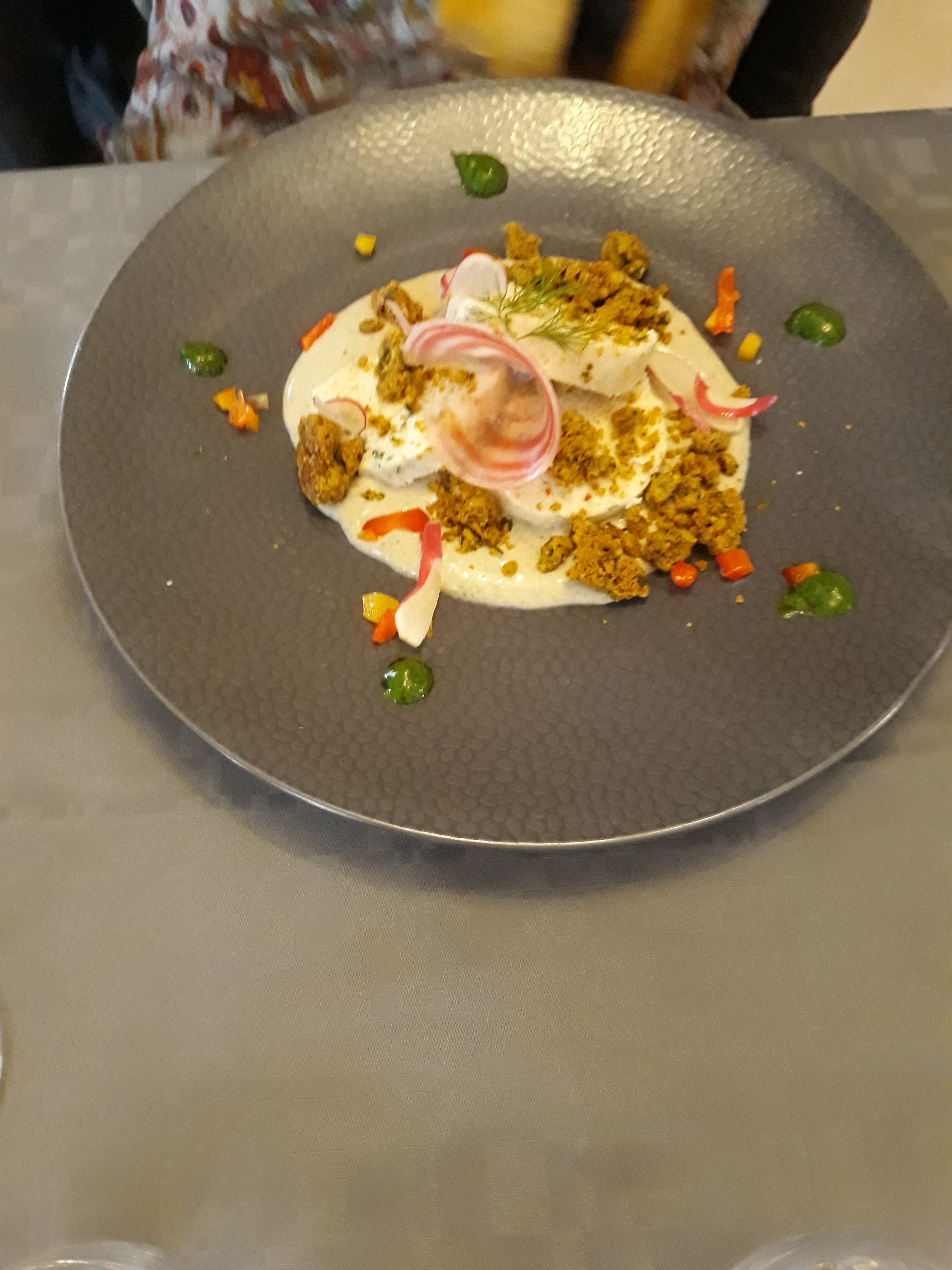 La cuisine était très bonne pour la première partie, mais il a fallu plus d'une heure pour passer de l'entrée au plat. Excellente entrée : effilochés de canard en pastilla, coing et pommes crues, et plat succulent et pour moi, filets mignons de porc farci, crémeux mogettes sauge. Le poisson servi dans le plat de ma femme était froid et surgelé ? Nous avons demandé à ce qu'il soit réchauffé, mais ils ont remis l'assiette complète avec l'accompagnement, je ne vous raconte pas l'état de la salade et du reste ! Le dessert est servi avec une boule de glace jetée dans l'assiette et à moitié fondue. Salle, très bruyante