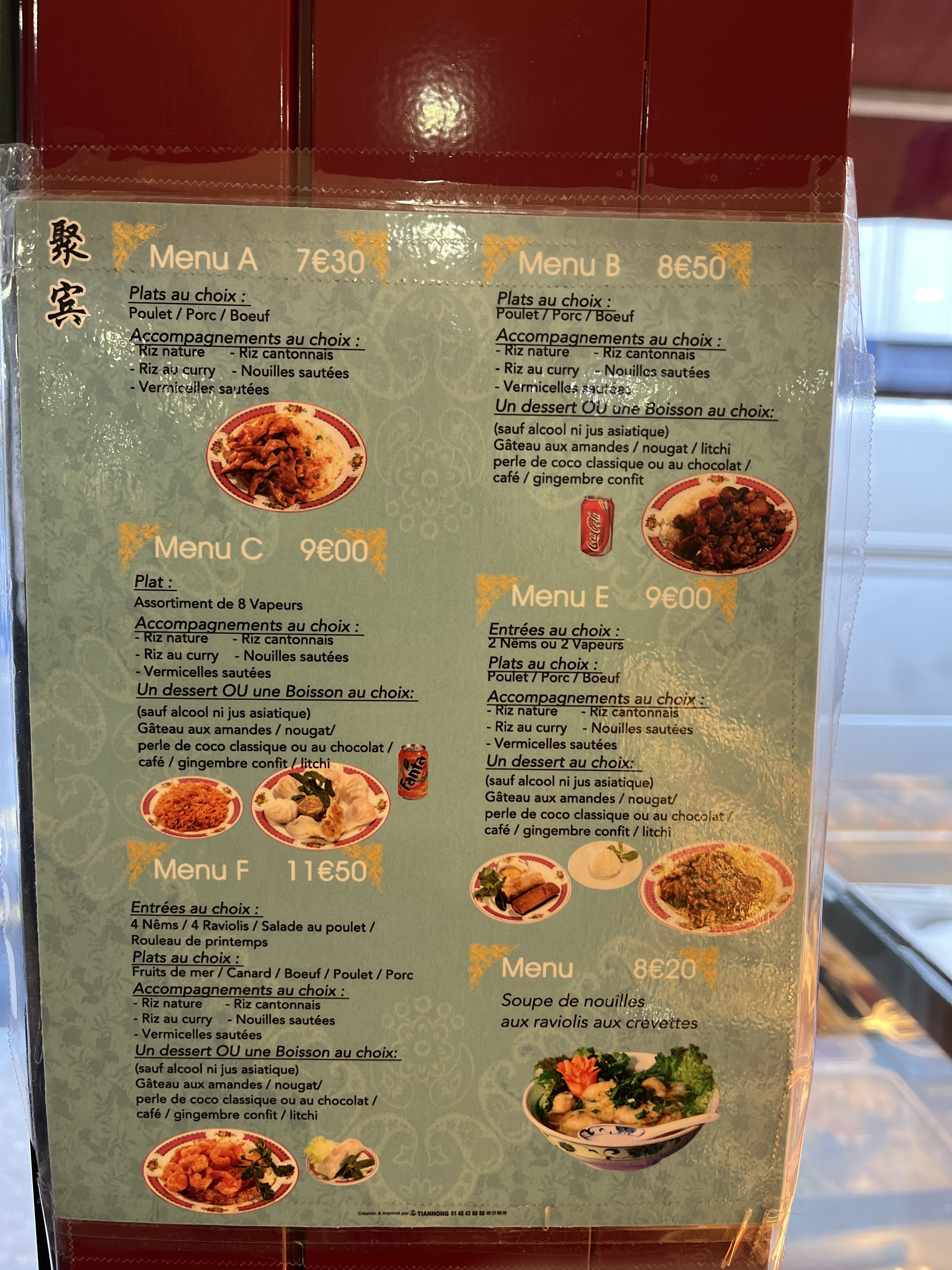 C'est un endroit fortement recommandé pour manger à Paris, vous ne trouverez pas d'autre endroit aussi bon marché, gardez à l'esprit que c'est de la cuisine asiatique et avec beaucoup de variété, du poulet, du bœuf, de la dinde aux fruits de mer et au poisson, je vous recommande d'apporter les boissons car si elles sont à 3 euros, mais sinon tout le monde est super bien, ils parlent anglais et parfois espagnol, c'est un endroit fortement recommandé, on peut manger sur place ou à emporter si on veut.