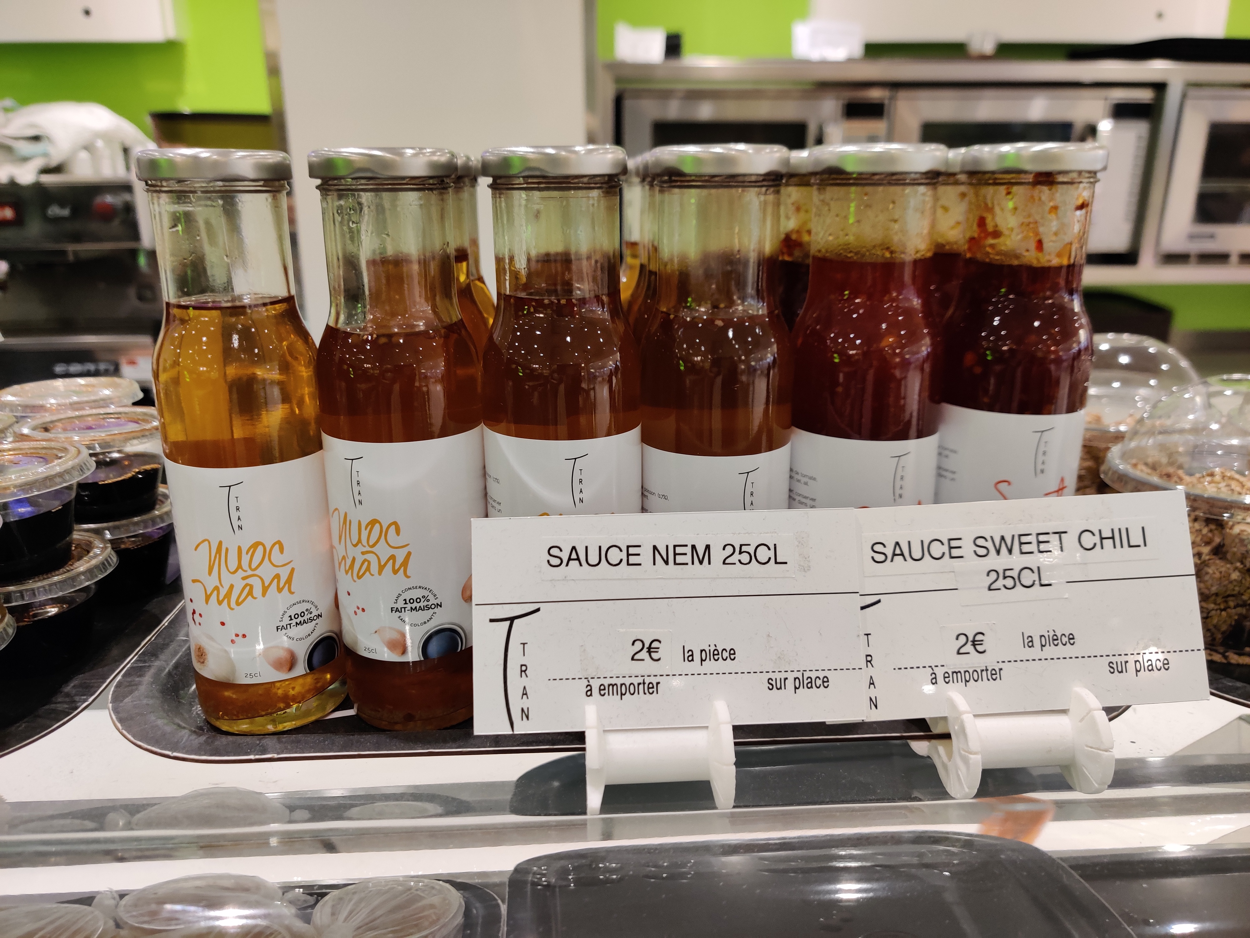 J'ai été avec mon conjoint chez TRAN (au rez-de-chaussée ) C'est un traiteur de qualité qui propose des produits qui ont du goût. Le personnel est a l'écoute, accueillant et souriant. Concernant le choix des produits, la note grimpe très vite. Les aliments sont servis dans des barquettes en plastique et réchauffer au micro onde et nous les ont apporté à notre table. J'ai particulièrement apprécié la sauce nem ( ou nuoc mam). La sauce est bien réussi. Le plateau est servie avec des couverts (fourchette + couteau) + assiette. J'aurai aimé qu'on me propose les baguettes mais j'ai du le demander. Dans l'ensemble nous avions bien mangé.