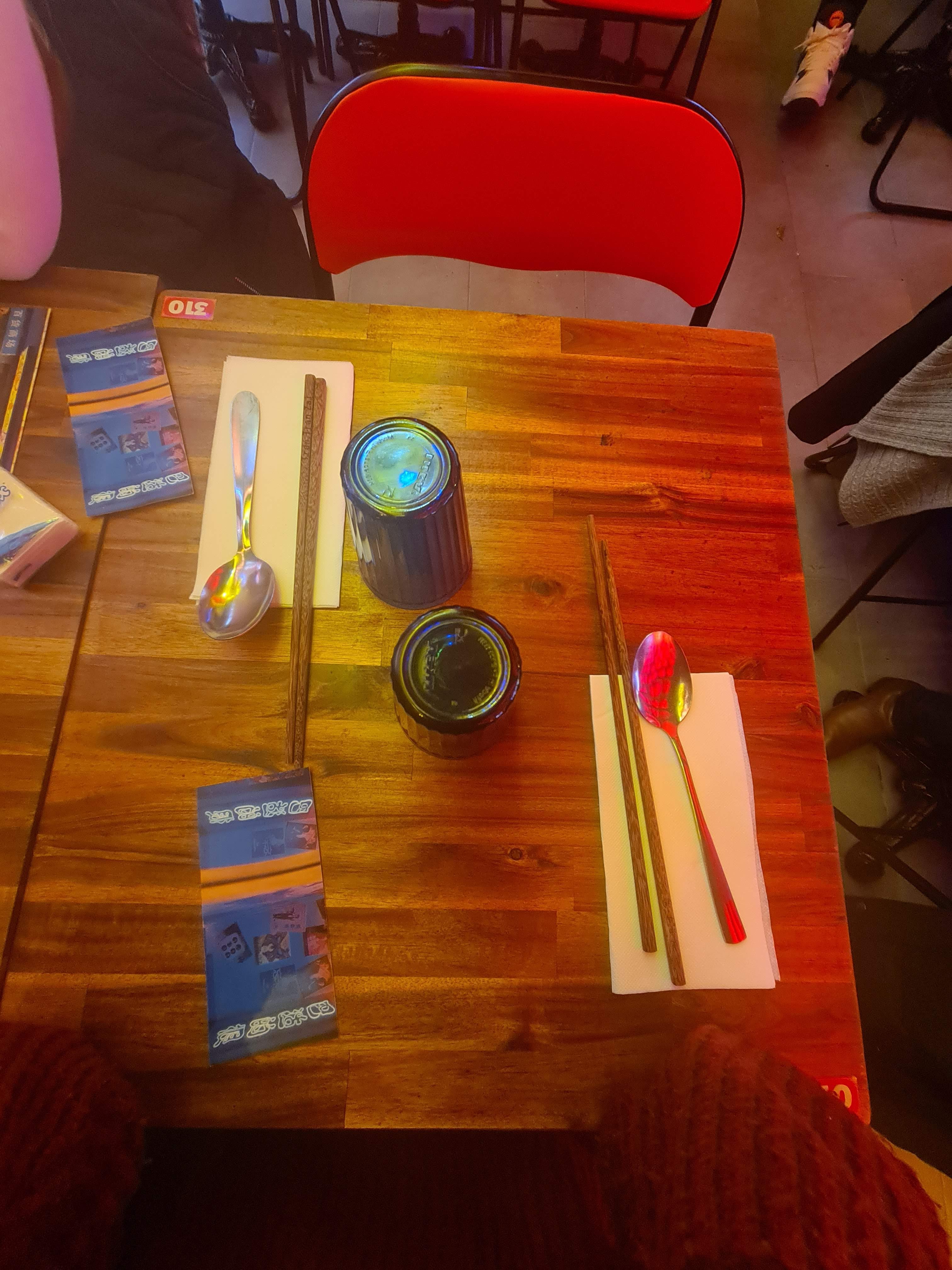 Prise de commande un peu longue mais ambiance extra ! Genial de trouver ce genre de soupe à Paris ! Attention au niveau piment ! Habituée j'ai choisie 5/6 j'ai cru pas pouvoir terminer tellement c était fort ! Super expérience
