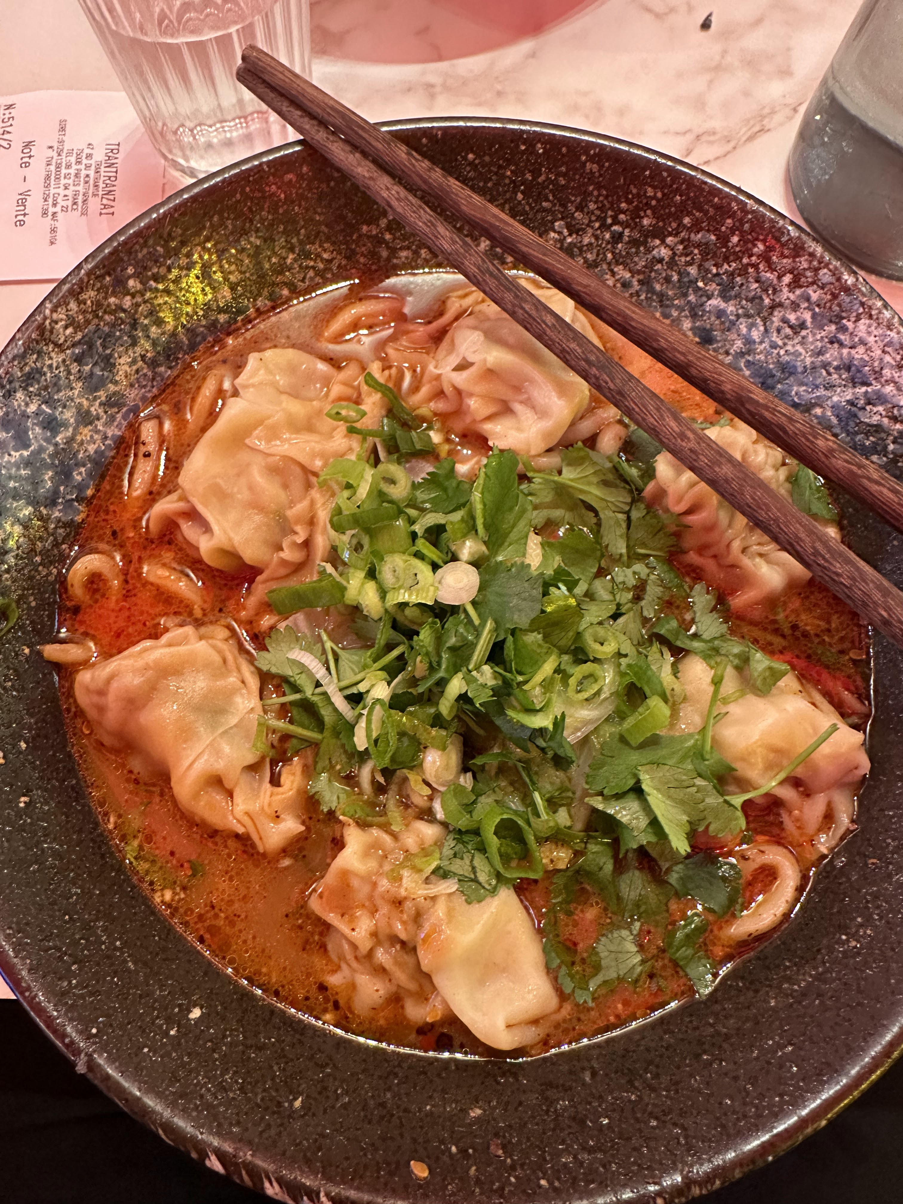 On en rêvait depuis notre dernière escale Parisienne en juin dernier au Trantranzai châtelet (qui semble être en travaux) Cette fois ci on a opté pour le Trantranzai Montparnasse et c’était exactement ce dont on avait besoin ! Bubble tea aux haricots (chaud) et Brown sugar Sisi (froid) excellents ! Les raviolis porc et végé avec la sauce piquante au sésames étaient délicieux, d’une finesse exceptionnelle ! La soupe de nouille au bœuf généreusement servie avec une viande juteuse et savoureuse qui s’effiloche dans le bouillon, extra ! Le décor est très immersif, on se sent de suite dépaysé et le service adorable ! Merci pour ce voyage culinaire !