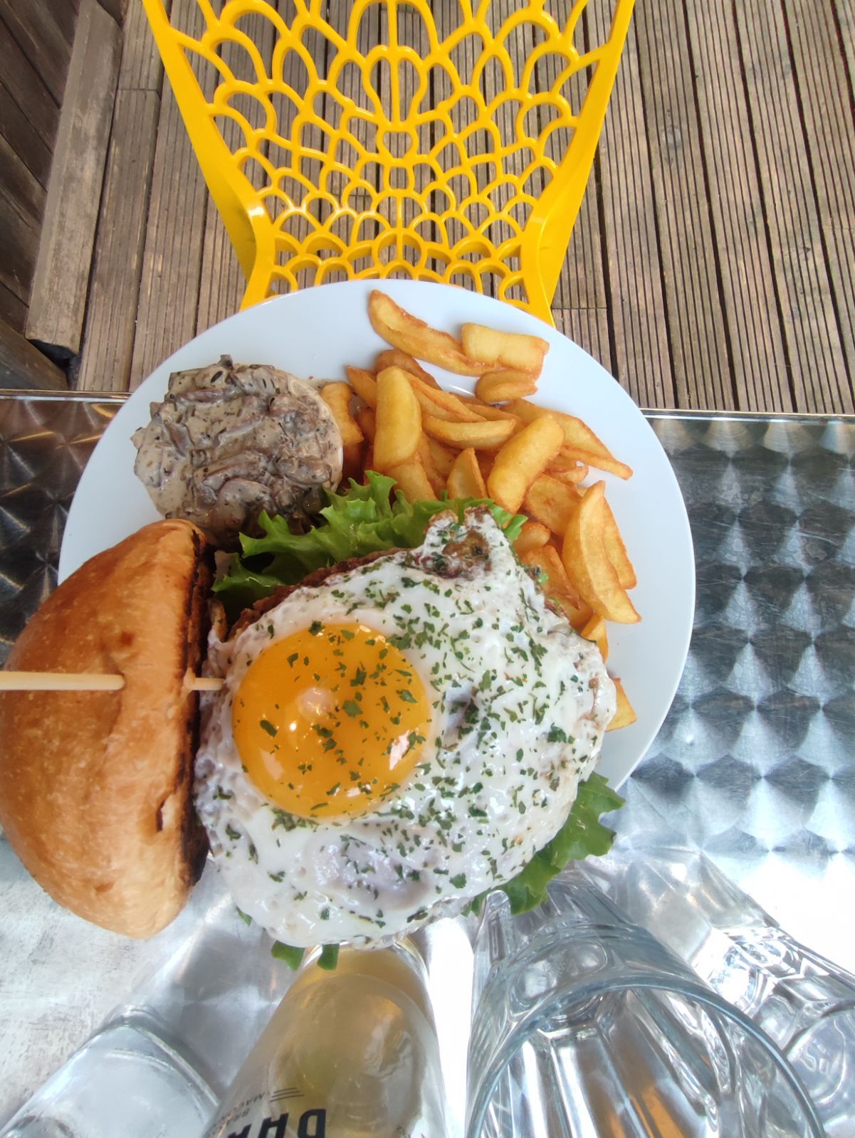J'ai choisi un burger chèvre miel : excellent ! Servi avec champignons à la crème, frites américaines (chips !), boisson et sauces sur demande - en menu. Le meilleur burger maison à Chalon ! 👍
