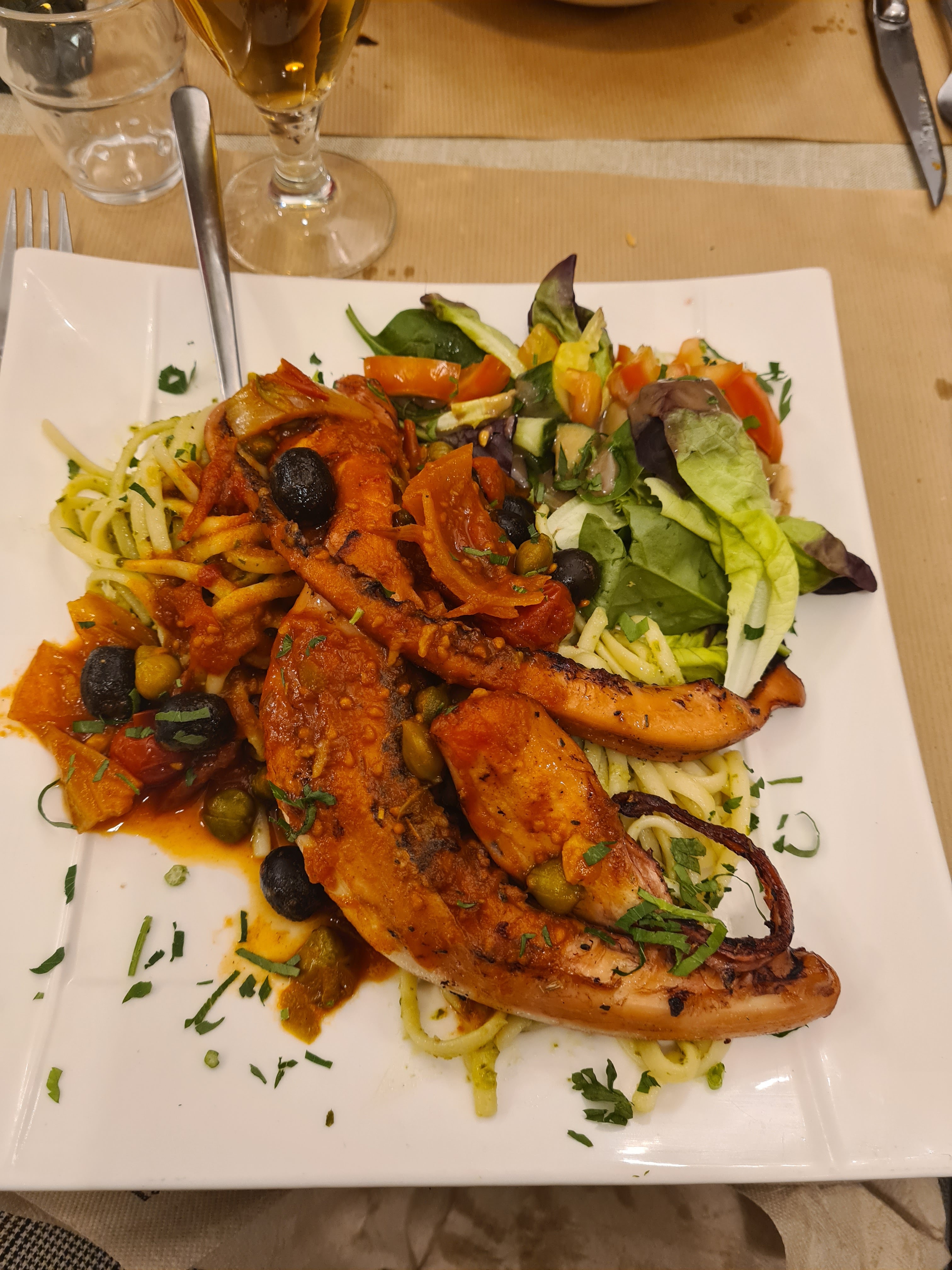 Les plats servis sont copieux mais ils n'ont pas beaucoup de goût. L'ensemble est assez fade, en réalité. Nous avons pris une salade de poulpe mais le poulpe n'avait pas vraiment de goût. Quant aux pâtes, elles étaient un peu trop cuite et la sauce tomate sans parfums. C'est dommage parce que la personne qui sert est sympathique, arrangeante et discrète.
