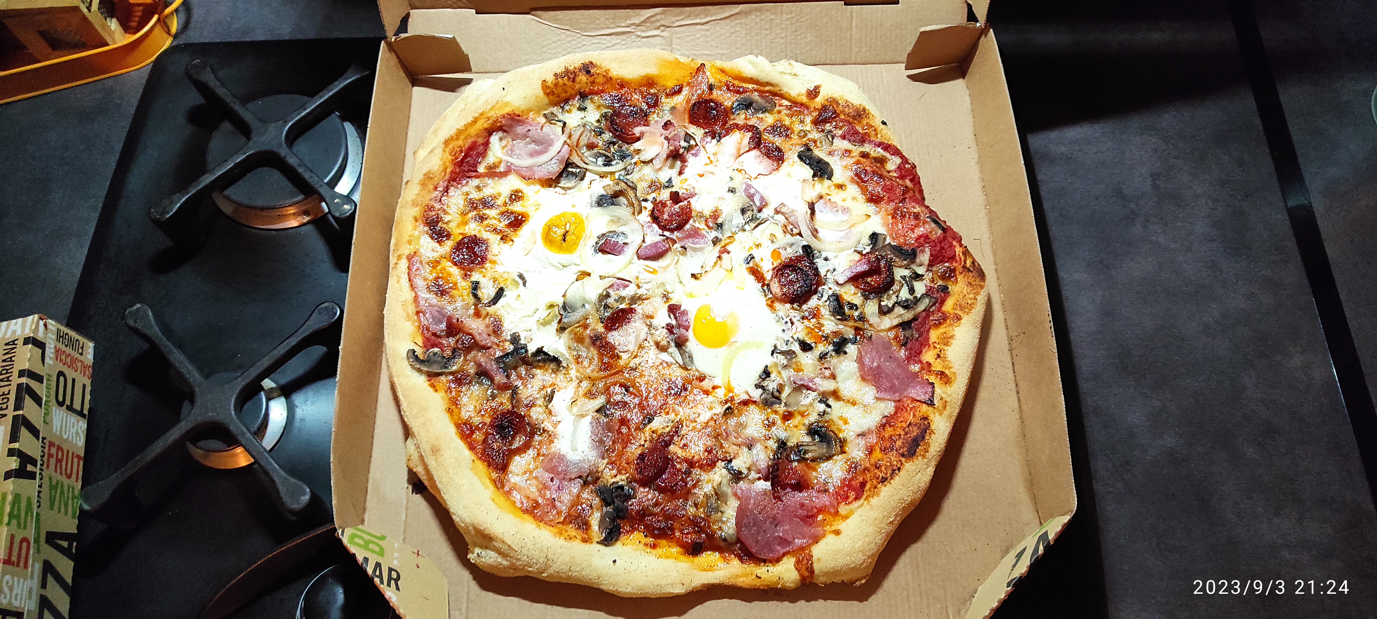 On i mange très bien attention à la pizza géante elle fait pas rire