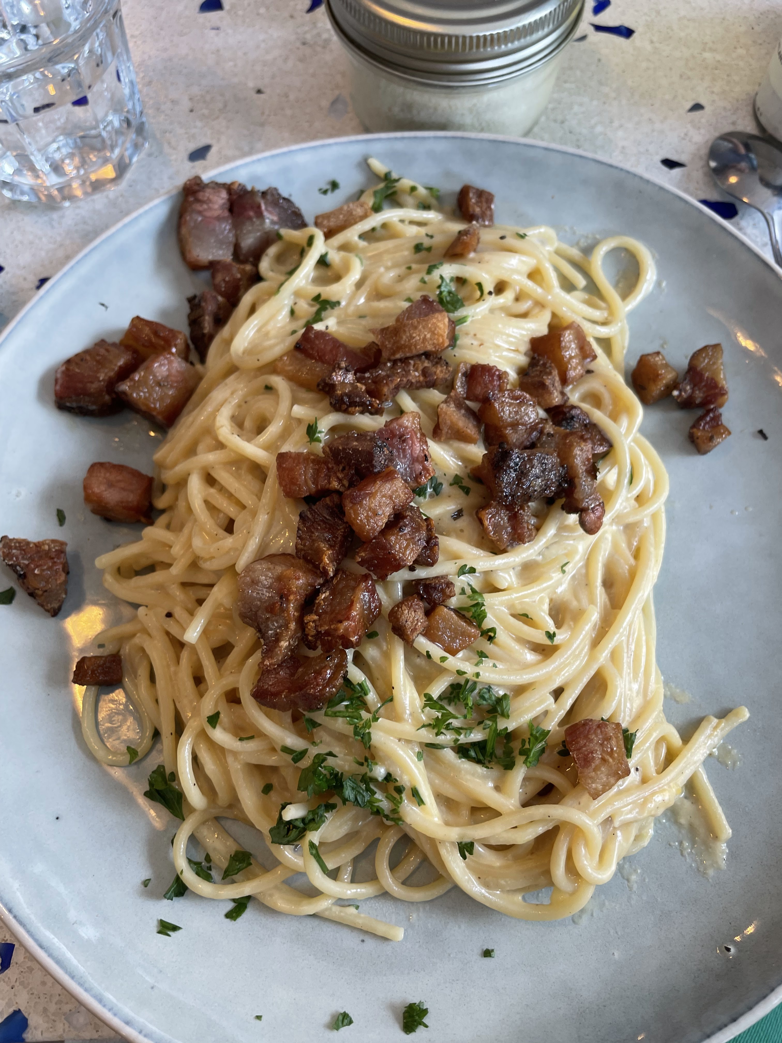 Nous avons testé cette adresse un soir d’été, c’était vraiment sympa. J’ai opté pour des tagliatelles à la truffe. Elles n’étaient pas mauvaises mais un peu fades. Elles n’étaient pas vraiment crémeuses mais couvertes d’un emincé de champignons qui donne l’illusion de la truffe (comme dans beaucoup de restaurants). Le vin en revanche n’était pas très bon, faites-vous plaisir avec le spritz.