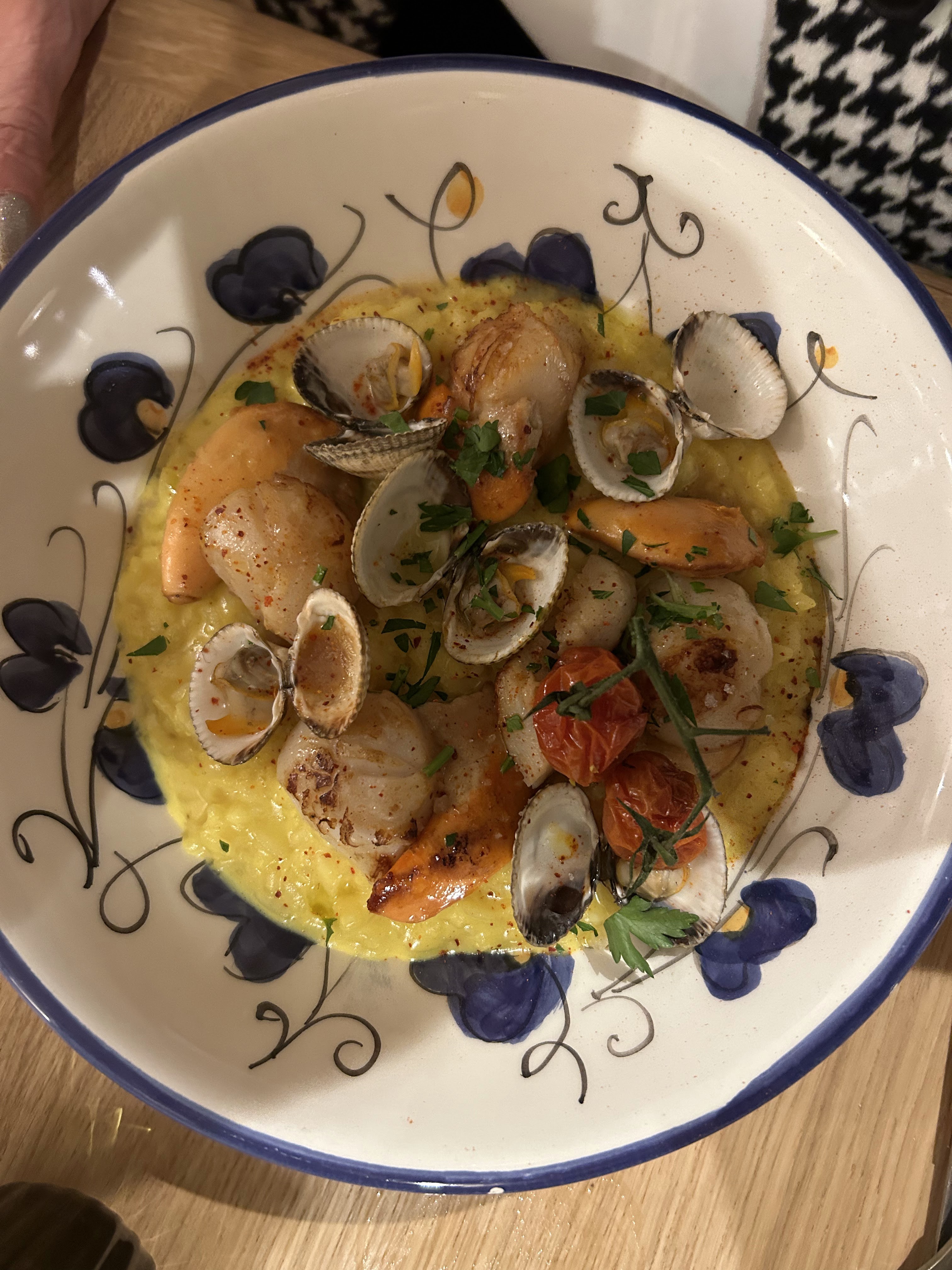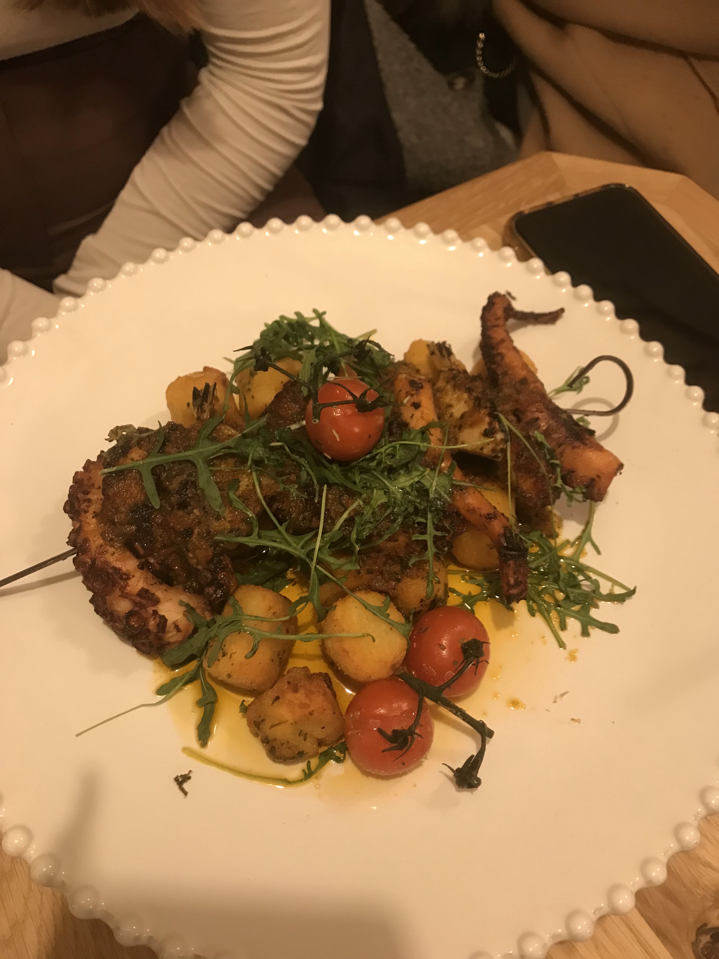 Nous sommes allés dîner 2 fois. Le jour de l’ouverture et ce soir. La première fois la pizza était très bonne et ma femme avait pris des ravioles vraiment très bonnes. La deuxième fois brochette de poulpes grillés bonne mais pas le plat était juste tiède. Ma femme et notre amie ont pris le risotto aux St Jacques, (très bonnes)riz farineux mauvaise cuisson. Desserts très bons. Les serveurs attentifs et sympathiques très pro. En résumé cuisine de qualité inconstante,. cadre très cosy bonne ambiance