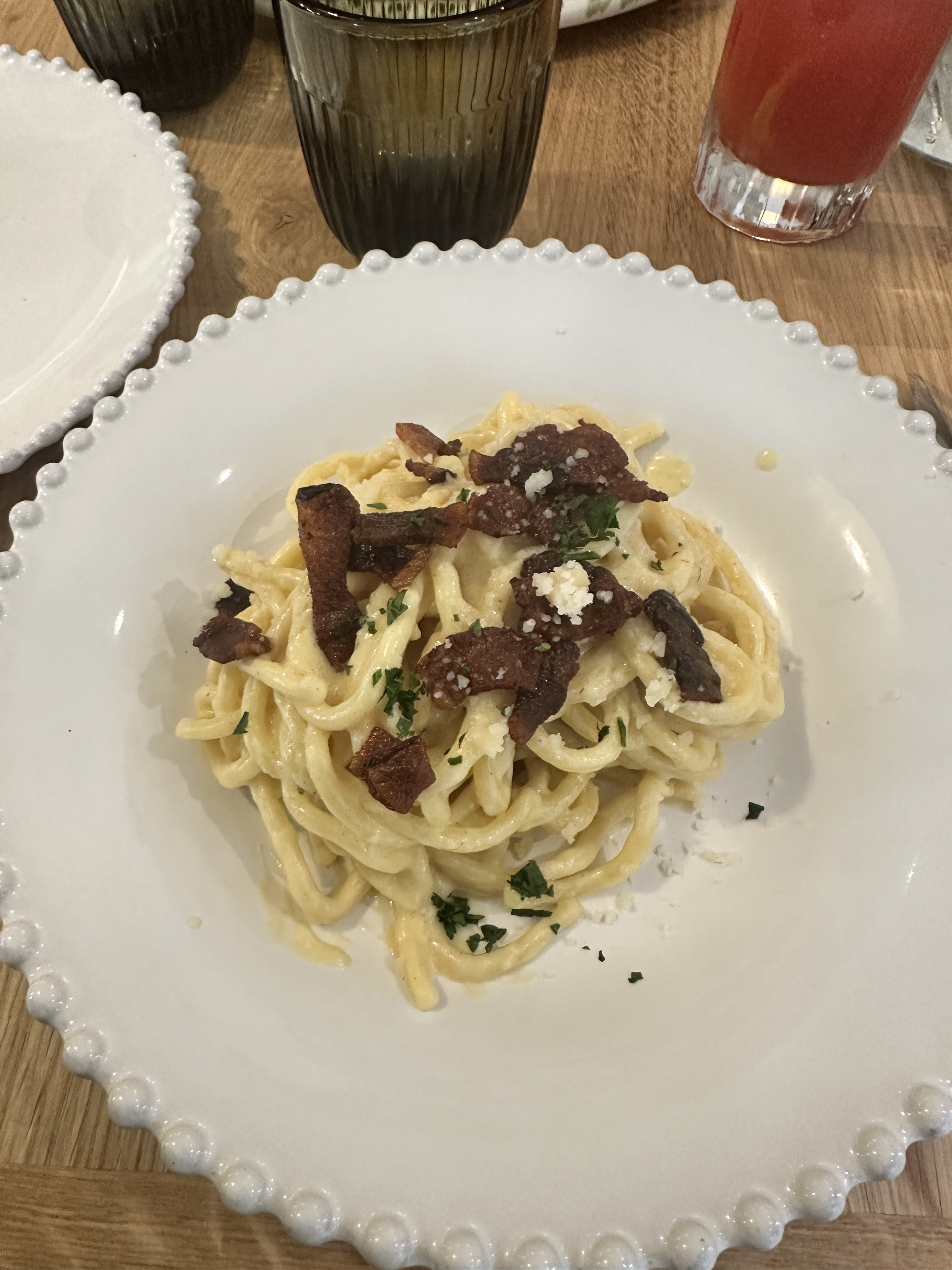 Attention le niveau de la cuisine a baissé. Pâtes carbo trop cuites et qui baignaient dans l’huile, impossible de finir l’assiette ultra grasse. Un bout de fer trouvé au milieu des pâtes. Cela a été signalé au serveur qui a juste dit « désolé ». Pas de café offert, pas de geste commercial. Très joli lieu mais cuisine décevante avec des prix pratiqués dans la fourchette haute.