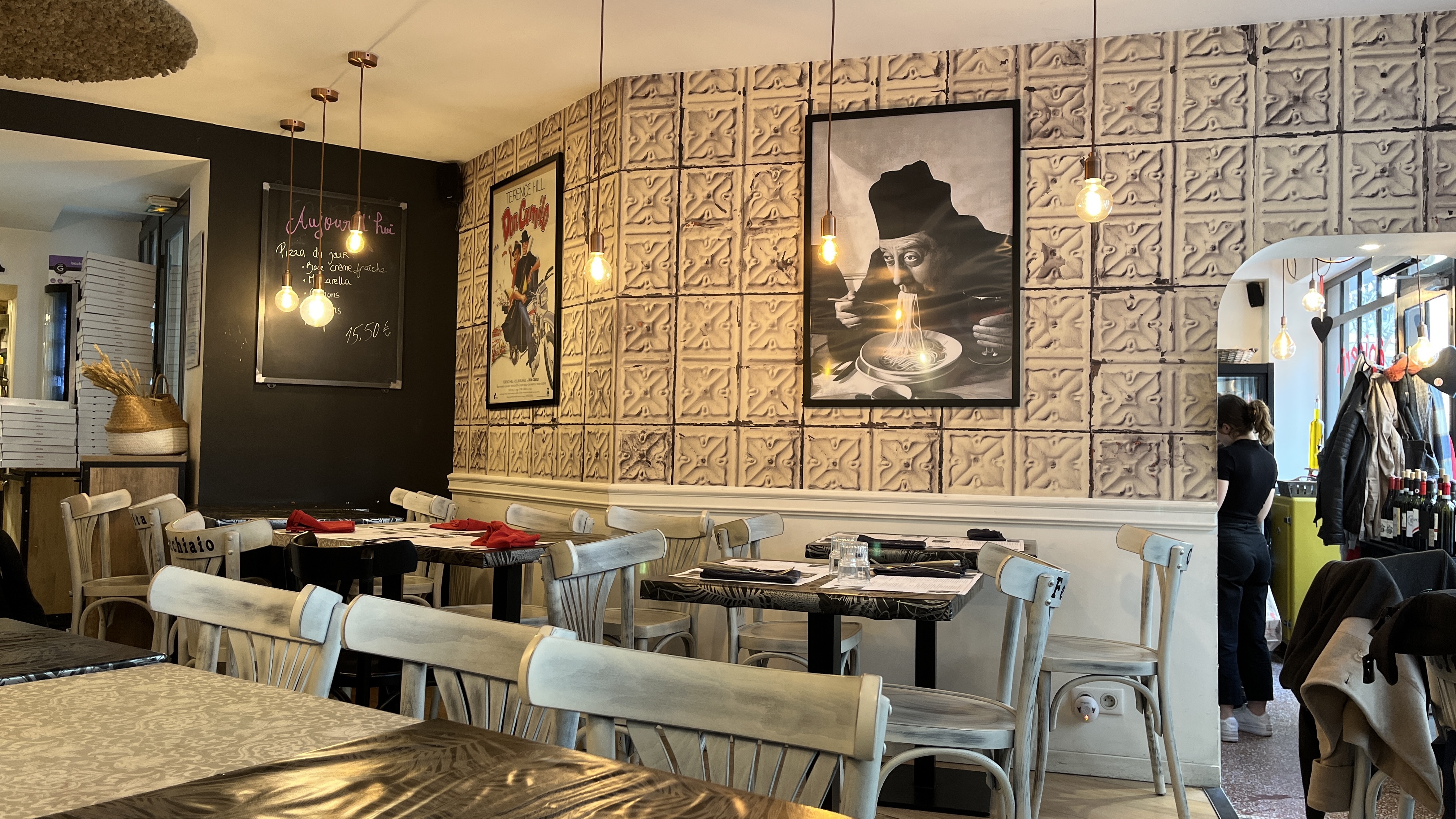 Accueil agréable des deux jeunes serveuses Emma et Noa. Jolie déco italienne soignée : vieilles affiches de cinéma, affiches de Fernandel ... Nous nous sommes tous régalés avec nos différents plats : salade, pâtes, pizzas. Un pur délice .... Un seul petit bémol : le restaurant est bruyant (mauvaise acoustique) et nos apéritifs ont été servis en même temps que les plats.