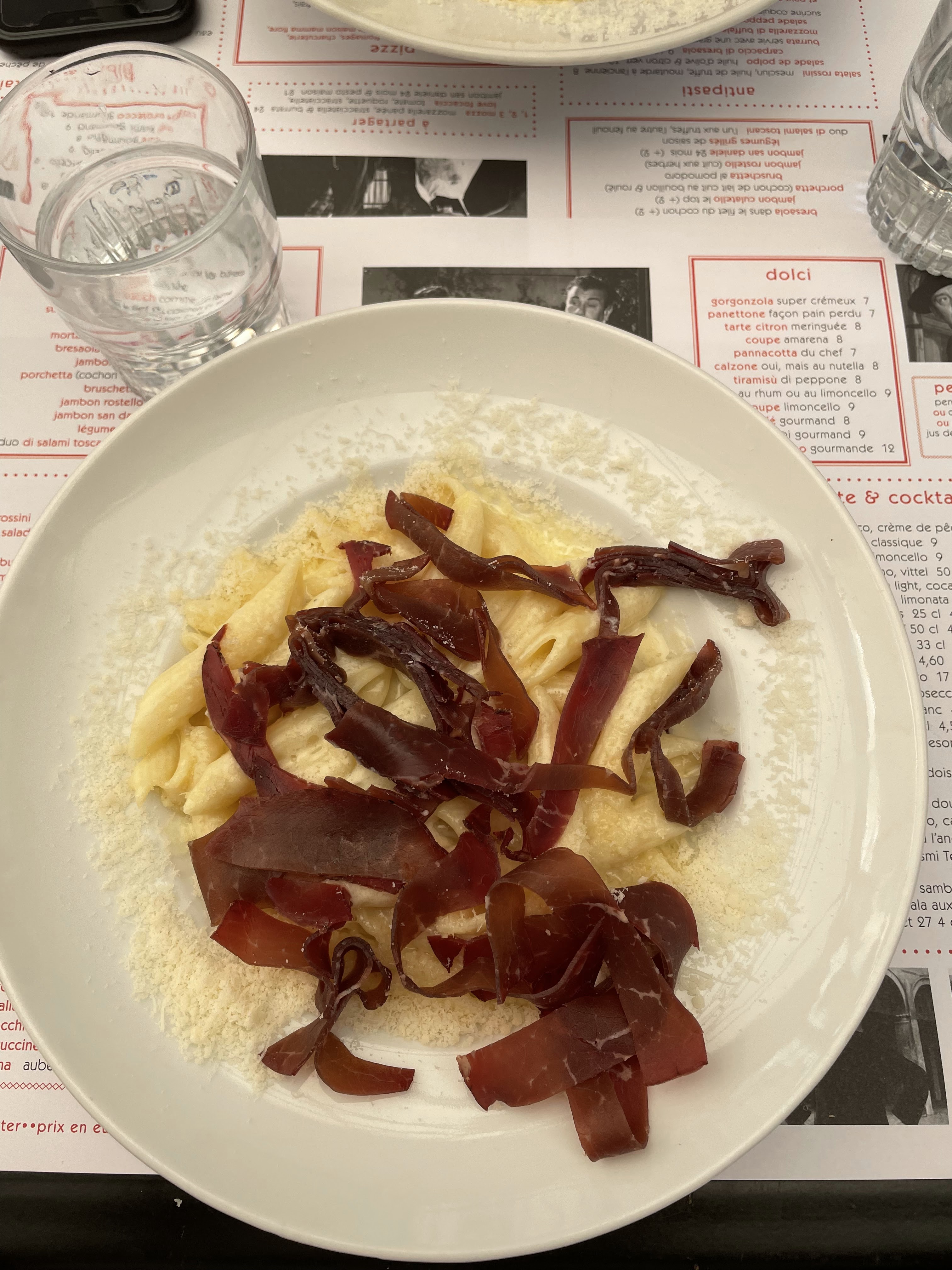 Pâtes trop cuites Suite à ma demande l’assiette m’as été changé mais le nouveau plat était peut être même encore plus cuits que le premier Les pâtes se transformaient alors en purée sous le poids de la fourchette Réponse du serveur : Vous êtes juste habitué aux pâtes aldente Je vous laisse de plus imaginer le regard hautain qui allait avec Enfin quand on commande des pâtes on ne veut pas qu’elles se transforme en purée… La personne m’accompagnant était satisfaite de sa pizza Morale : n’y commandais pas des pâtes Dommage pour un restaurant italien