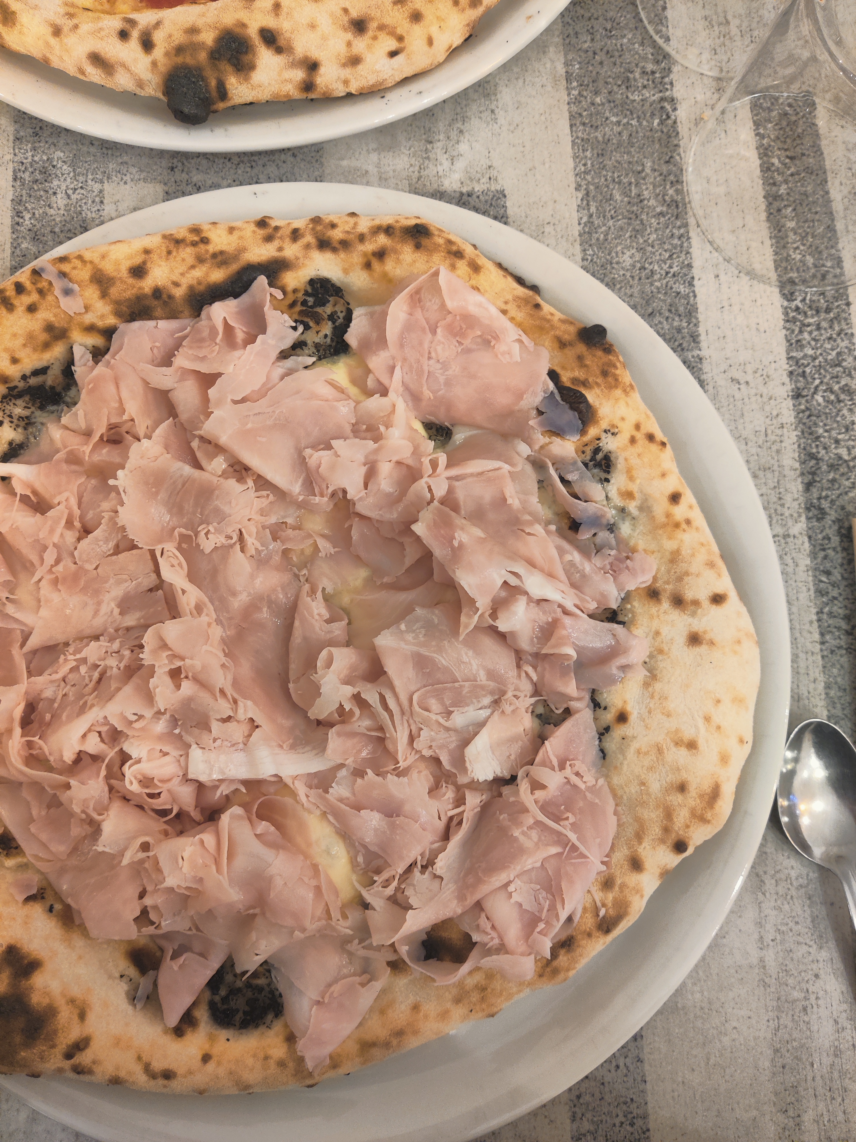 Les pizzas sont succulentes !!! Et je suis devenue très difficile en matière de pizzas ! Une pâte au top, au bon goût du feu de bois. Le vrai jambon italien est mis à profusion et tranché très fin. Le goût se développe beaucoup. Les légumes grillés sont très bons. C’est un vrai régal ! Vous nous reverrez quand on retournera dans la famille ! Et cette fois on amènera aussi la mamie/voisine de Blsmon. 😉