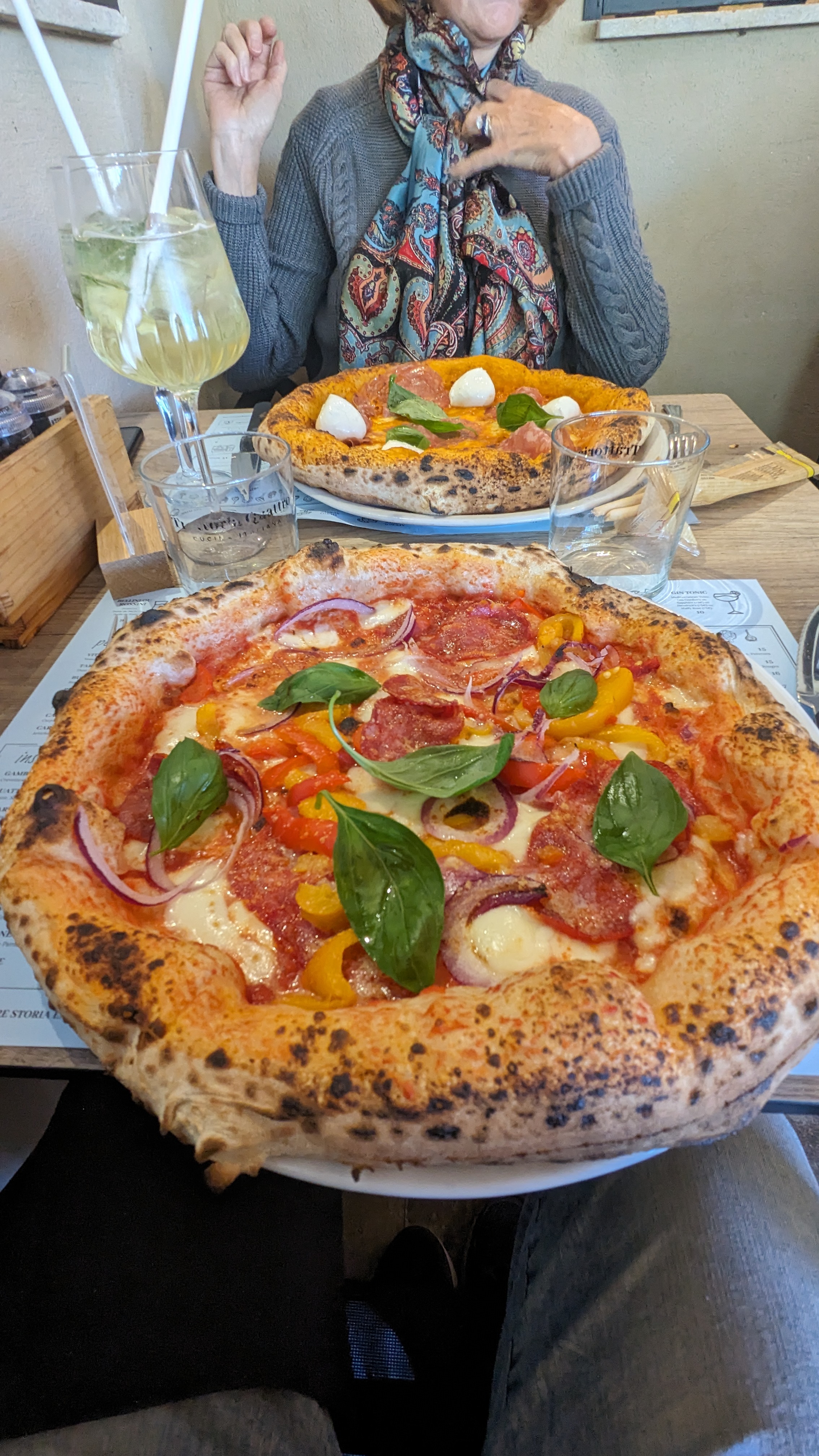On a testé à l'improviste. Parking ok. Puis à table, calé dans l'allée du milieu, derrière un imposant pot de fleurs, dans le passage des serveurs. Le service est rapide. Ils sont nombreux. Une bière, une pizza, un dessert= 30€. Les pizzas sont énormes avec ces grosses boursouflures de pâte. Fana des pâtes fines vous serez malheureux. Elle m'est restée sur l'estomac. Une 4 fromages me direz c'est normal d'être grasse et très salée. Ben non pas partout. La musique et le bruit de la salle couvre quasiment le bruit de la route. Bref rien de fou, avis mitigé pour l'instant. Pas de coup de coeur.