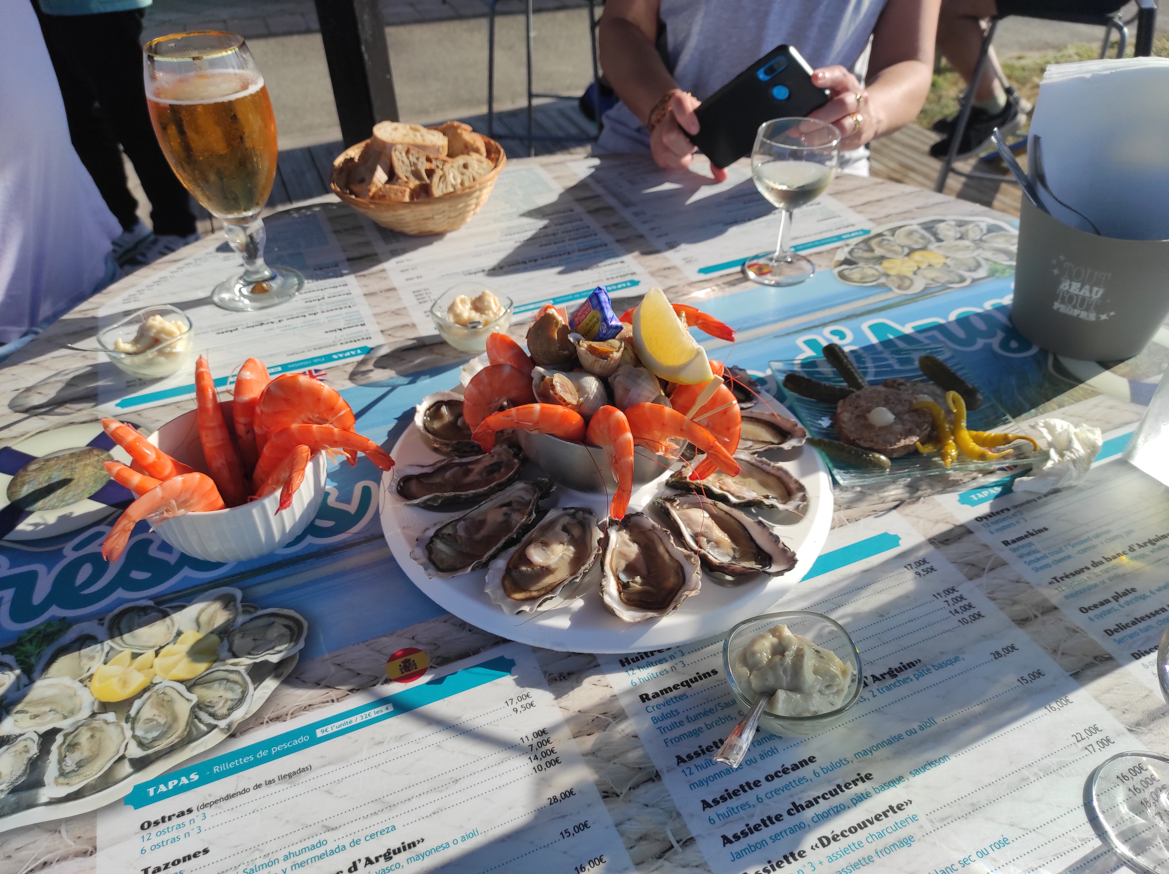 Assiette Trésors du banc d Arguin avec huîtres, crevettes, bulots, pâte basque et aioli... et assiette de fromages...Produits de qualité. Accueil chaleureux et souriant... Je recommande !!