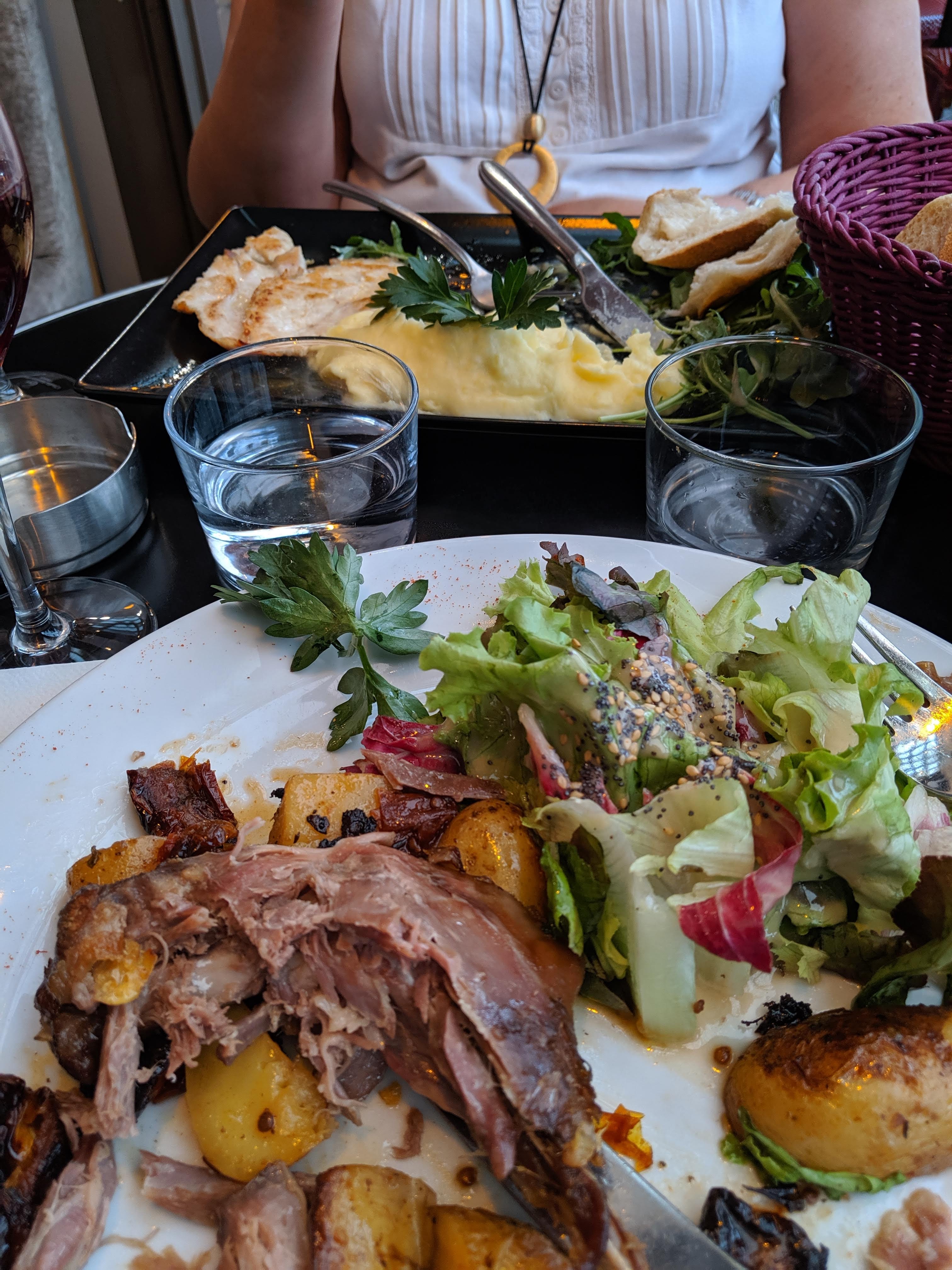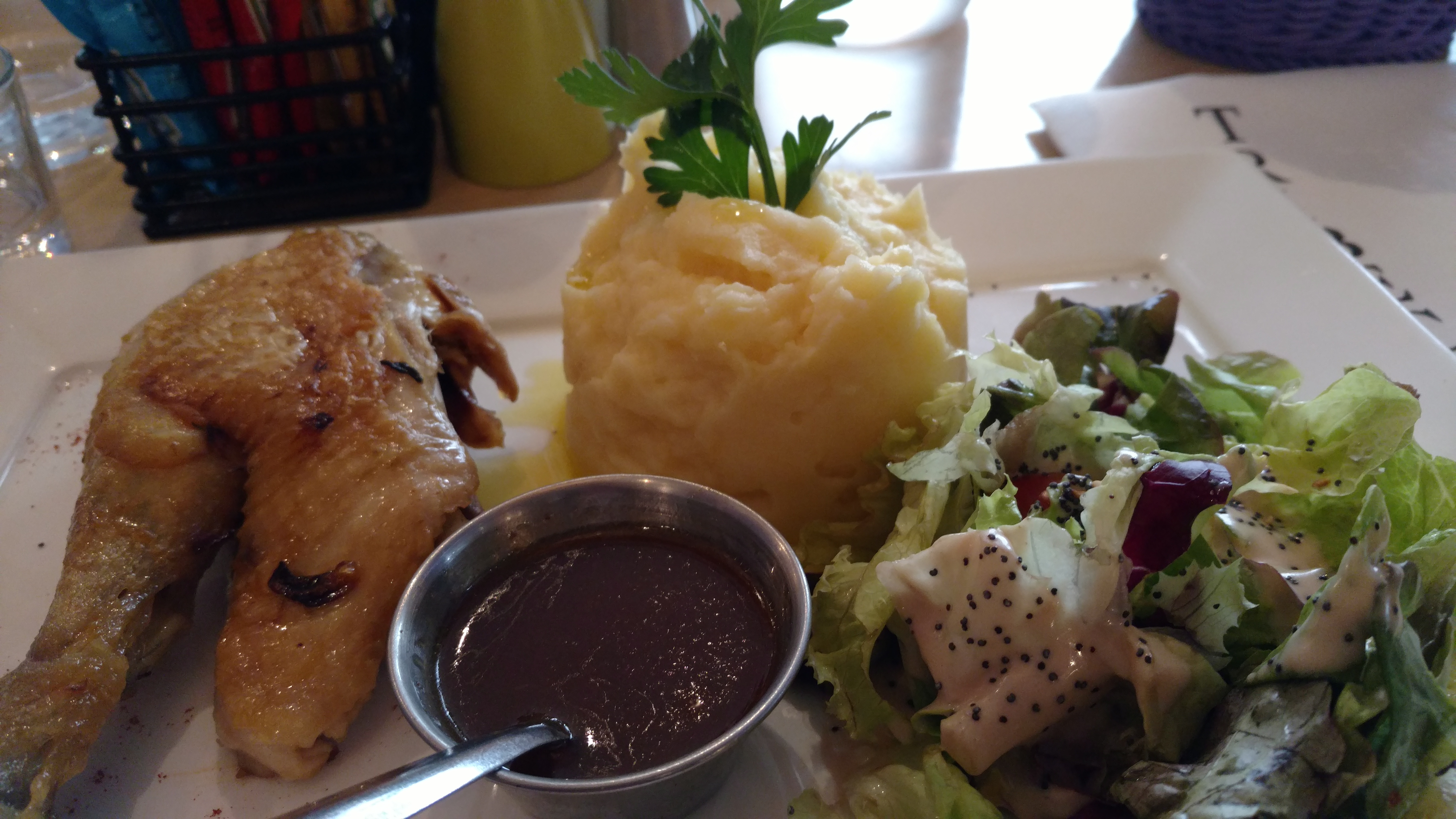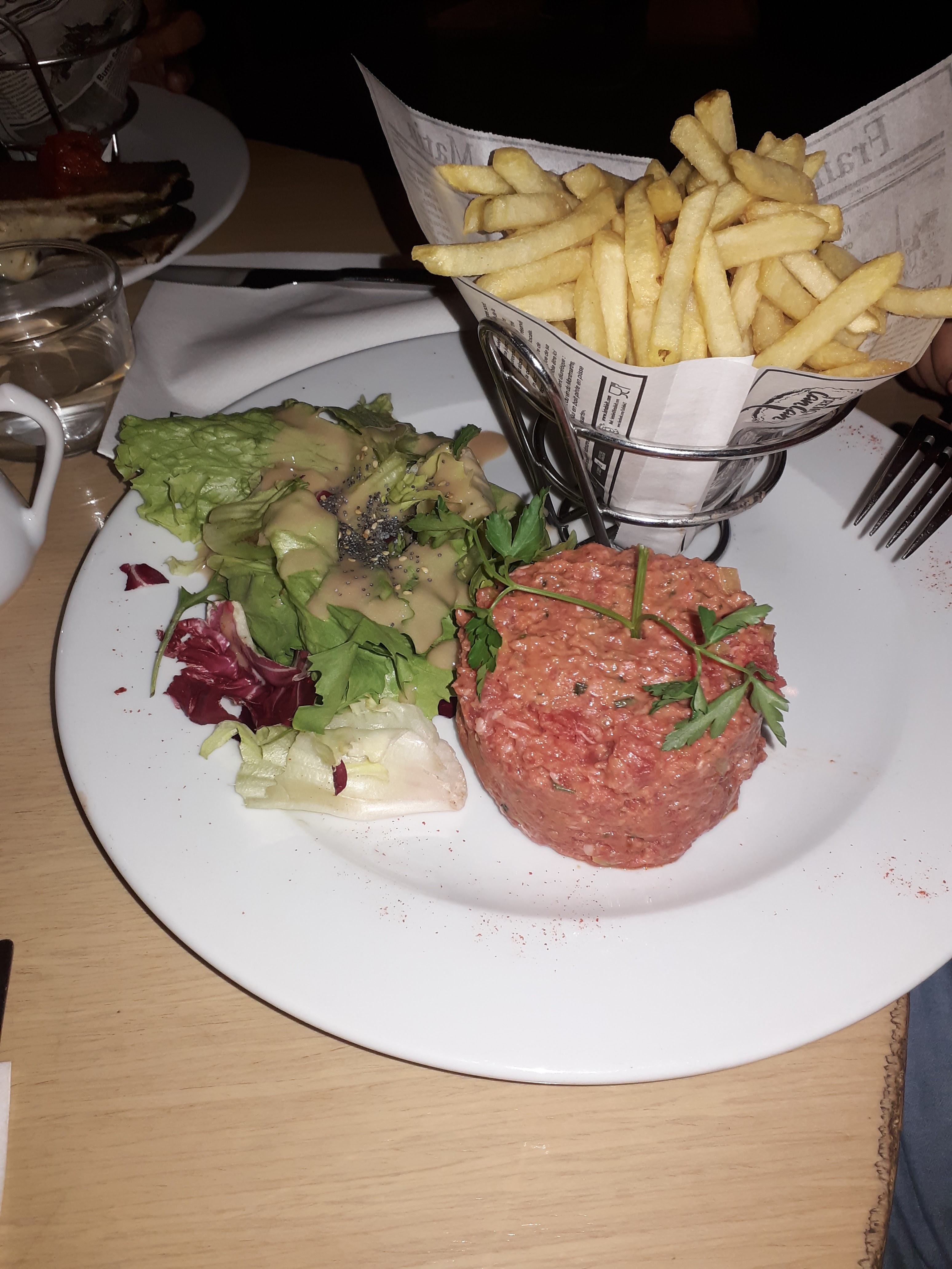 Le repas était bon. Le service était... il était un peu impoli jusqu'à ce qu'il réalise que je parlais aussi français. Nous nous sommes assis à côté de gens qui fumaient. Alors, la leçon apprise, restez assis à l'intérieur pour éviter cela et le drame des gens.