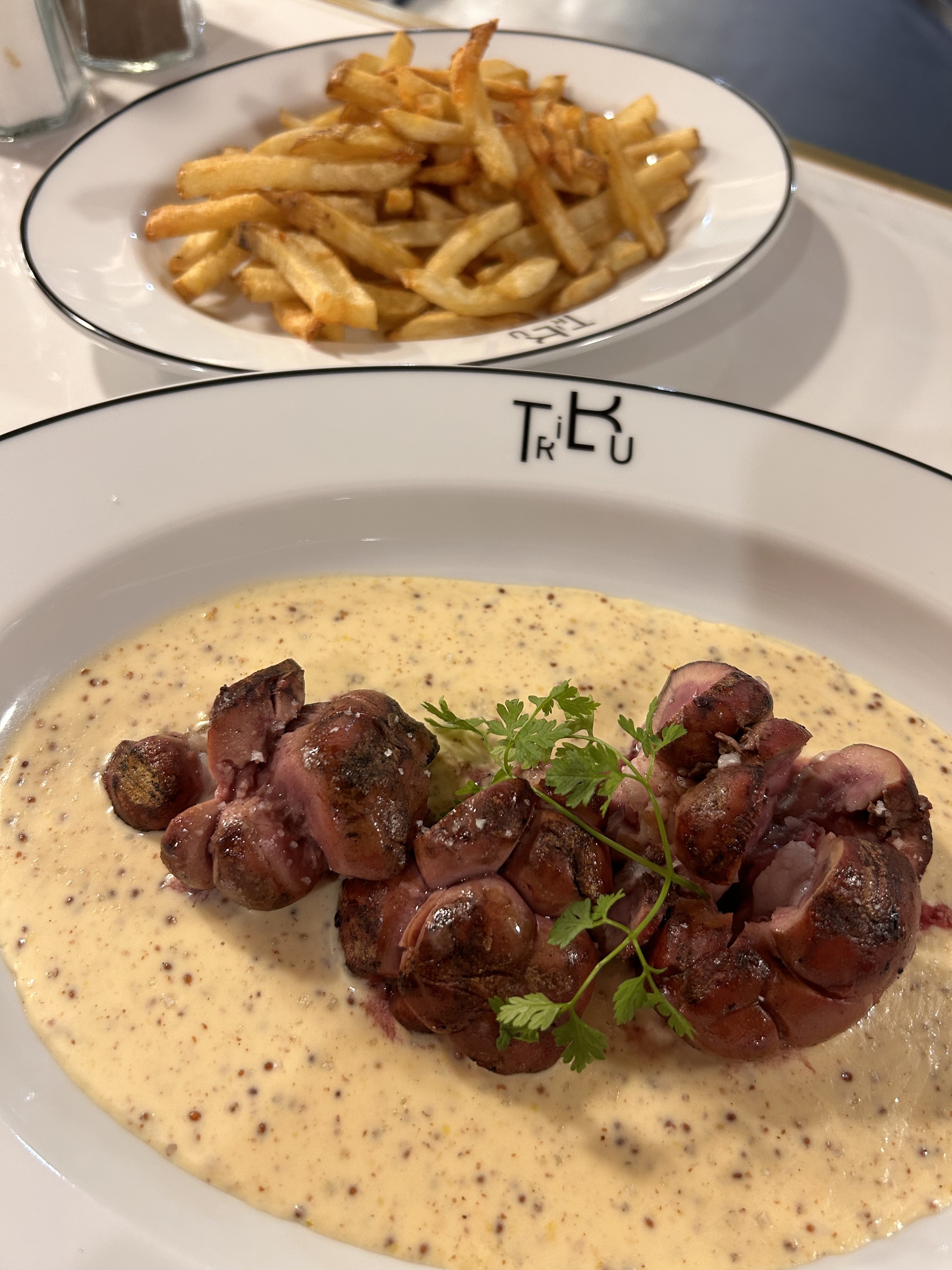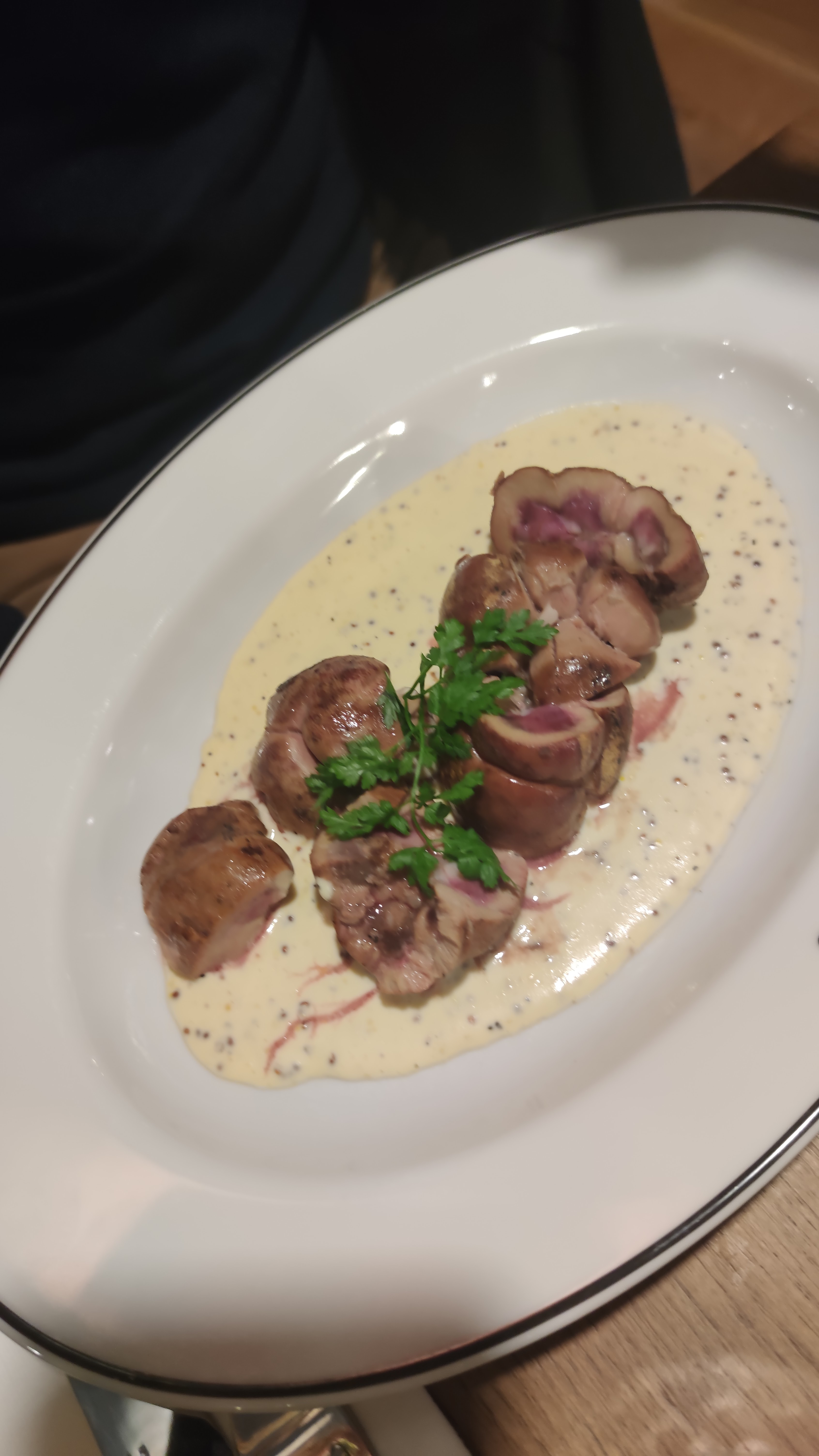 Conforme à mes attentes, ambiance sympa, pas de pression , le personnel (très gentil et pro ) nous a laissé le temps… Très bonne qualité de plats. Bons vins également. Merci ! Continuez…