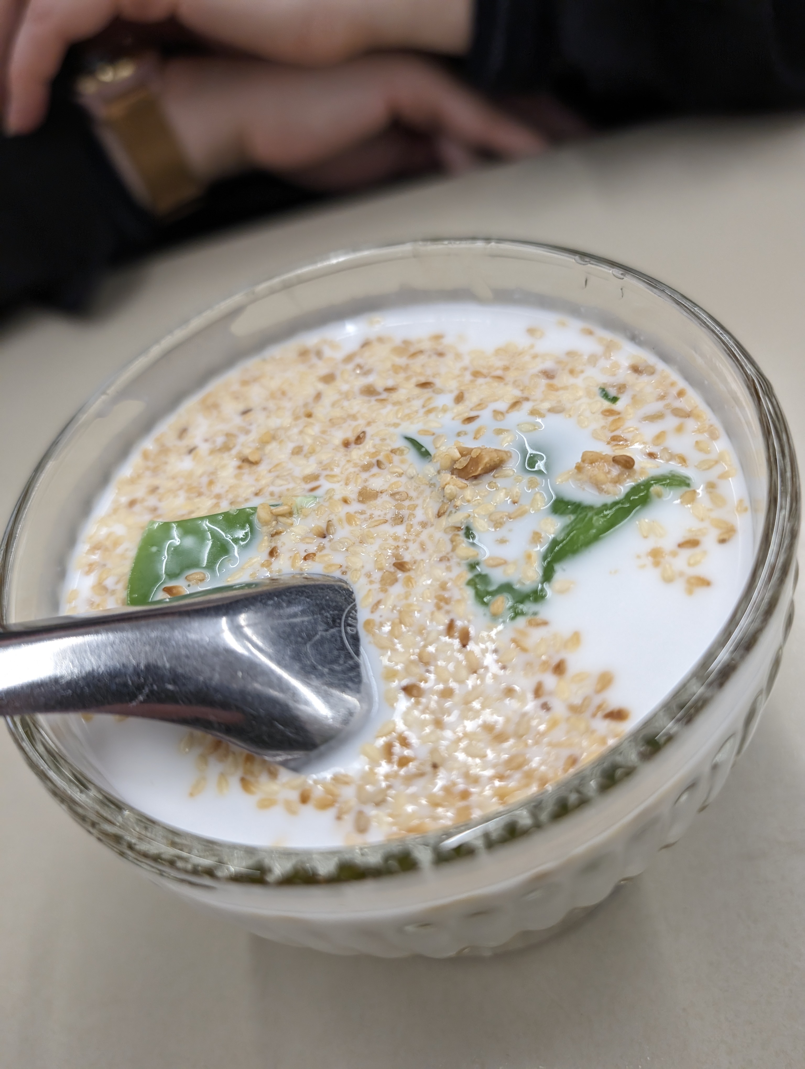 Restau très sympa qui sert en continu. Nous étions 6 personnes, c'était samedi dernier, il était 14h30 passé ! Pour si nombreux, il est préférable de réserver. Ambiance décontractée, bcp de monde et pour cause. Je pense qu'à l'heure du déjeuner, ça devait ressembler à une ruche ! Nous avons aimé la soupe aux crevettes sans nouilles et son bouillon, très consistant, presqu'un plat à elle toute seule. D'autres ont pris des raviolis vapeur, puis un mélange tranches porc et canard laqué servis sur un lit de riz blanc. Pas tout mangé. A la fin du repas, nous avons demandé à pouvoir ramener le reste de riz blanc et les raviolis. Desserts classiques pour les uns et les autres. En ce qui me concerne, j'ai essayé un dessert servi dans une coupelle servi tiède dans lequel il y avait du lait de coco mélangé avec du caramel et une gelée verte que je n'ai pas déterminé, c'était bon et original. Malheureusement je ne me souviens pas du nom de ce dessert.