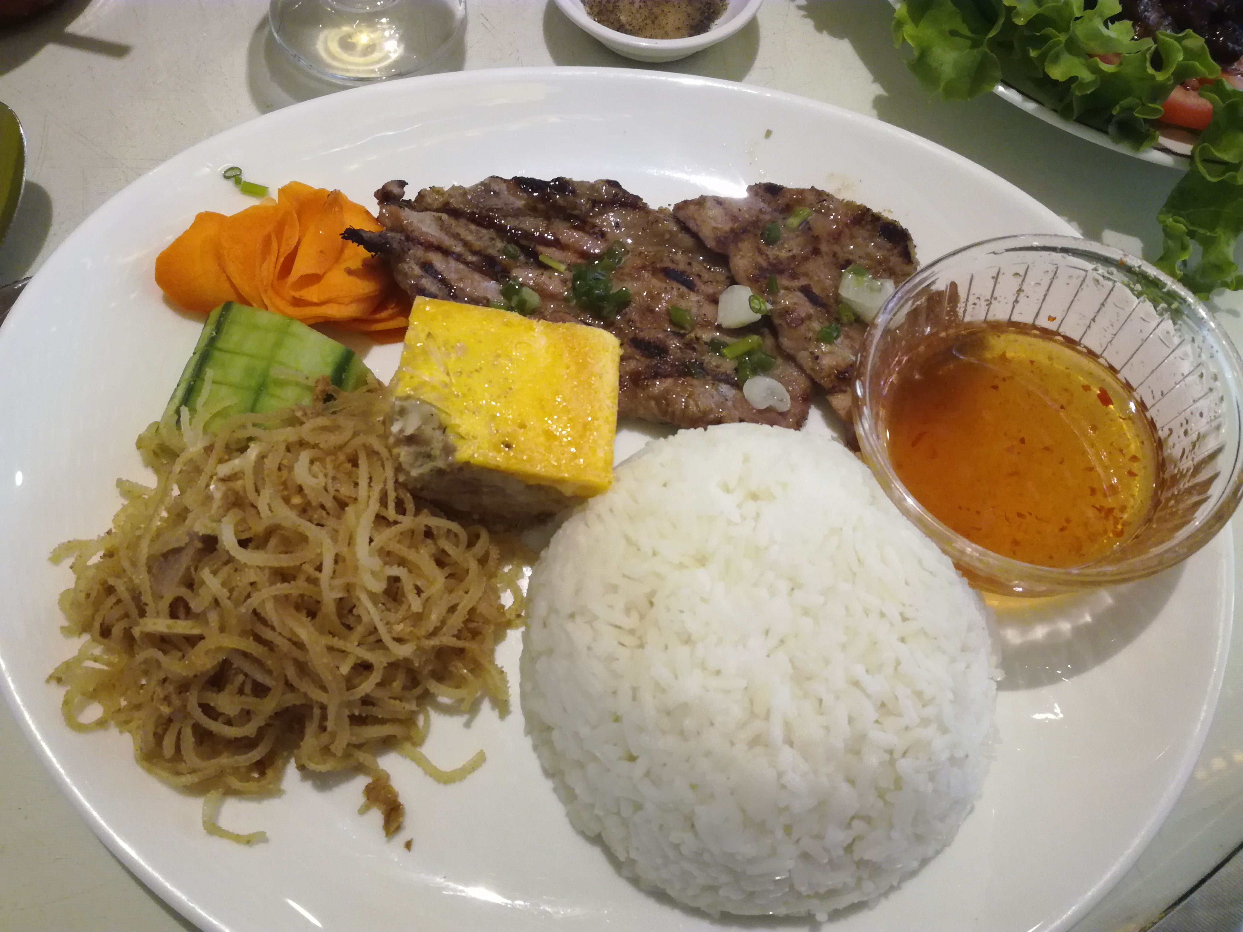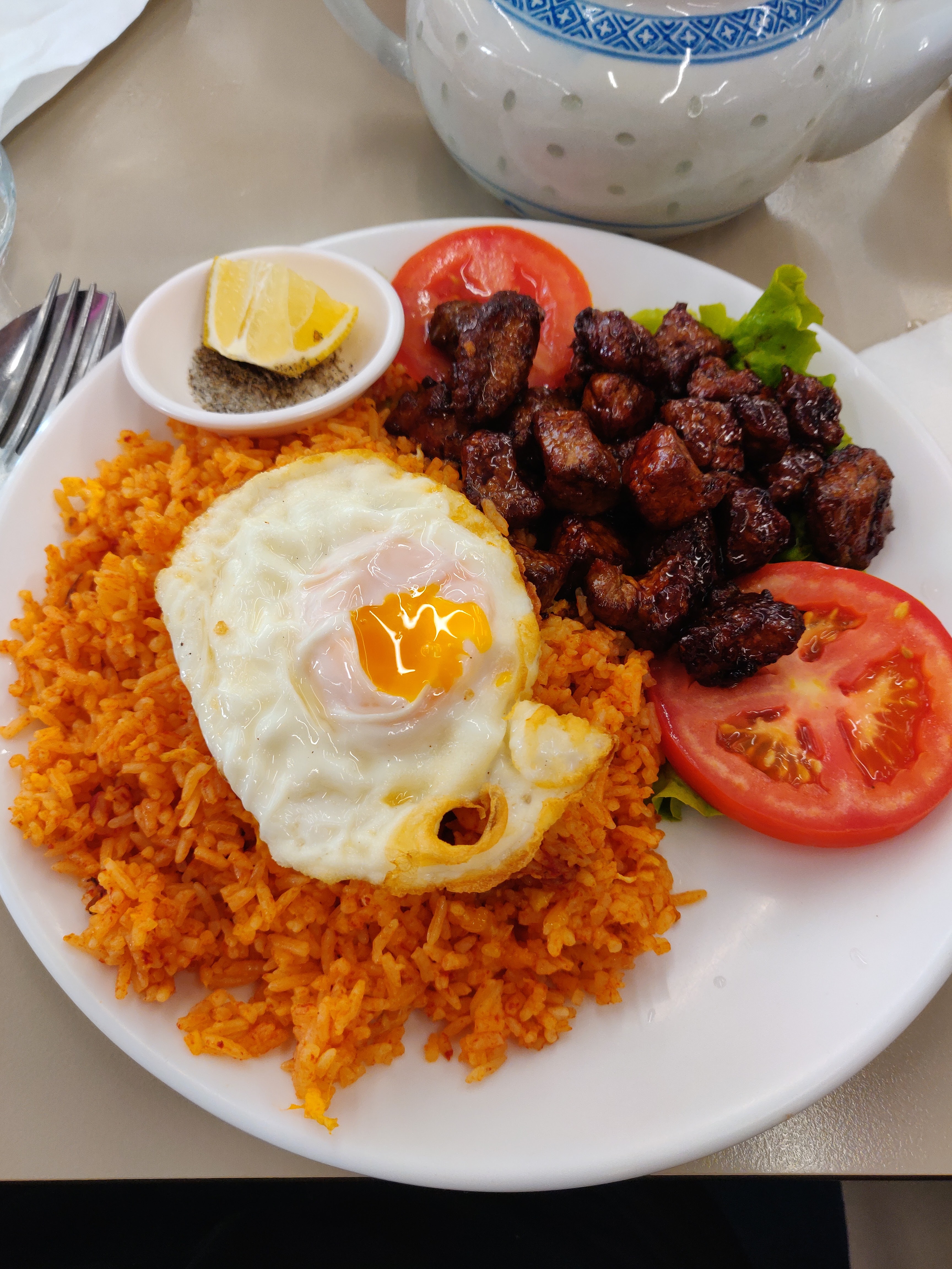 Le boeuf loc lac (avec ou sans riz) est fade, le riz avec émincé de porc côtelette de porc et le petit morceau de terrine de poisson était bon mais sans plus.