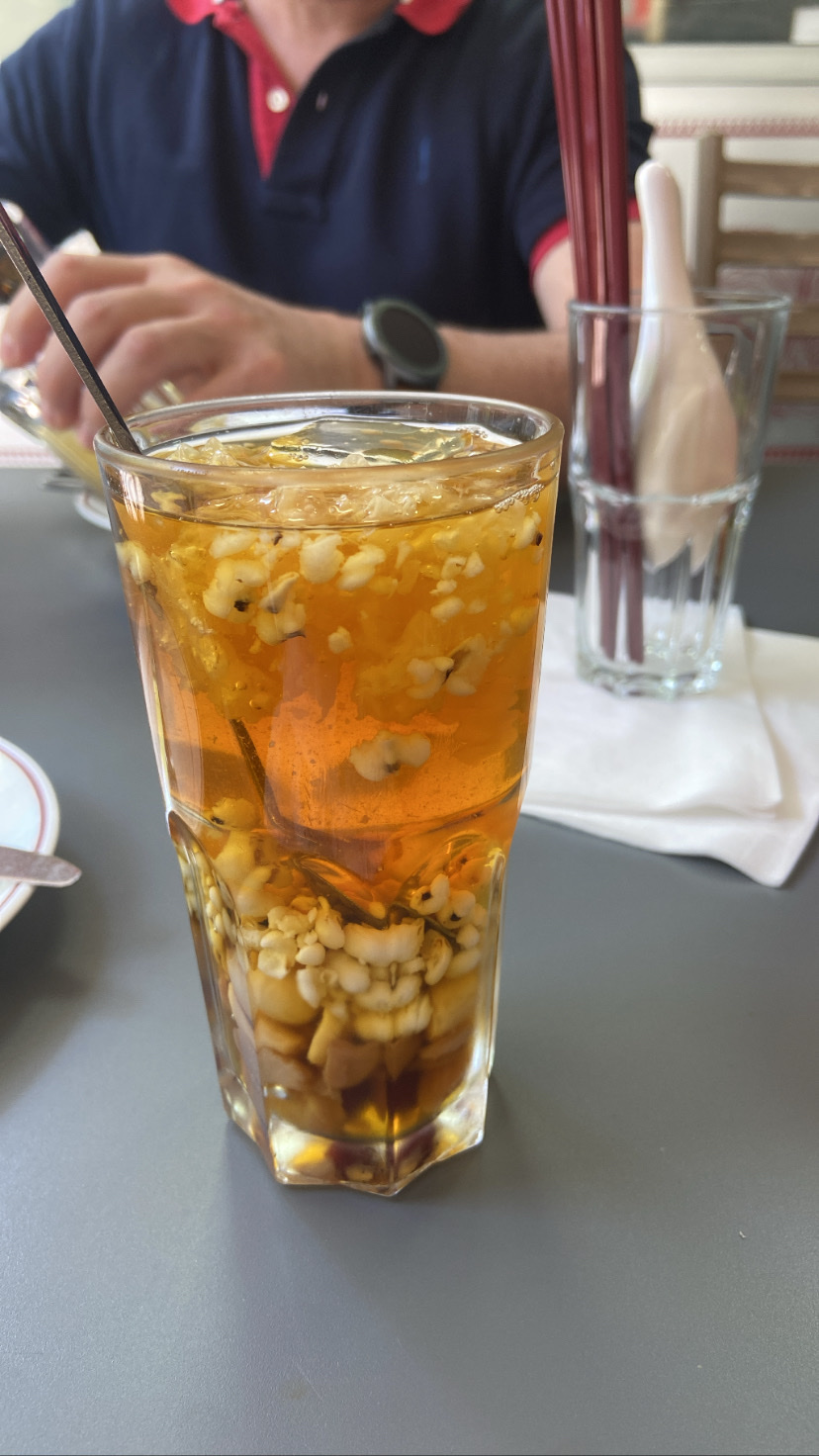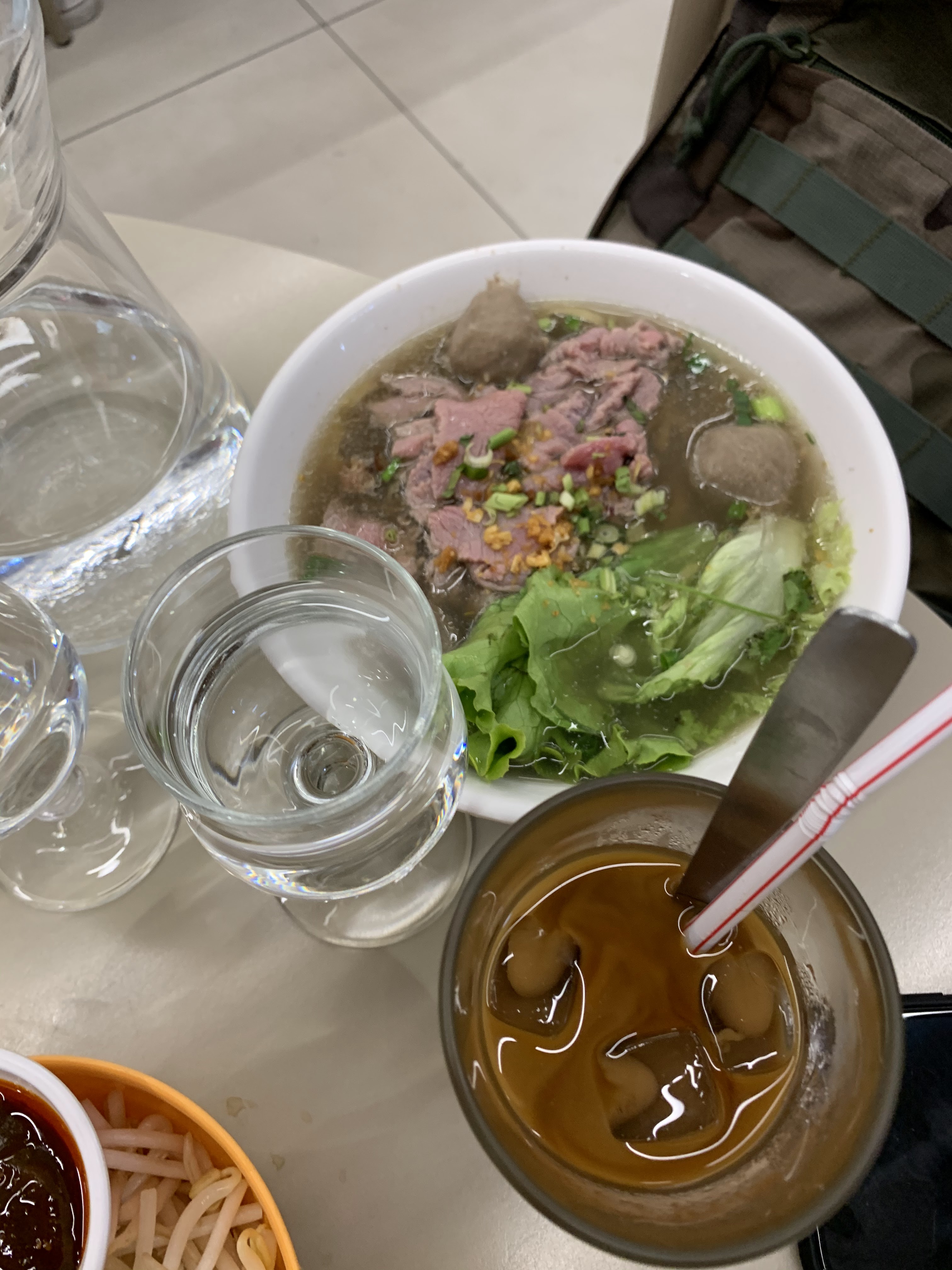 Peu d'options végé et non HALAL donc j'ai opté pour une soupe de nouilles aux Raviolis crevettes. Bouillon brûlant et goûtu comme j'aime ! + thé au citron en carafe un TOP