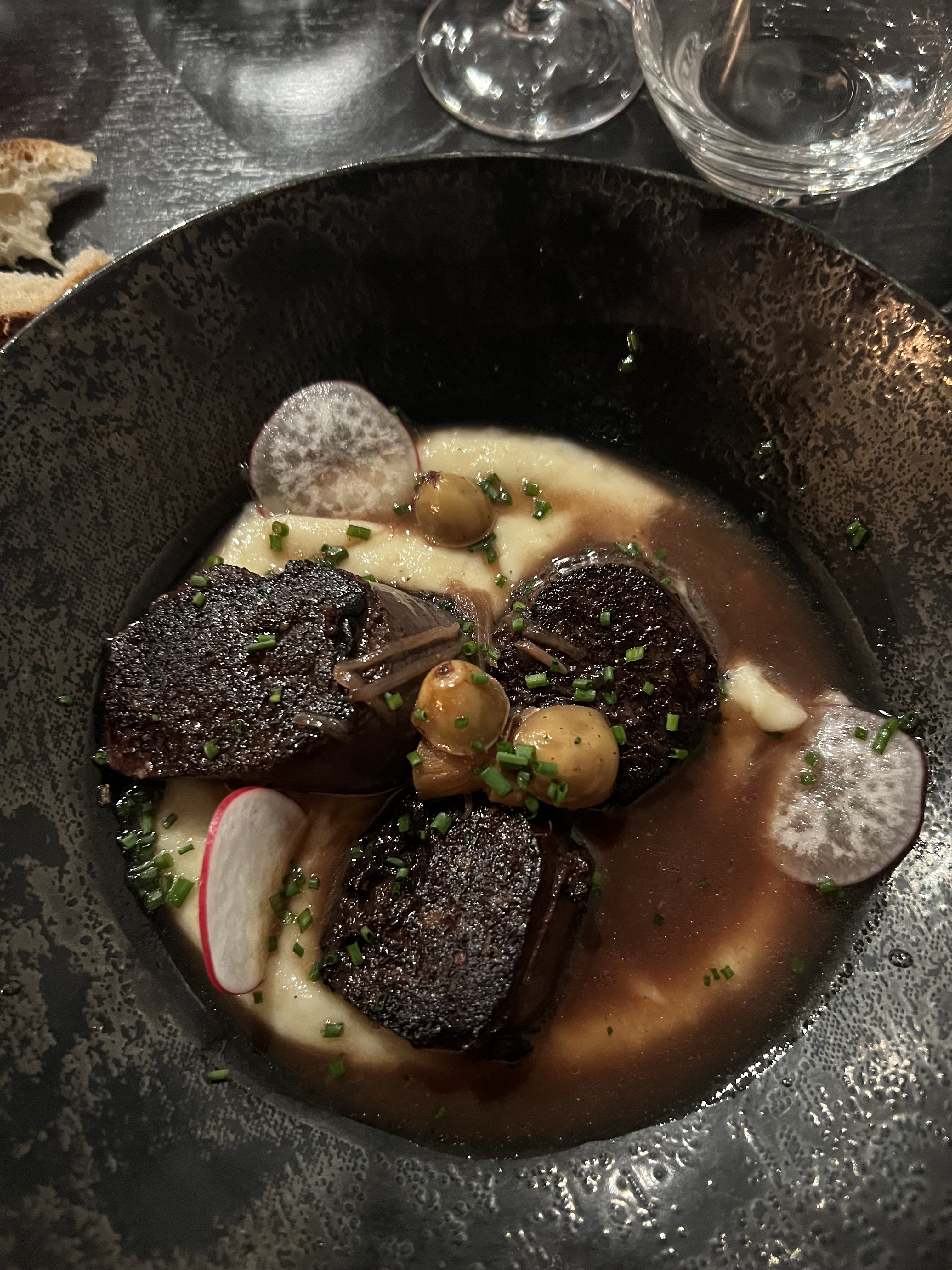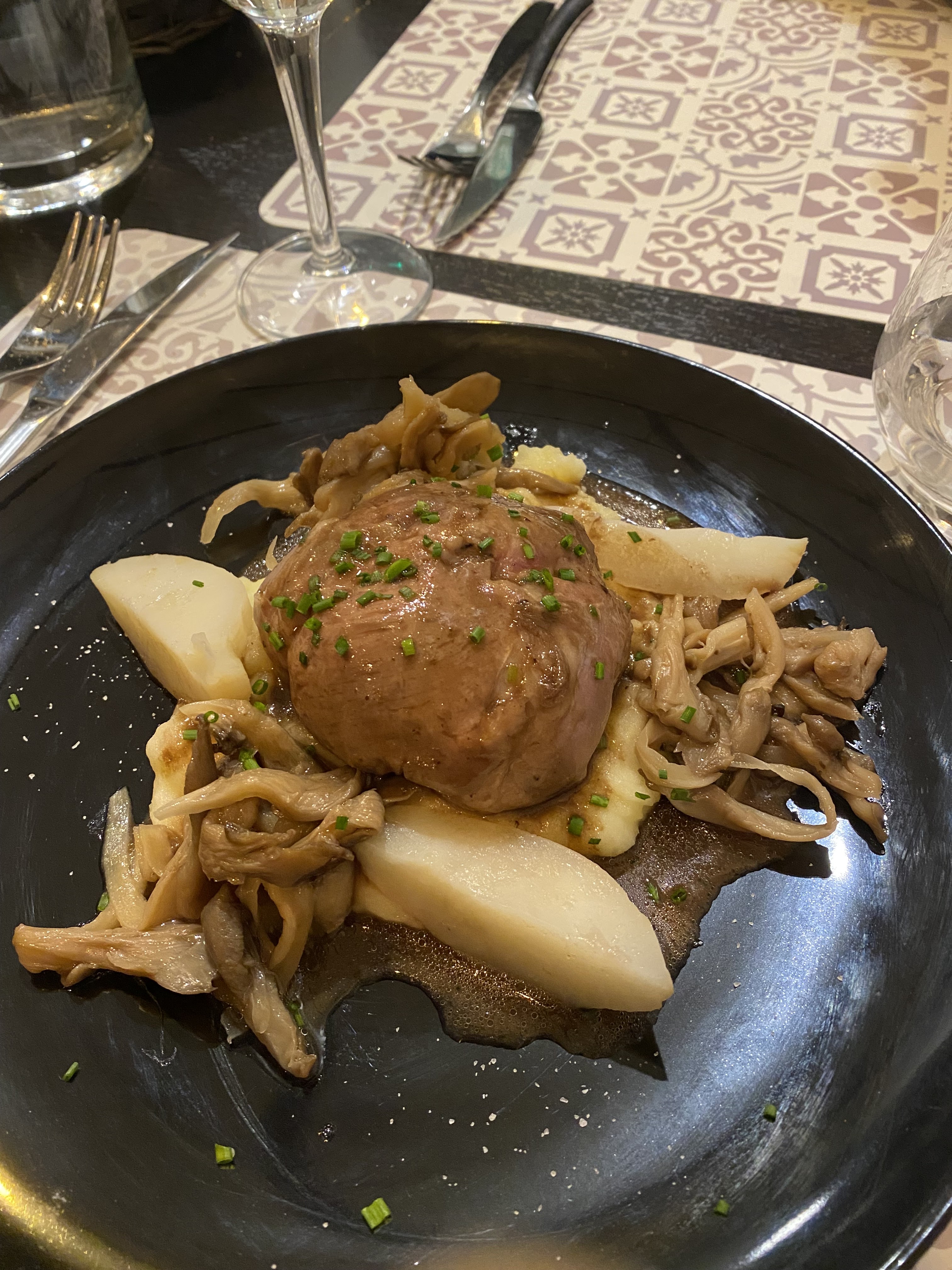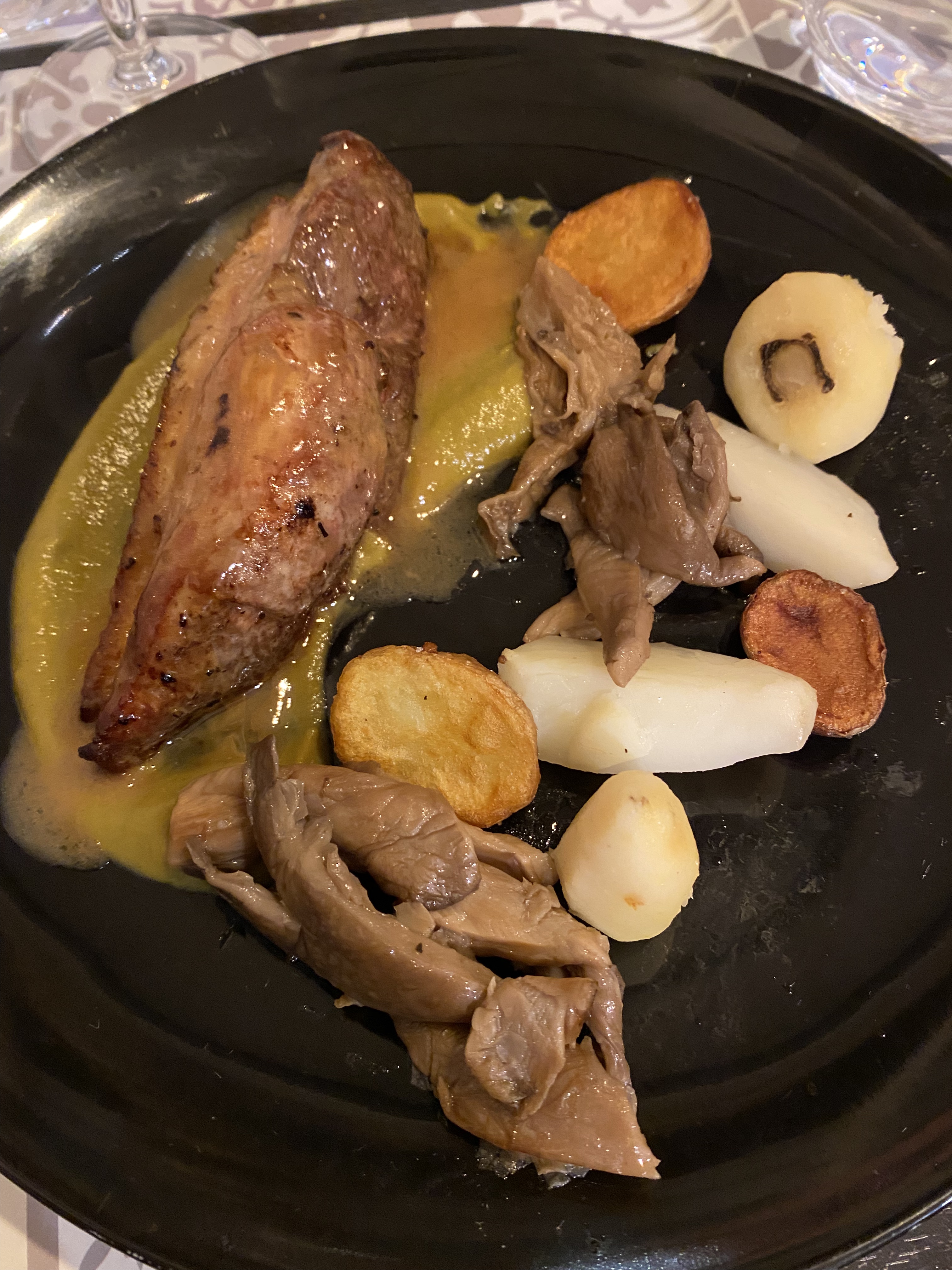 Soupe de lentilles gouteuse mais un peu trop épaisse et surtout servie dans des assiettes froide avec le résultat évident! Pithiviers de porc un peu trop sec à mon goût servi avec une portion radine de purée de pomme de terres. Ambiance et service tout à fait bien...
