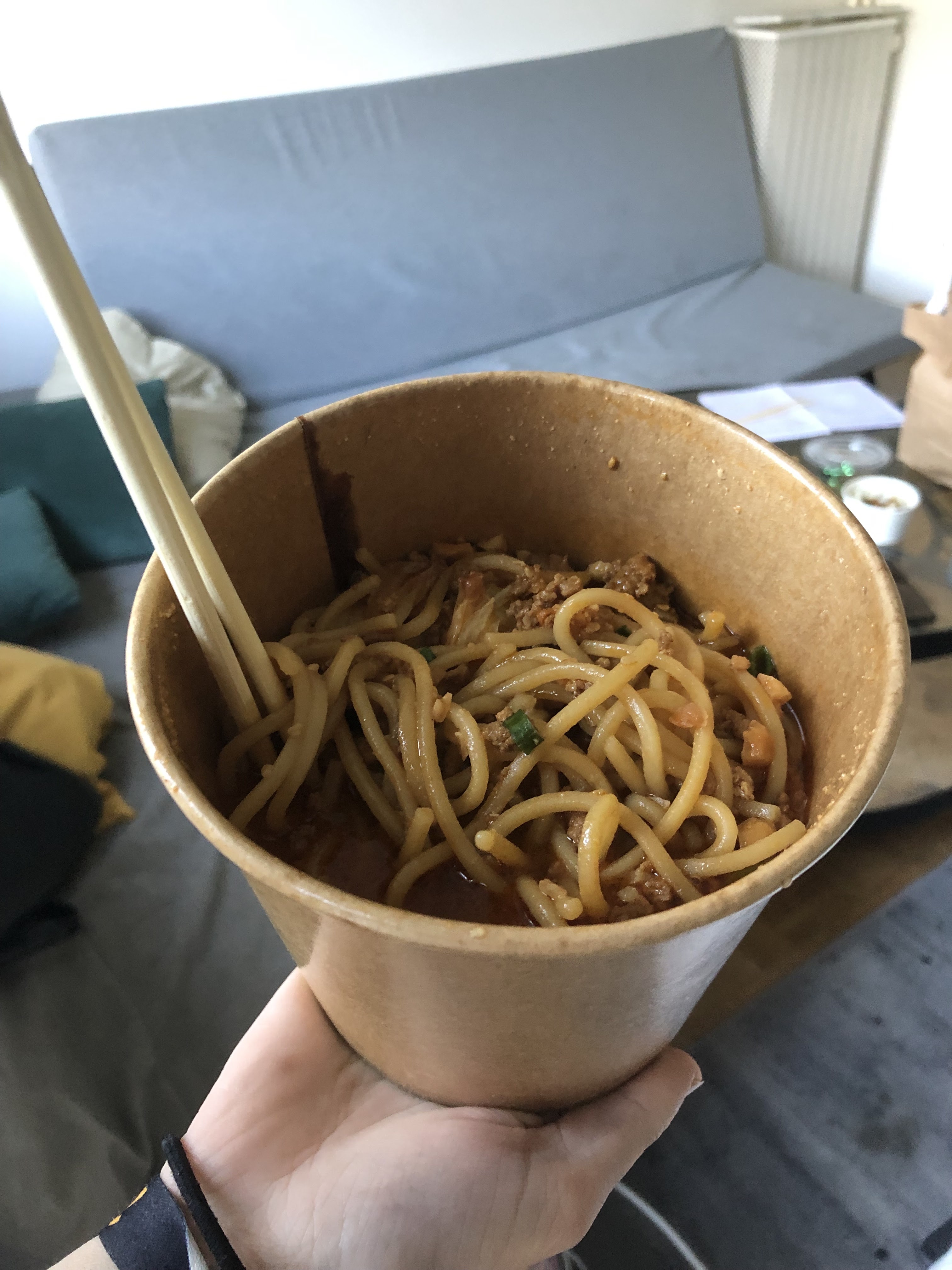 Commande sur une plateforme de livraison : nouilles dan dan et raviolis au porc, un délice! C'est parfumé, relevé, on sent que les produits sont frais, c'est divin!
