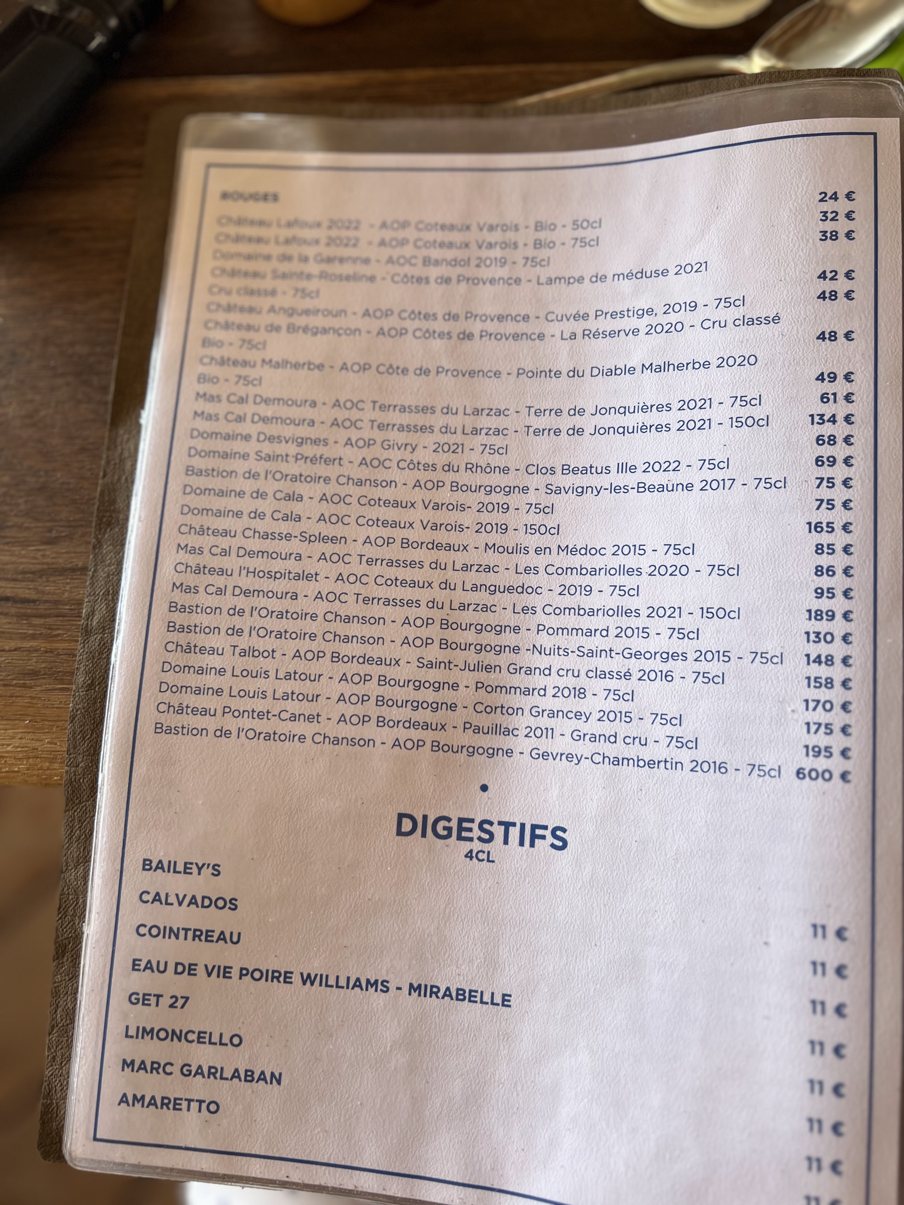 Un peu (trop) cher, mais peut être compréhensible au vue du cadre idyllique. Carte assez restreinte mais c'était bon ! Entrecôte + frites : 36€ Coca : 5€ Mousse au chocolat (pour deux): ~22€ Les serveurs s'emmêlent un peu les pinceaux parfois mais sont très courtois et polis. Avis personnel : la mousse au chocolat pour deux est bonne mais peut-être un peu trop grosse (même pour deux !).