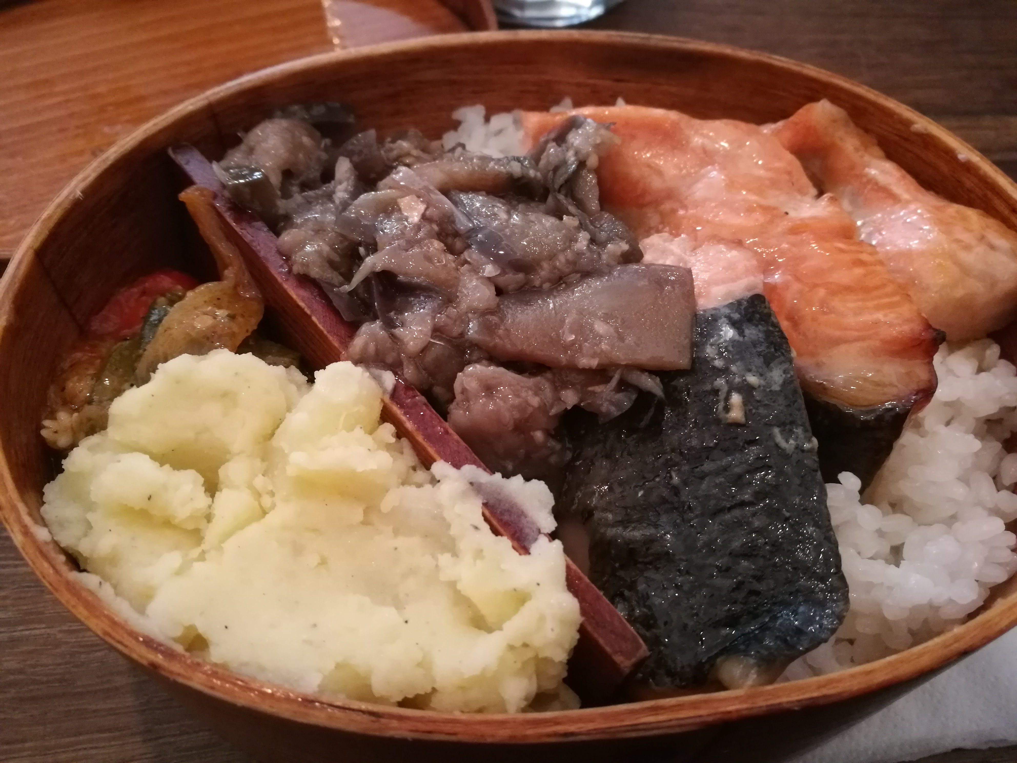 Bento délicieux ! J'ai pris le saumon avec ratatouille, pommes des terre at aubergine au miso. Tout était super bon
