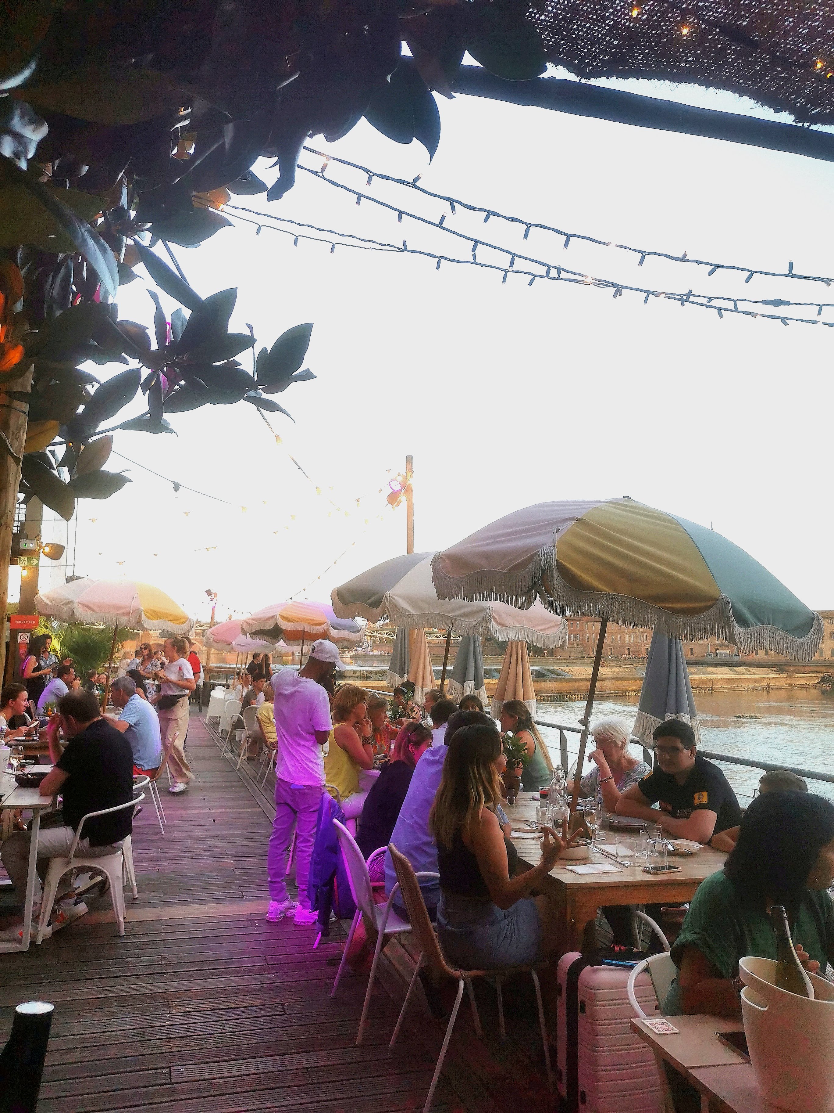 Le lieu est plutôt sympa, à côté de la Garonne. Toutefois une mauvaise expérience. Je me suis aventurée sans réservation un dimanche midi en pleine chaleur. Les parasols sont très jolis mais ils ne protègent en rien du soleil. Concernant les mets proposés j'avais le choix entre le brunch ou une proposition de plats chauds à des prix prohibitifs. J'aurais apprécié de pouvoir manger quelque chose de désaltérant, qui puisse me permettre de me sentir bien et non de devoir manger un plat de viande, pas adapté au temps caniculaire et dont la qualité était moyenne. Je ne me suis pas attardée après le plat. Je suis allée manger une petite glace un peu plus loin dans un lieu plus abrité. Peut-être que cette expérience aurait été autre si j'y étais allée un soir où la totalité de la carte semble être proposée.