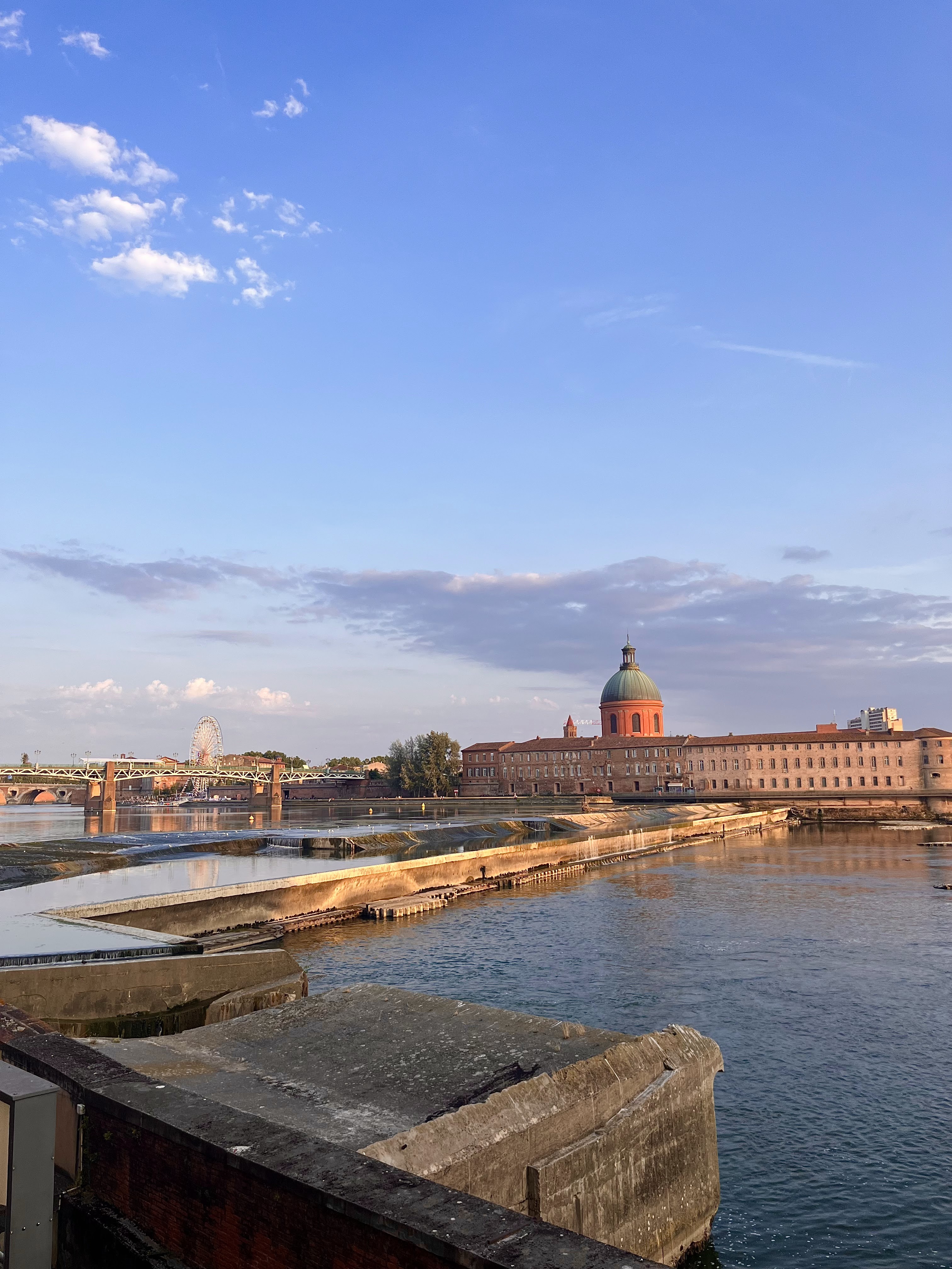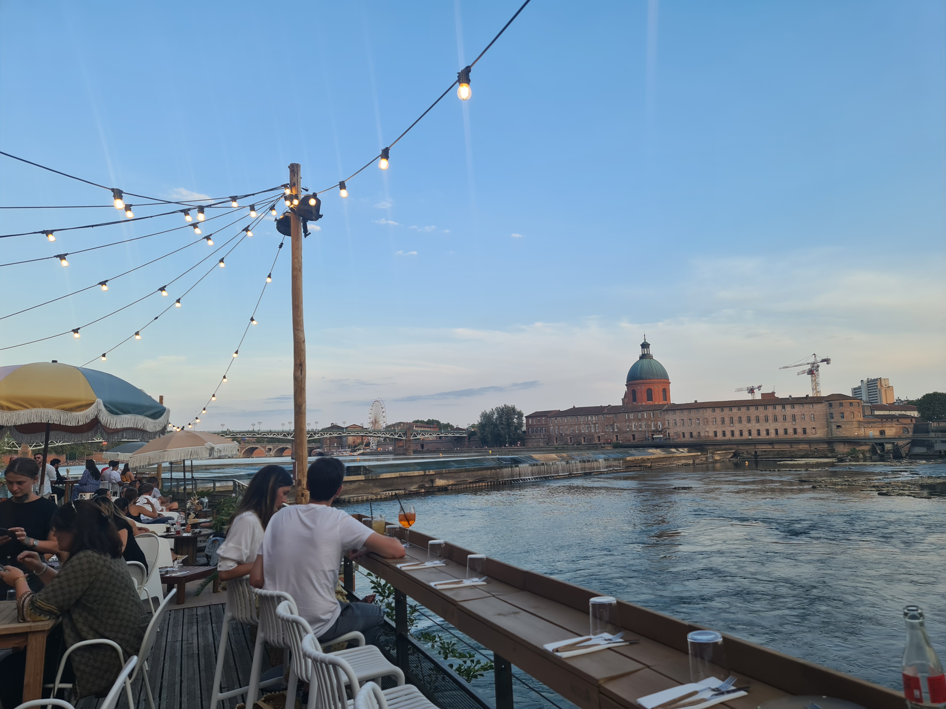 Endroit juste magnifique, en bord de Garonne avec une vue superb sur le dôme. Personne accueillant, souriant et très agréable. Service un peu long mais rien de méchant. Petit point négatif les prix sont élevés 12€ un cocktail, et très peu de choix en therme de plats dans la carte.