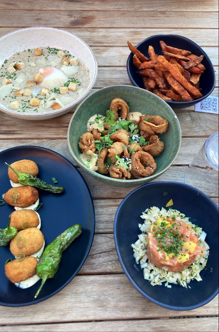 J'ai adoré cet endroit ! J'ai fait une réservation pour le déjeuner (pour information, ils prennent les détails de votre carte de crédit pour vous facturer 30 $ en cas de non-présentation - ce qui me convient parfaitement). L'emplacement est génial, les sièges en plein air avec une légère couverture sont également excellents, mais surtout, la nourriture était fantastique. J'adore les endroits à tapas parce qu'on peut essayer beaucoup de choses différentes. Nous avons commandé 4 plats et cela s'est avéré suffisant pour 2 personnes. Le point fort pour moi personnellement a été le gravlax de bœuf (fines tranches de bœuf fumé salé) aux pistaches et glace au wasabi ! C'était la première fois que j'essayais quelque chose comme ça et c'était très bien. Mon deuxième favori était la fleur de courgette frite. J'ai même aimé leurs aubergines, même si elles contenaient certaines épices orientales dont je ne suis généralement pas fan. La burrata aux tomates et aux fraises était mon plat le moins préféré – j’ai l’impression que les fraises étaient un peu écrasantes et ne s’accordaient pas bien dans l’ensemble. J'ai pris un café gourmand pour le dessert et j'ai pu goûter différentes sortes de pâtisseries + café + glaces. Dans l'ensemble, ce fut une très bonne expérience. P.S. Les animaux de compagnie ne sont pas autorises.