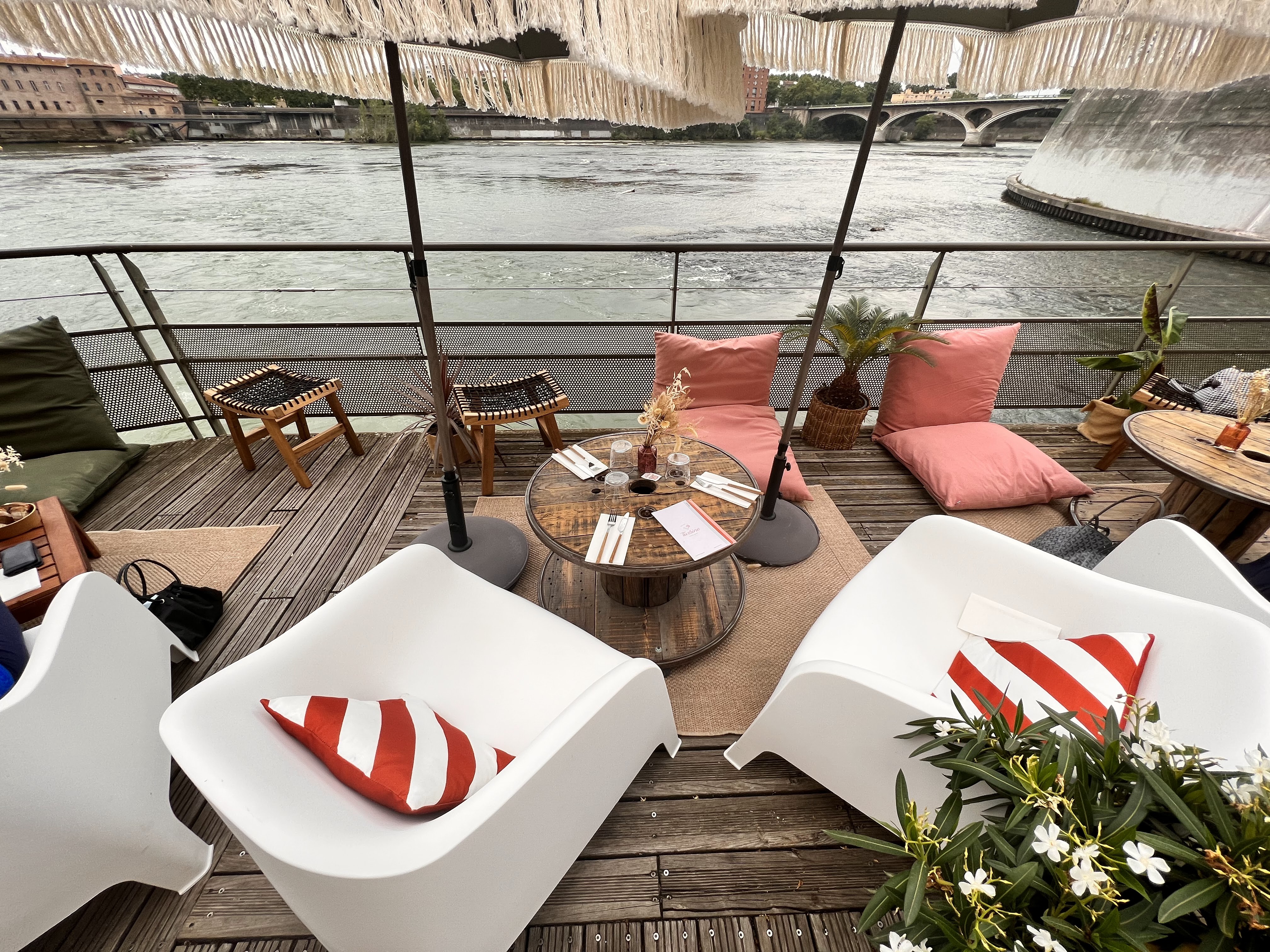 Le cadre est parfait, la vue est superbe et la proximité de la Garonne très sympa surtout avec la chaleur actuelle. Concernant l'accueil rien à dire, le personnel est sympa et très disponible. Les cocktails sont très bons. Le service est rapide également, pas trop d'attente. Petit bémol sur la cuisine, nous n'avons pas trouvé la carte assez étoffée et les tarifs trop chers vis à vis de la qualité proposée. L'endroit est tellement agréable que nous y reviendrons peut-être pour y boire un verre mais pas plus...