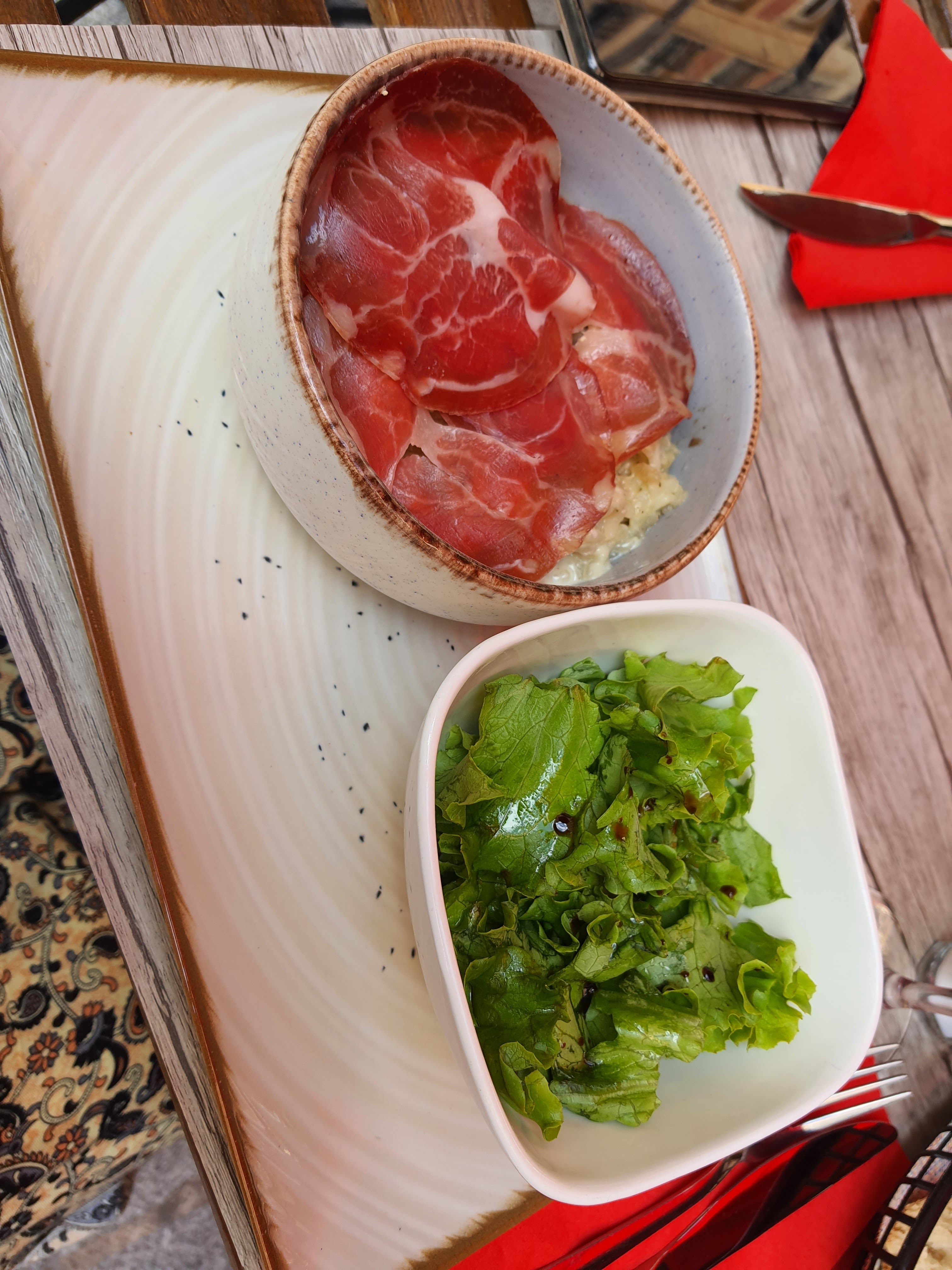 Alors pour commancer dans l'assiette de charcuterie il manque la moitié de ce qui est inscrit sur la carte et sans que mon soir informé par le restaurateur à 12 € l'assiette c'est se moquer du monde. Je suis d'accord avec l'autre avis cet de la nouriture de supermarché pas des produits en Provence d'Italie comme dit le restaurateur Bai aussi trop souvent à mon goût entendu le bruit de la porte d'un micro ondes....