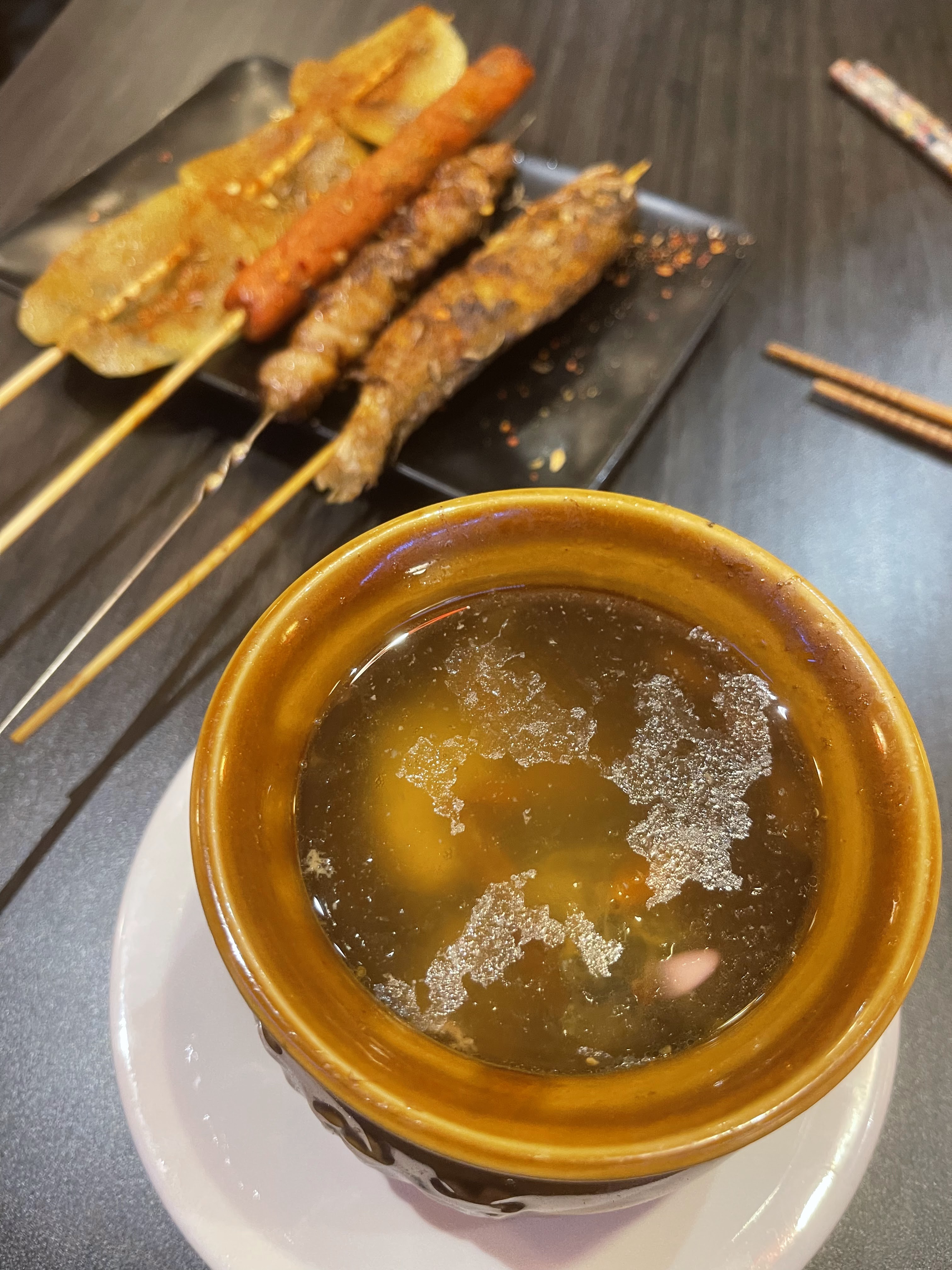 Les brochettes sont délicieuses ! Moyennement gras et fin, ni sec ni sec. Que diriez-vous d'essayer la soupe la prochaine fois.