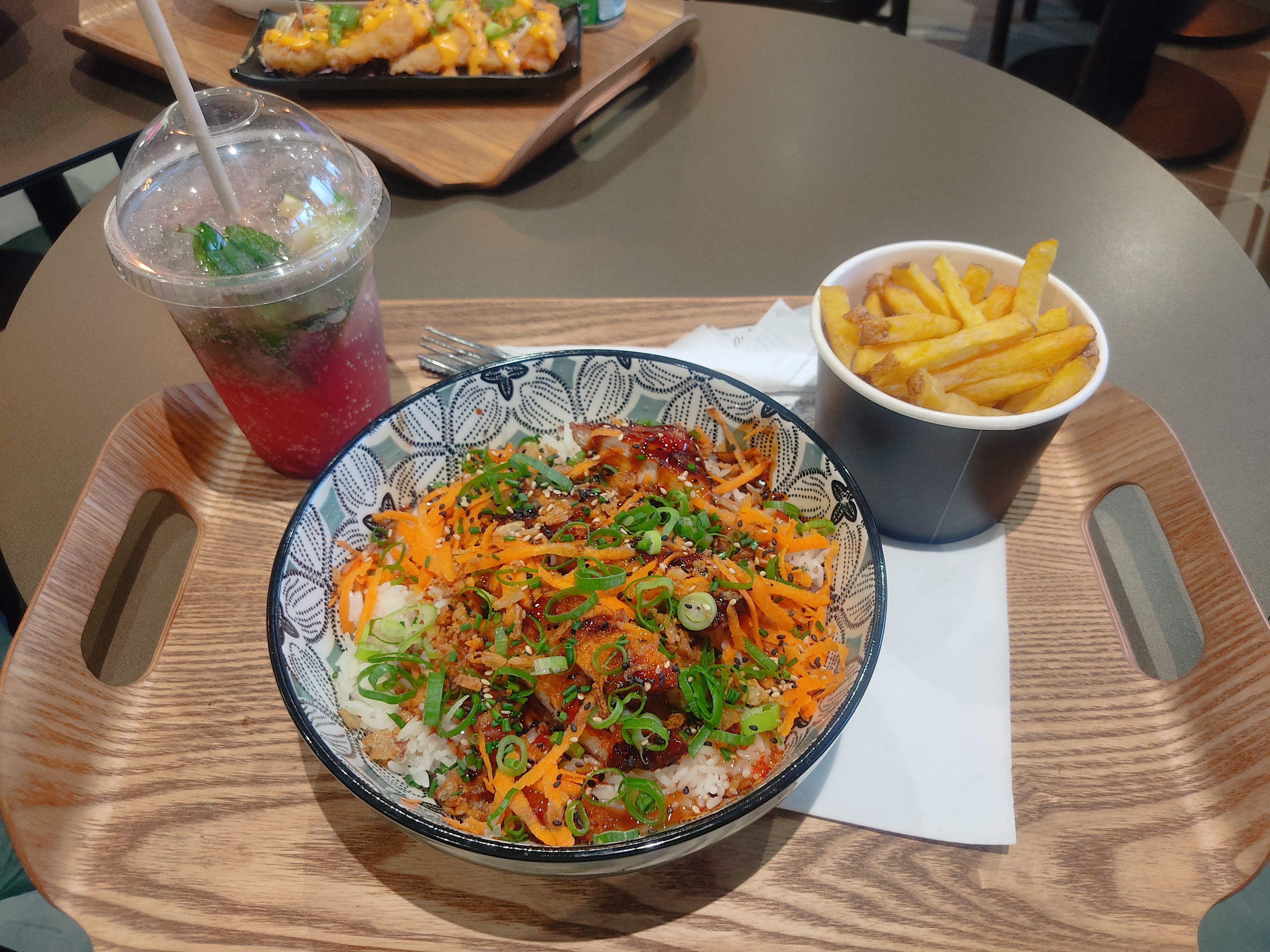 Vraiment surcotté!!!! Je ne recommande pas Payer un cocktail à 4,90 vraiment basique sans intérêt, eau + sirop et beauuuucoup de glaçons ! Prendre un bowl au poulet croustillant aussi fin qu’une feuille de papier, de plus j’ai eu l’impression de manger un riz froid rempli de sauce soja et sauce sweet chili.