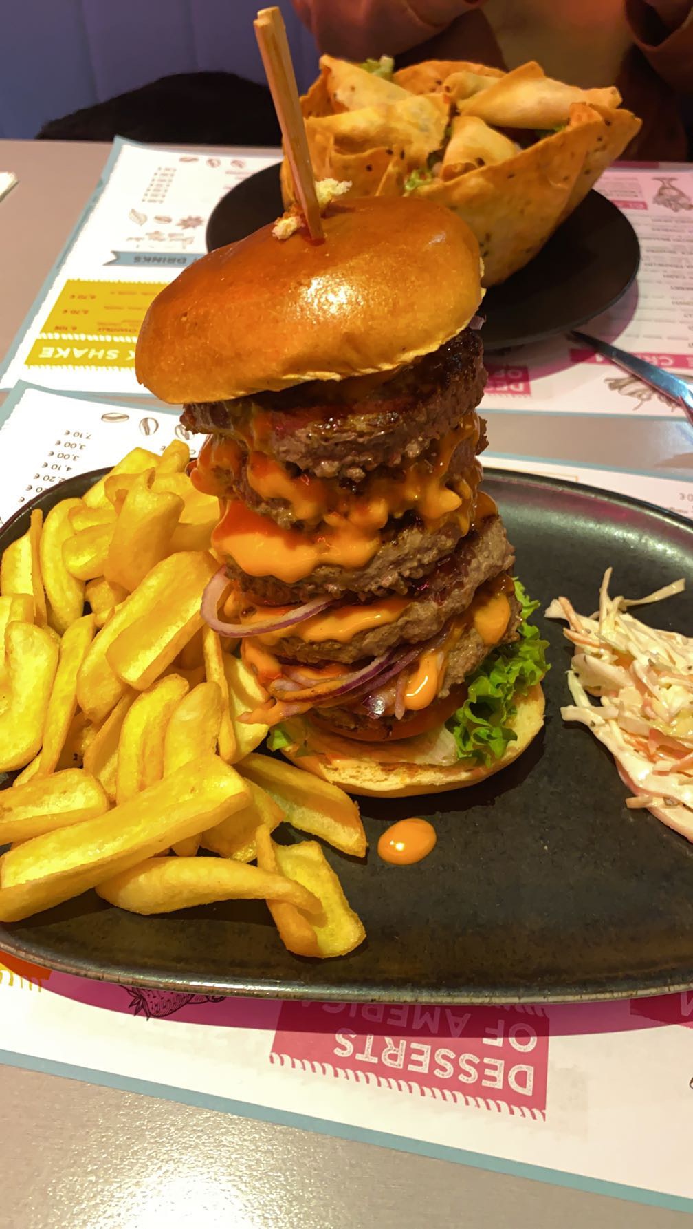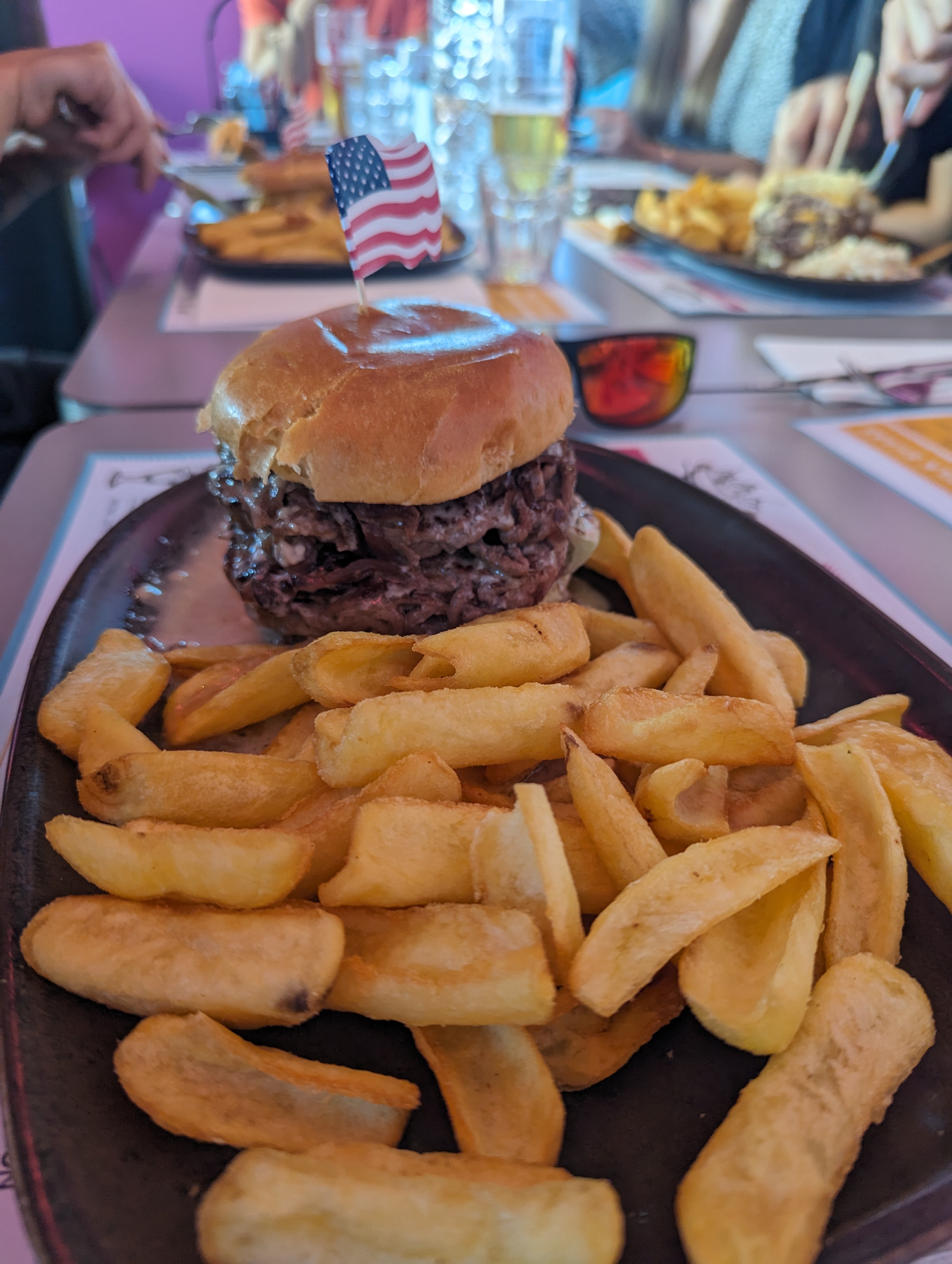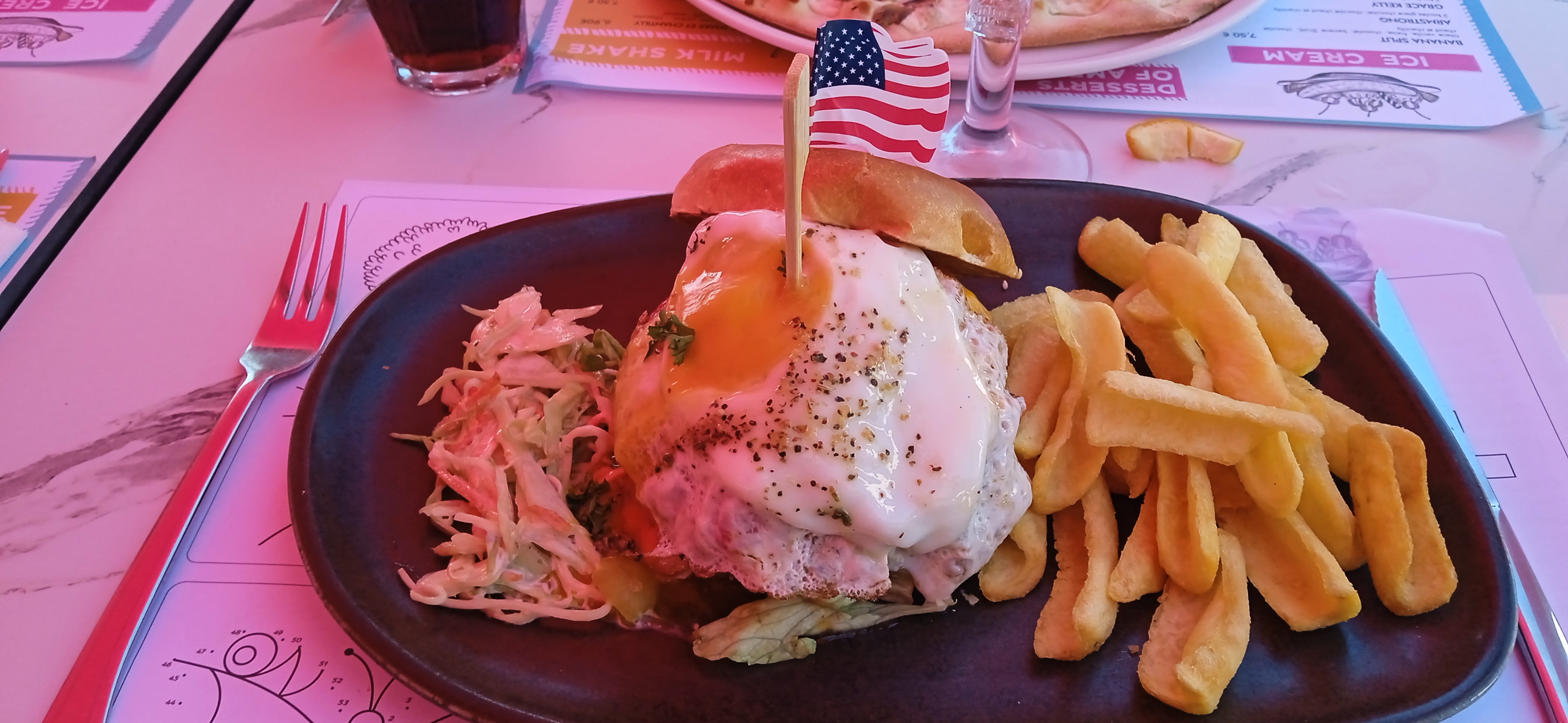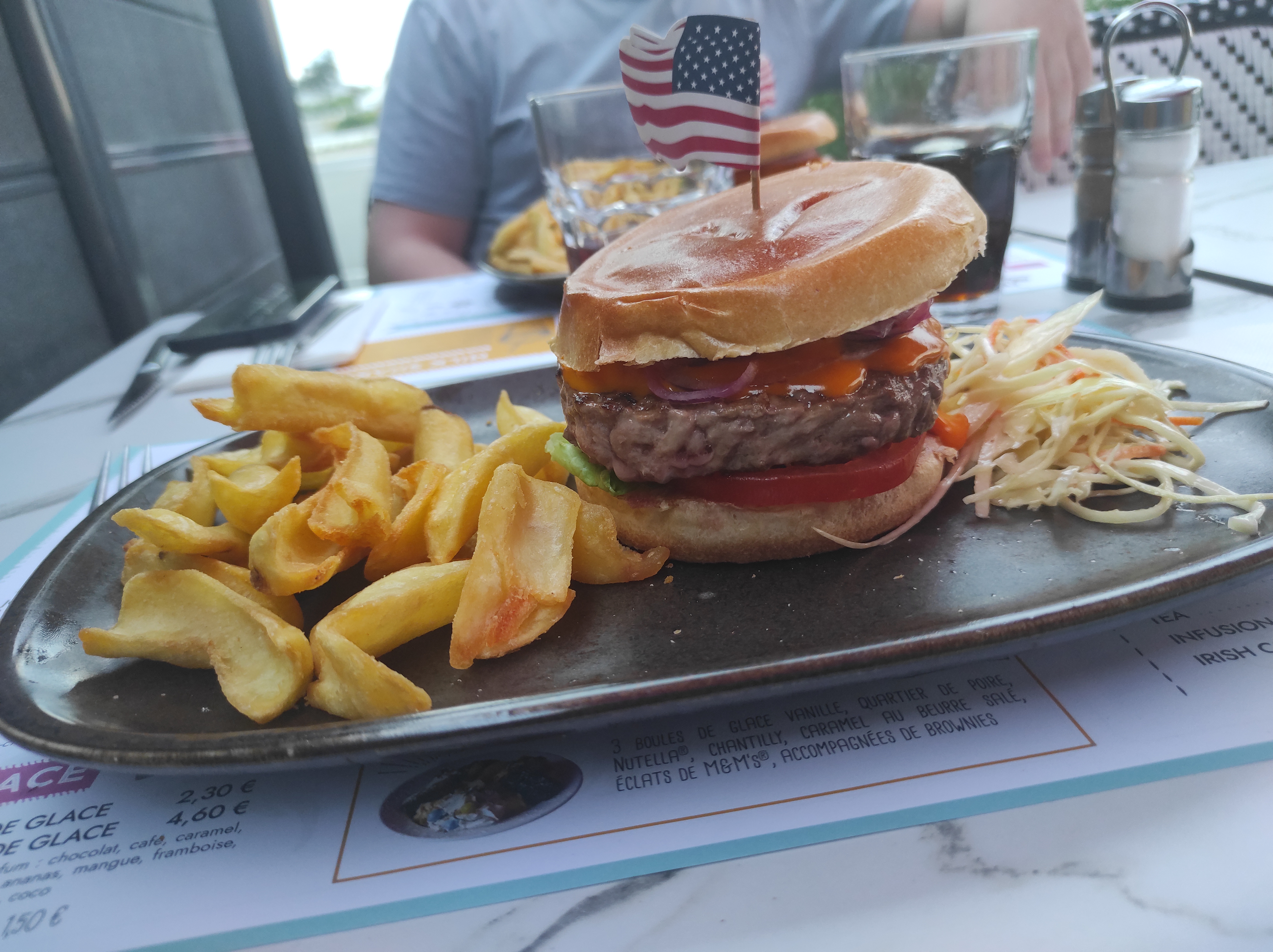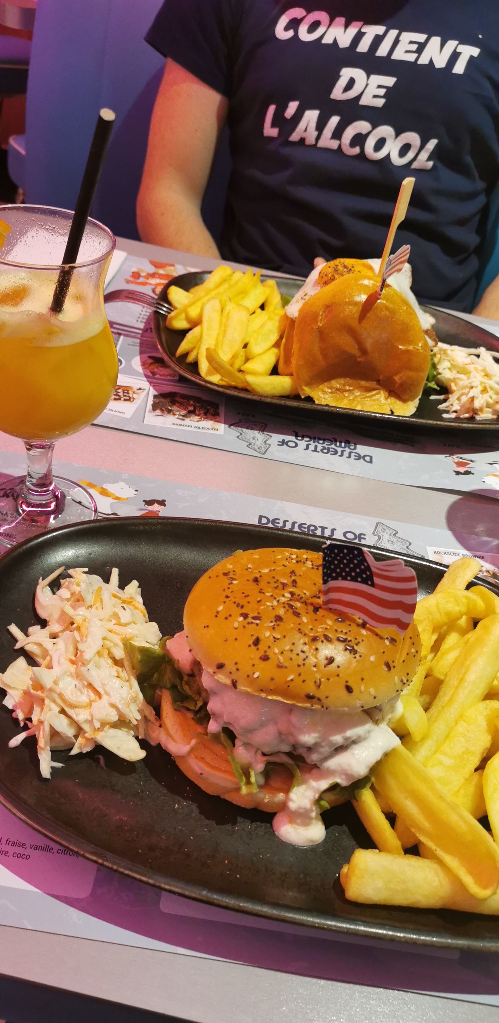 C'est la première fois que je pouvais manger mon assiette lol. Terrasse très agréable, déco ambiance US très réussie.