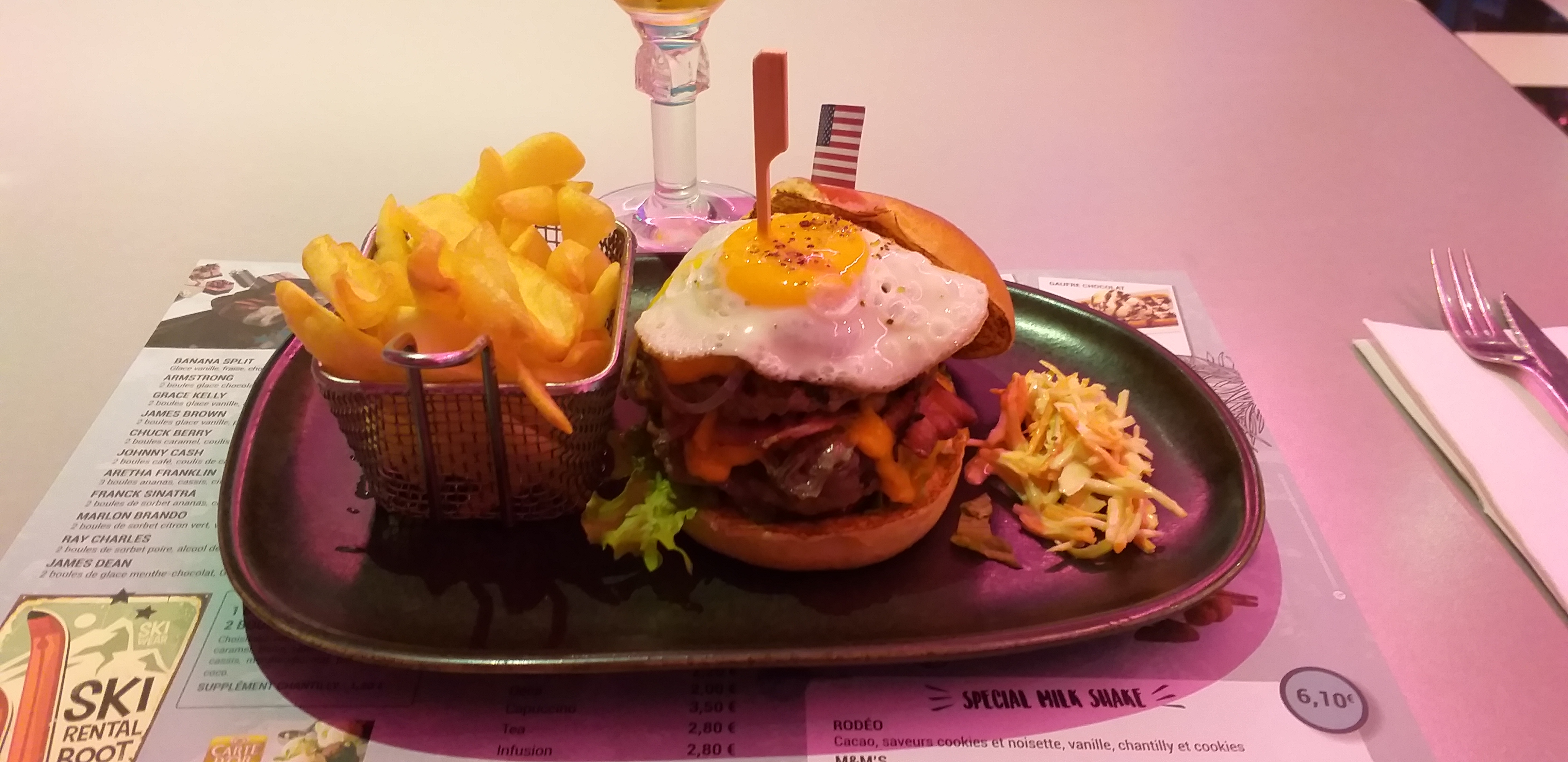 Très joli cadre des années 50 ultra coloré. On s’attend à voir Sandy et Danny rappliquer. Plats corrects. Ce n’est pas de la grande cuisine mais ce n’est pas le concept. Serveurs très souriants et disponibles malgré l’affluence. On reviendra certainement l’année prochaine pour goûter d’autres plats.