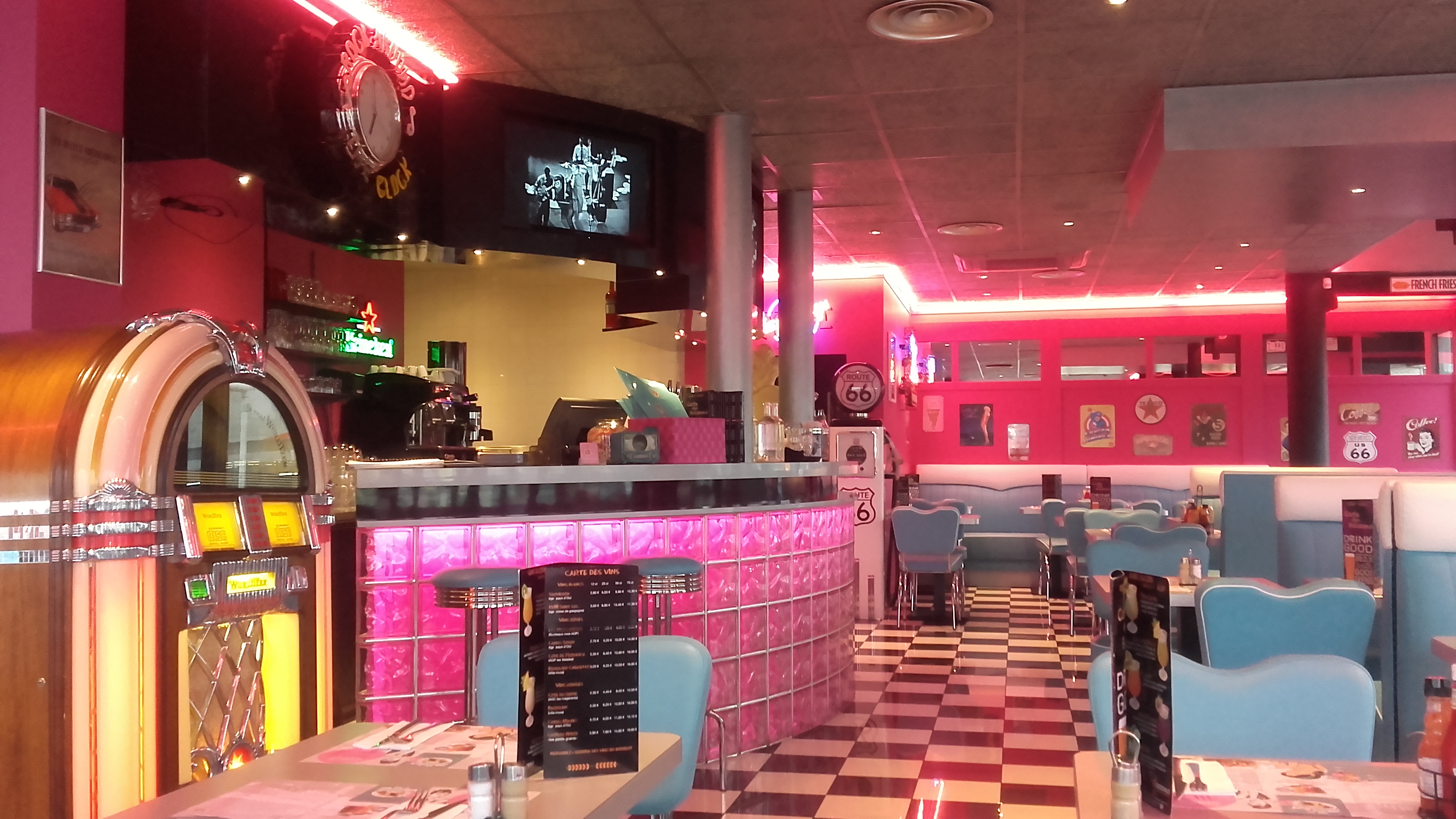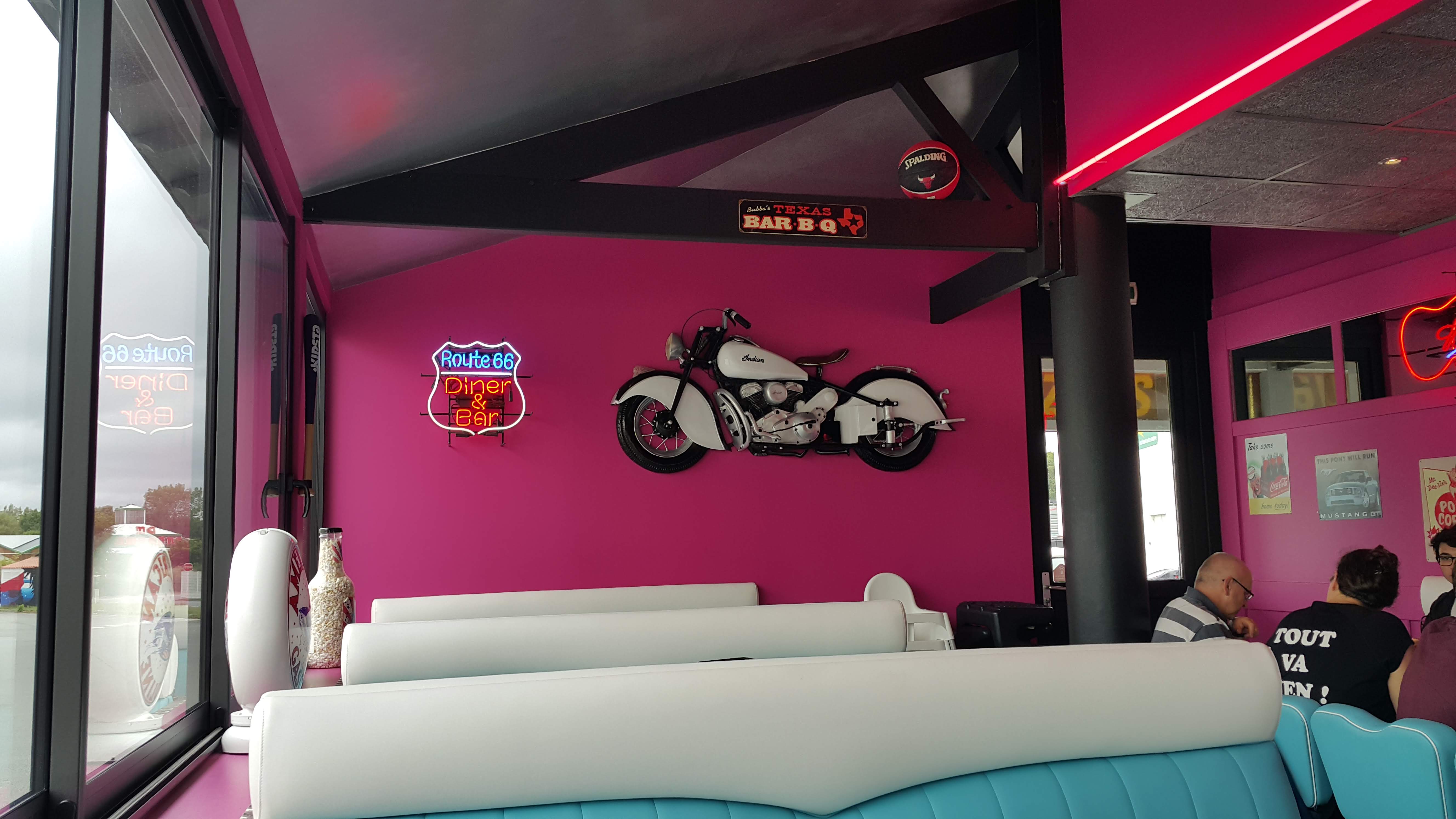 Le resto et très route 66. Les couleurs sont vives et la déco et rétro. Pour manger régulièrement là-bas, la viande est très bonne et j'apprécie beaucoup leurs pizzas. Ne vous attendez pas à des repas diététique mais à des assiettes bien pleines! L'accueil et jovial et les jeunes serveuses sympas. Il y a peu de temps attente.
