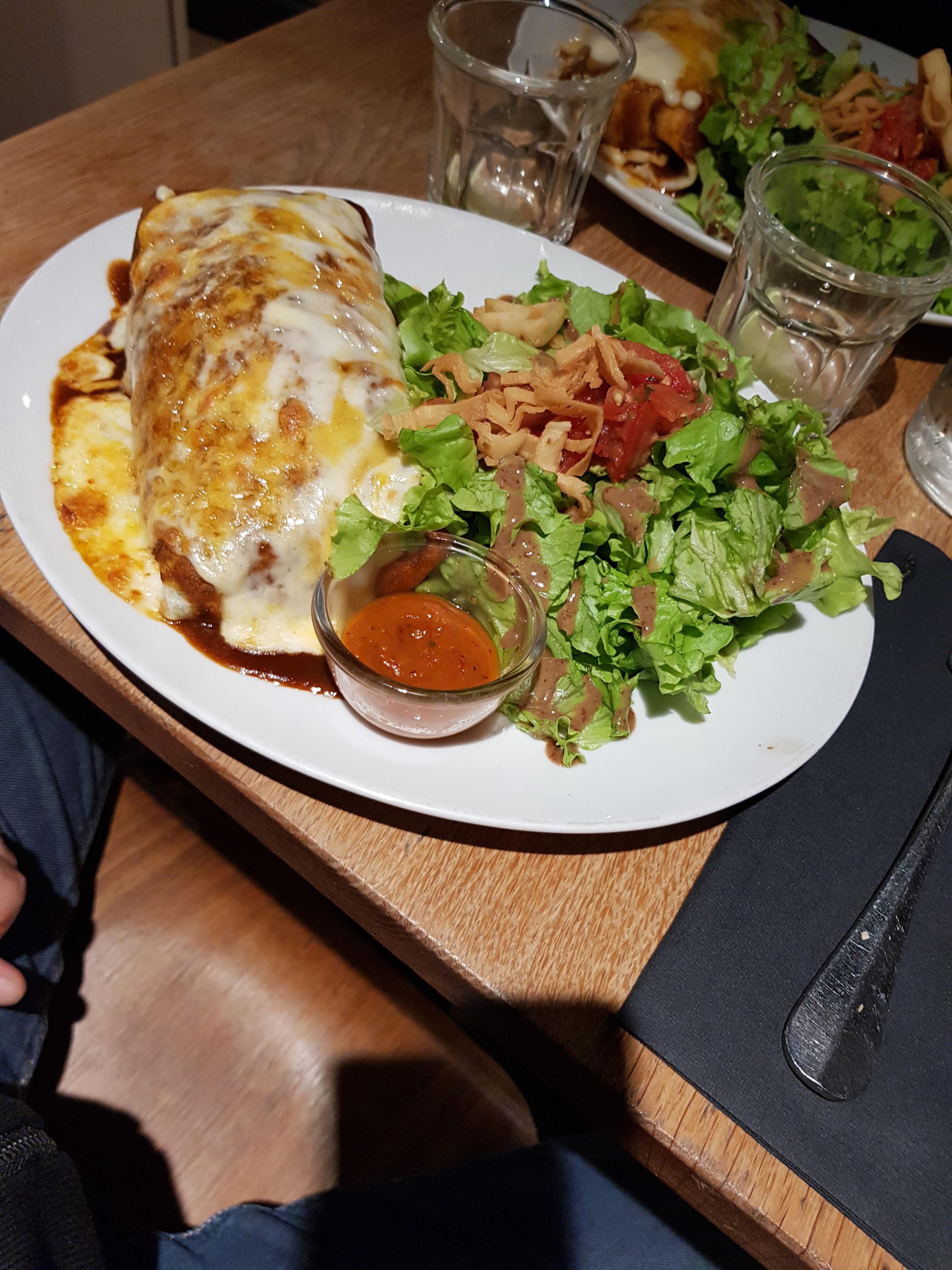 Des burritos qui ne doivent pas être le highlight de la carte au vu de leur absence de goût... un amas de riz, des haricots noirs, une viande très cuite sans assaisonnement distinctif (le boeuf a le meme gout que le porc), dans une galette aspergée d'une sauce (tomate ?) et de fromage fondu. Pas de cruditites, pas de sauce, ca ne sent rien. Finalement, le meilleur dans cette assiette de burrito c'est la salade verte à coté qui est tres abondante.