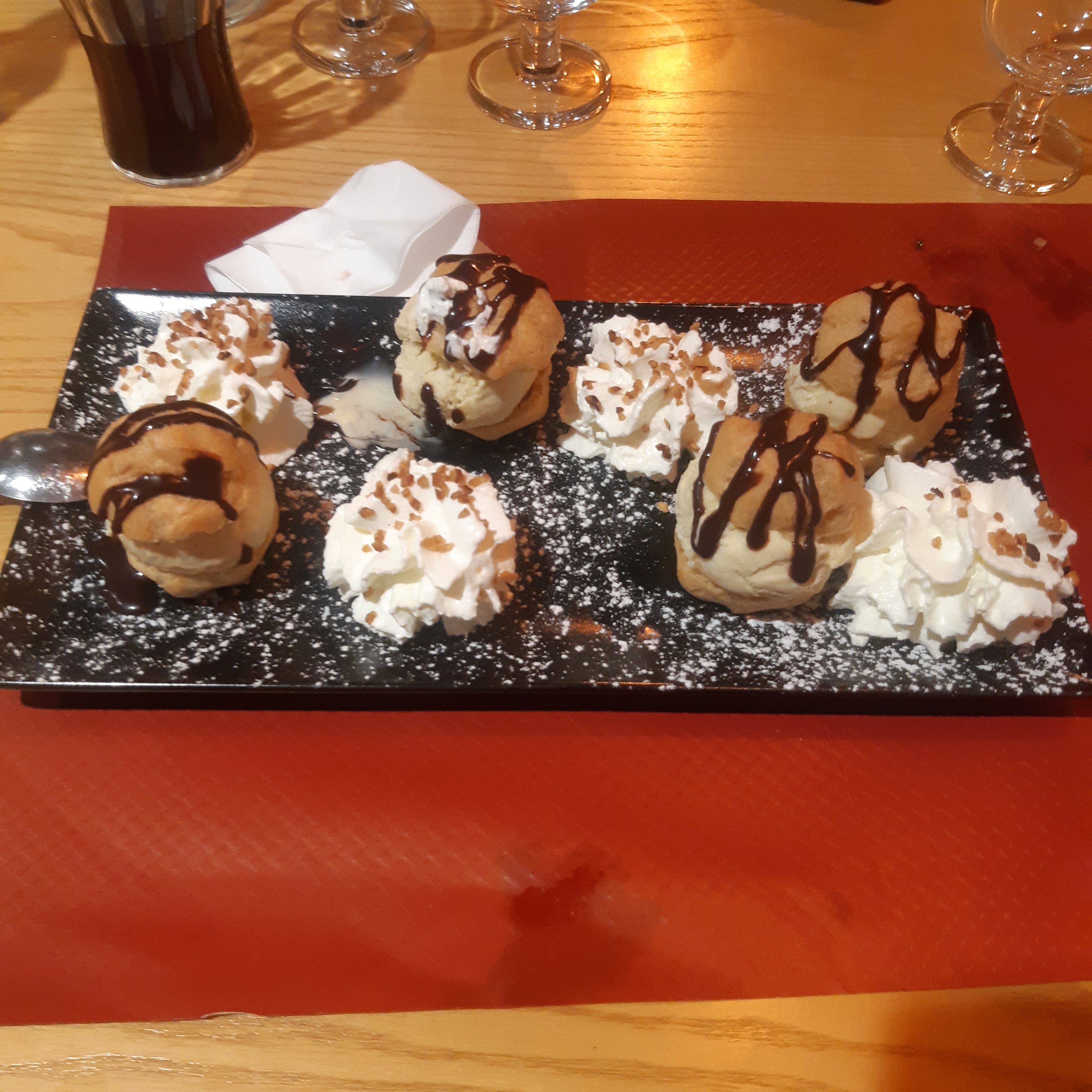 Dans l ensemble très bonne cuisine cependant grosse déception pour les desserts tiramisu au melon très bon mais déçu qua'd on s attend à un vrai tiramisu c est dommage de ne pas le préciser. Et dommage également de tout faire maison sauf les choux des profiteroles qui sont de vrais papier mâché. Pour les plats rien à redire très bons